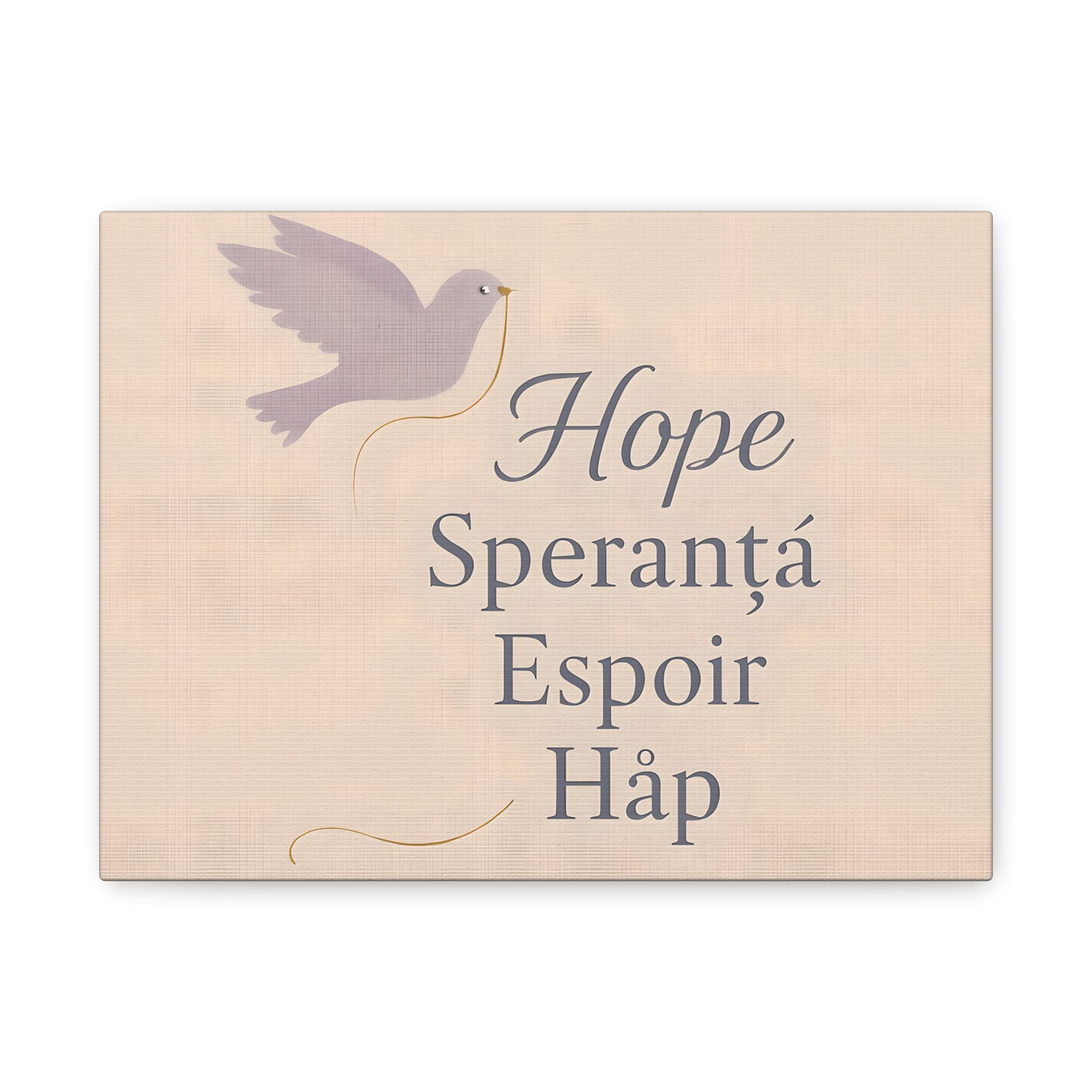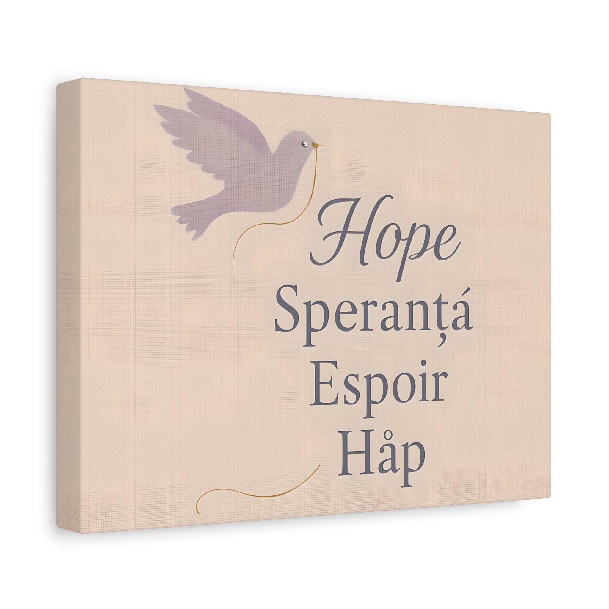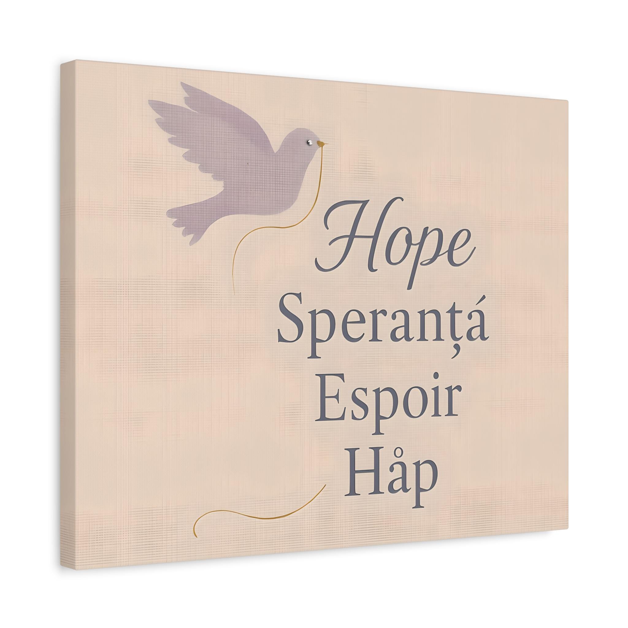 This elegant canvas wrap features the word Hope beautifully written in English, Romanian (Speranță), French (Espoir), and Norwegian (Håp). A soft lavender dove soars across the top, holding a golden thread that connects each word like an embroidered stitch of unity and strength.