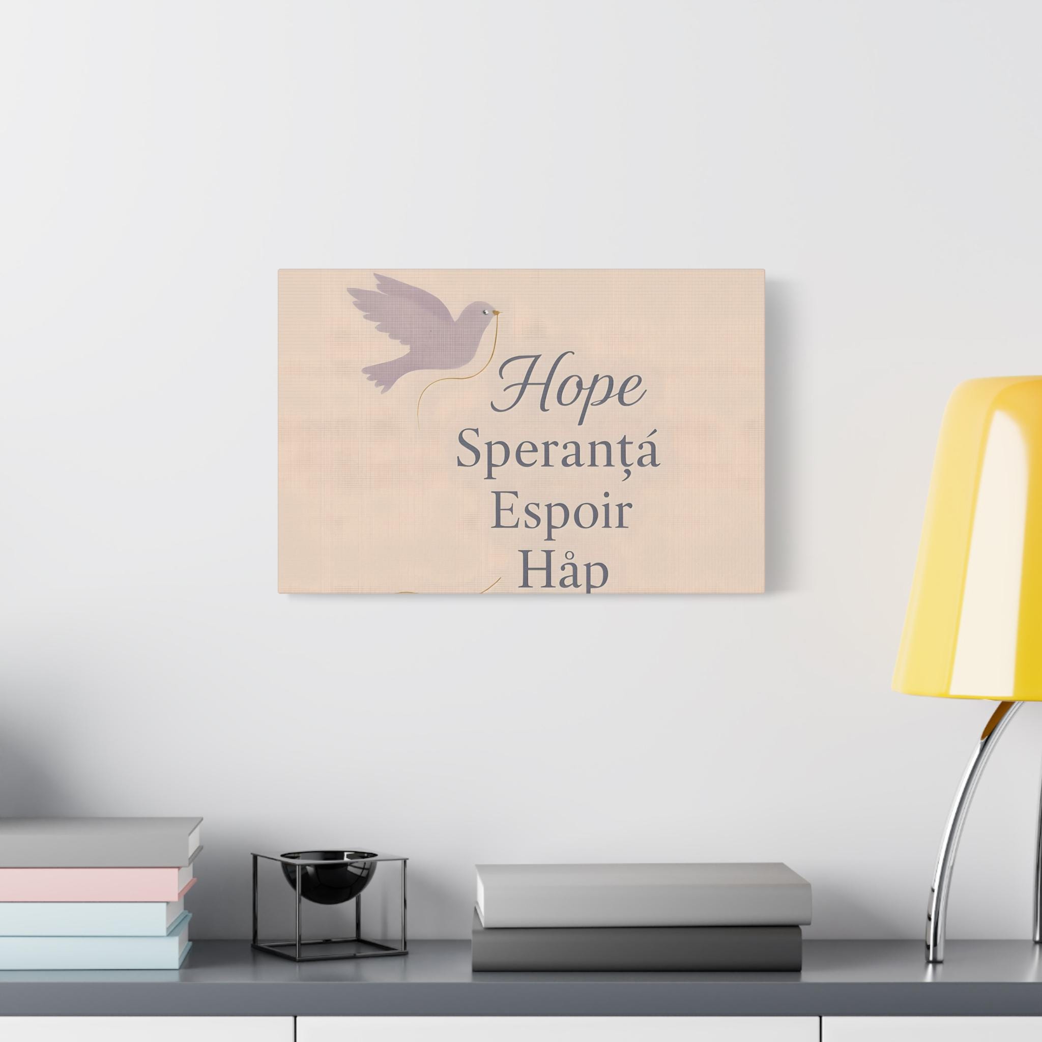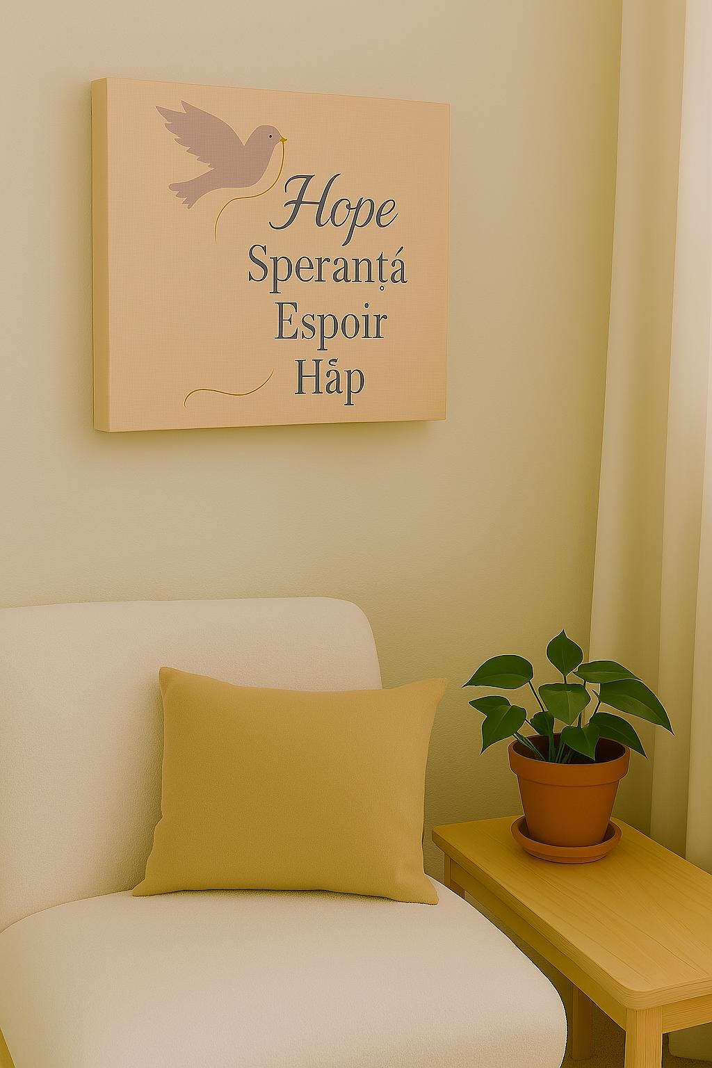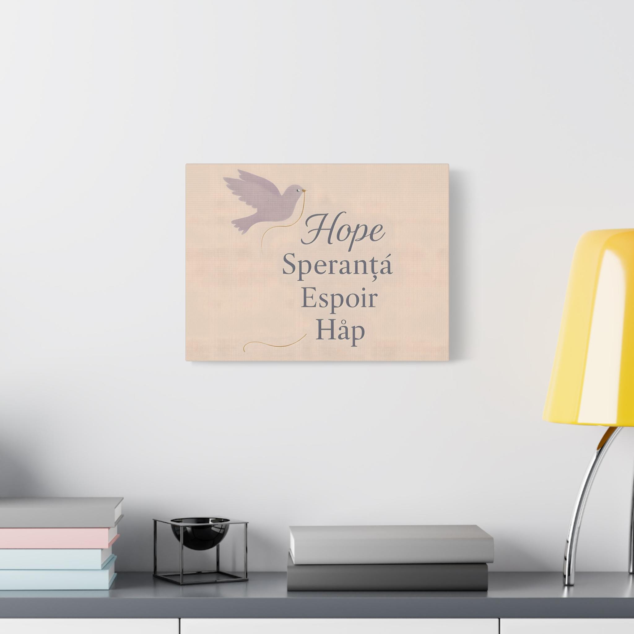 This elegant canvas wrap features the word Hope beautifully written in English, Romanian (Speranță), French (Espoir), and Norwegian (Håp). A soft lavender dove soars across the top, holding a golden thread that connects each word like an embroidered stitch of unity and strength.