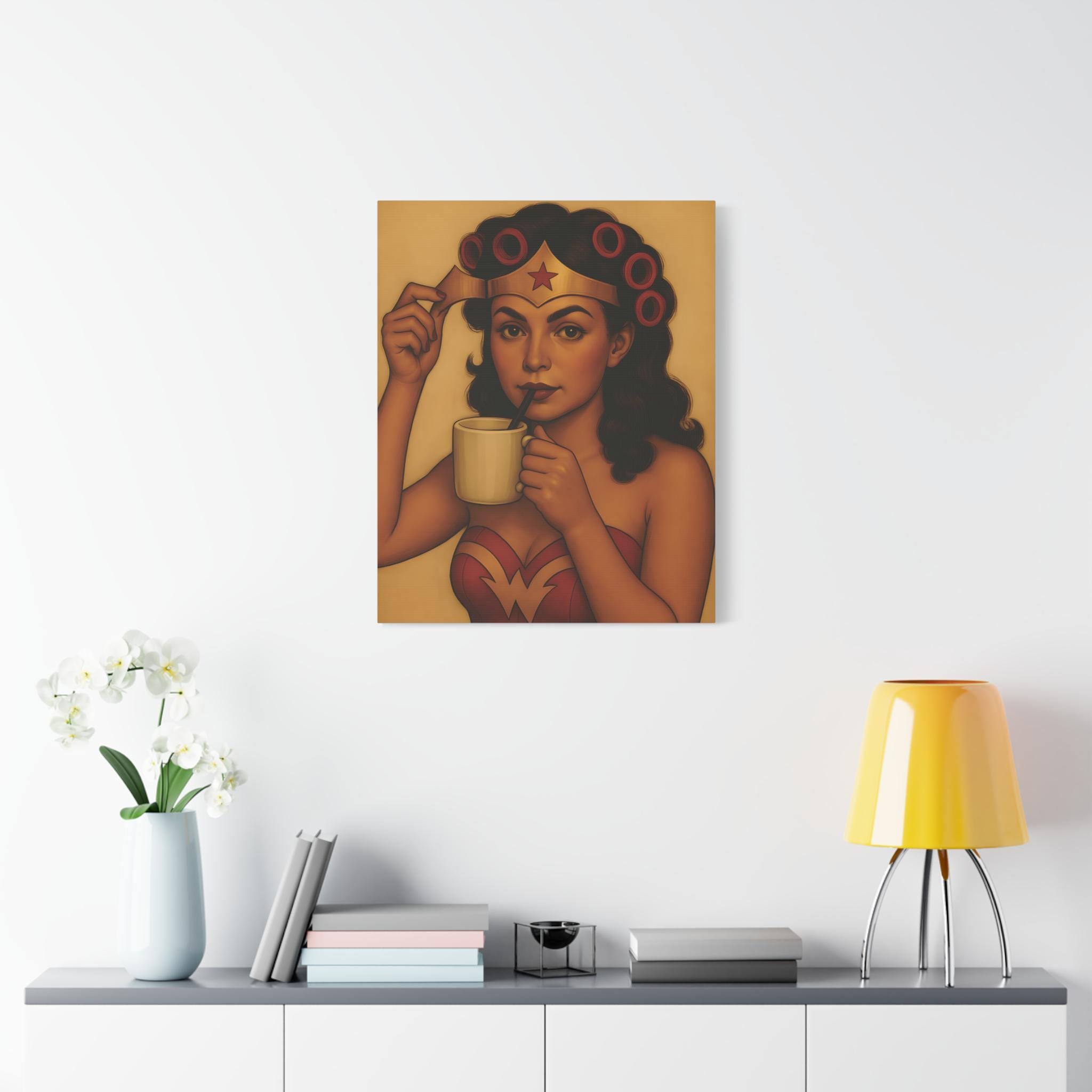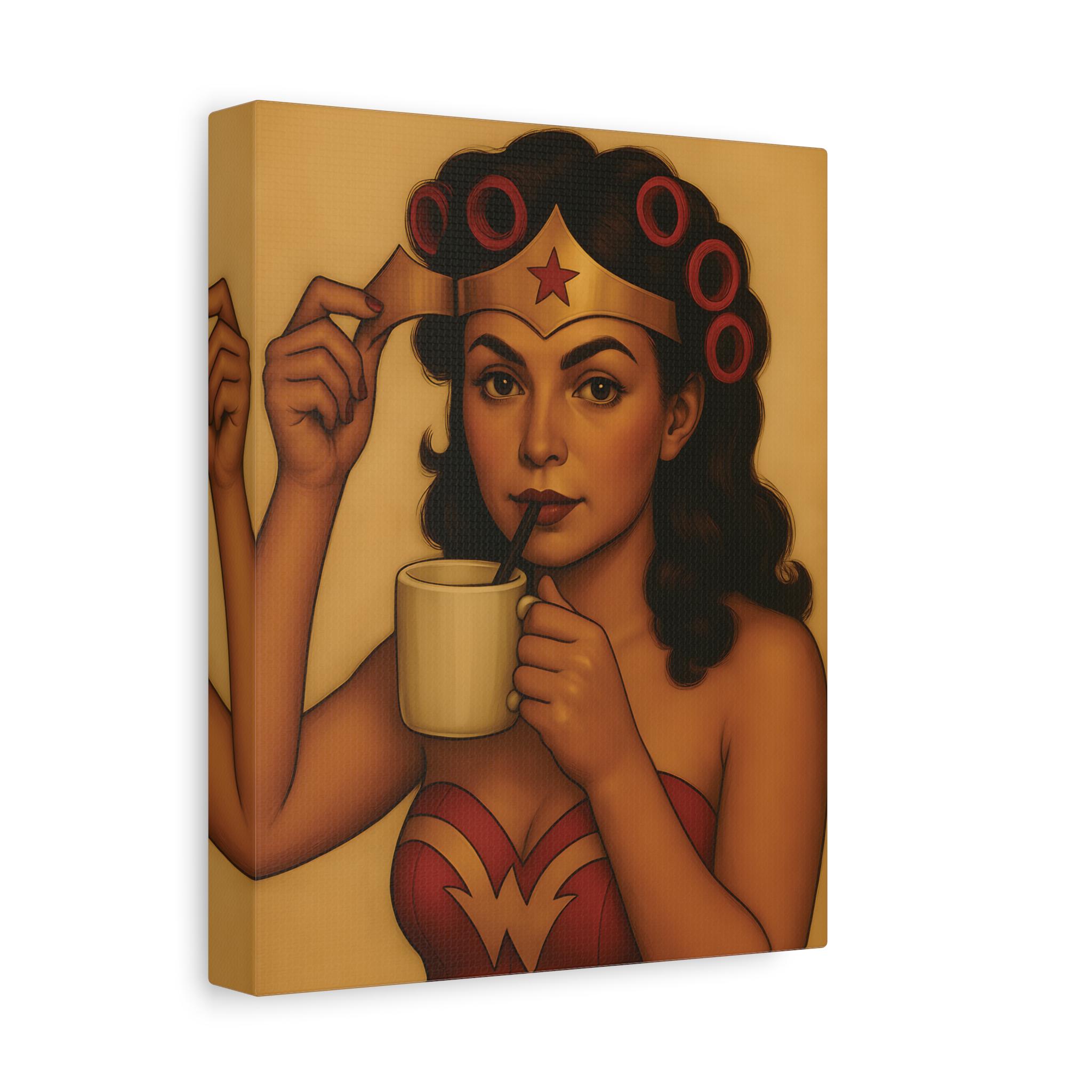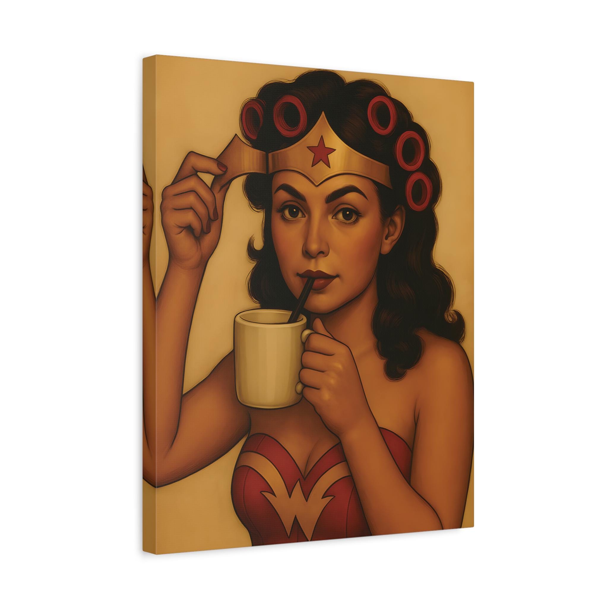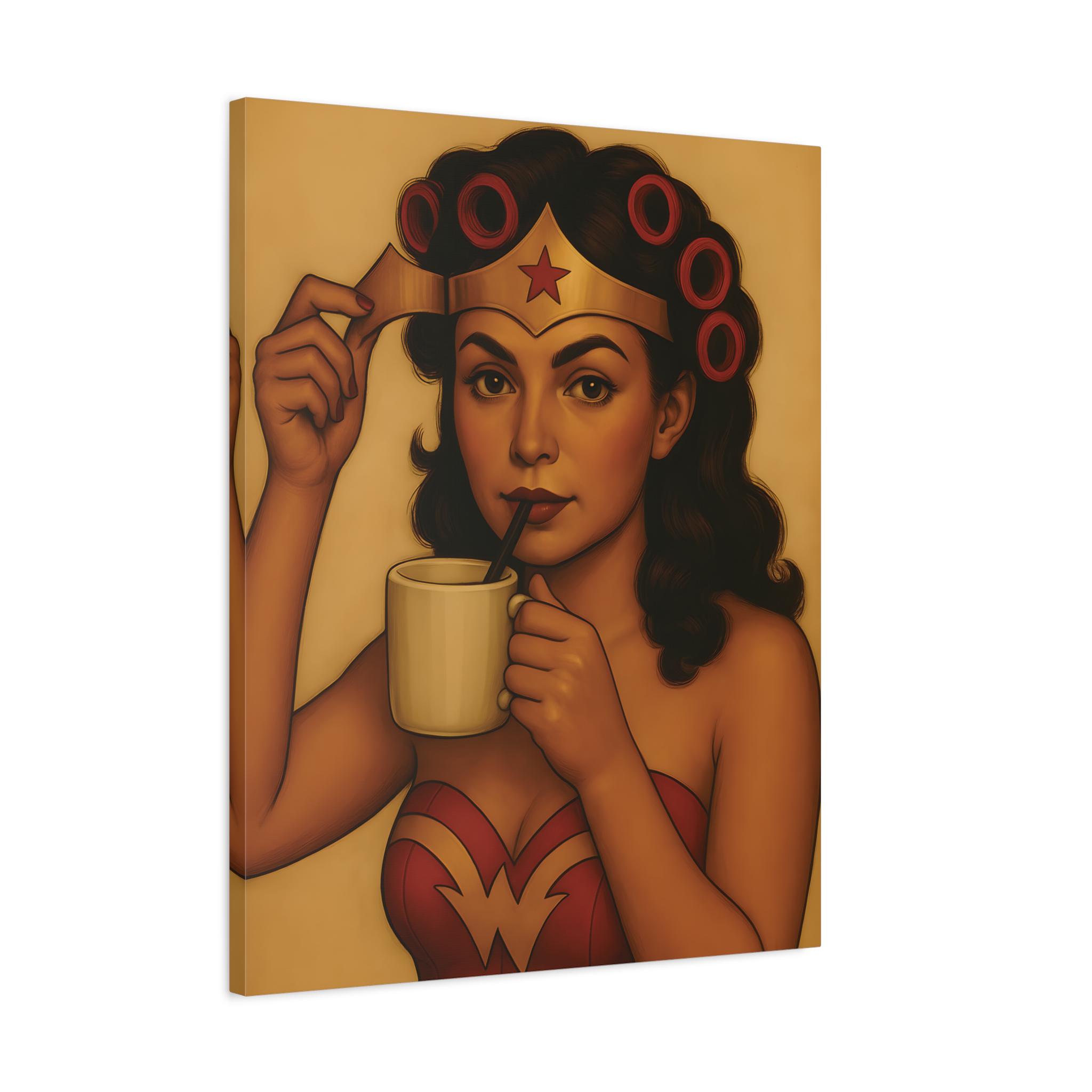 Add a dose of humor and empowerment to your space with this vintage comic-inspired canvas print. Featuring a Wonder Woman-style character rocking curlers, bold makeup, and a steaming cup of coffee, this artwork captures the relatable magic of being an “Everyday Goddess.” With rich nostalgic tones and subtle sass, it’s perfect for feminist art lovers, comic book fans, or anyone who needs a reminder that strength comes in all forms—even with a messy bun and caffeine in hand.