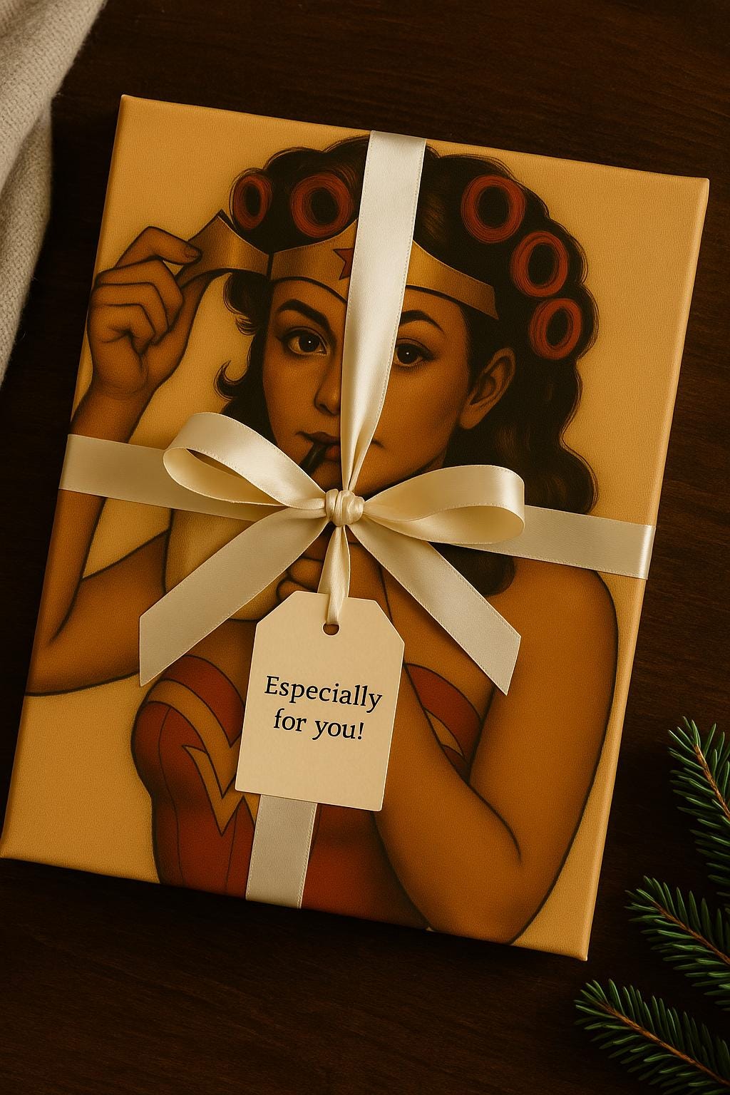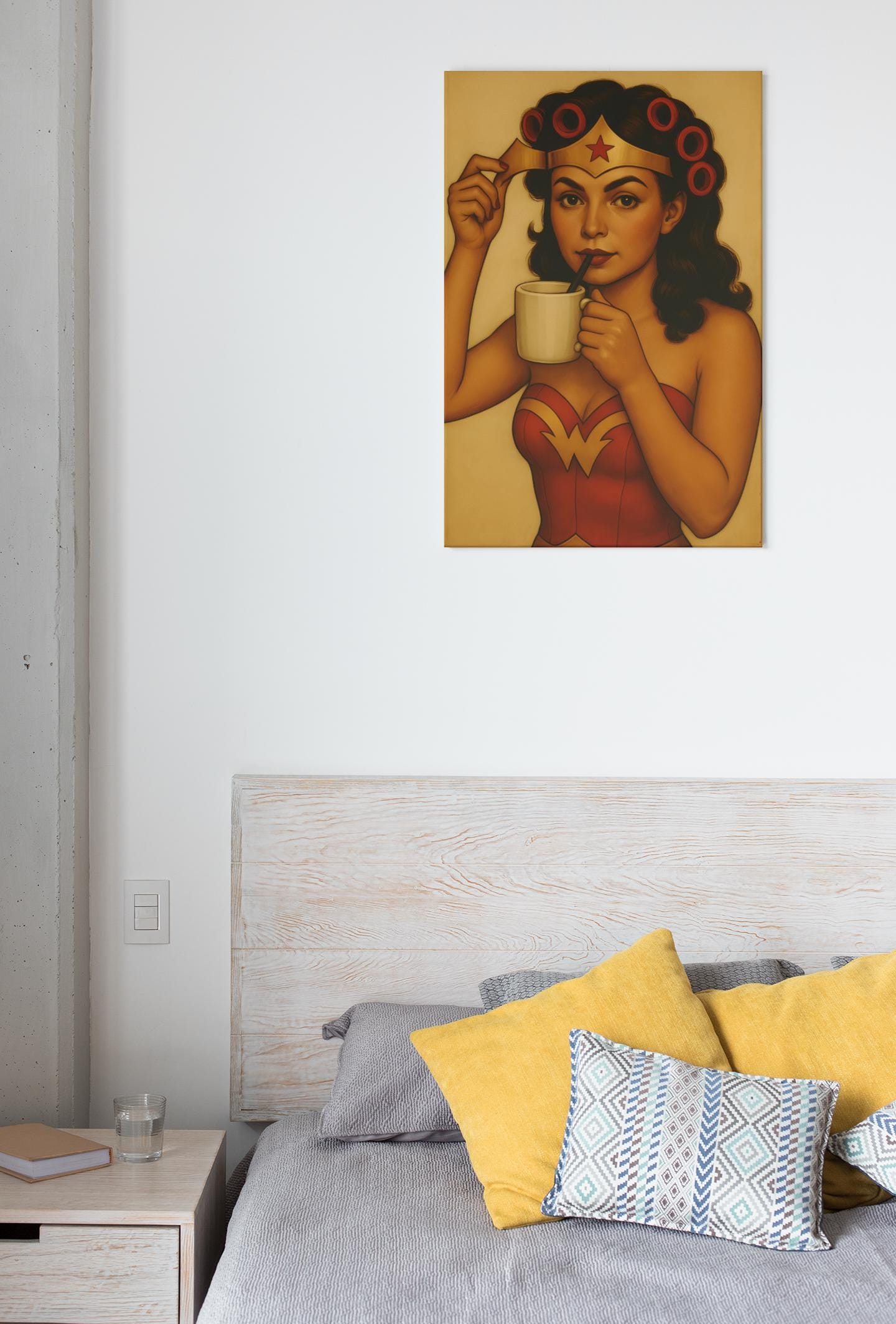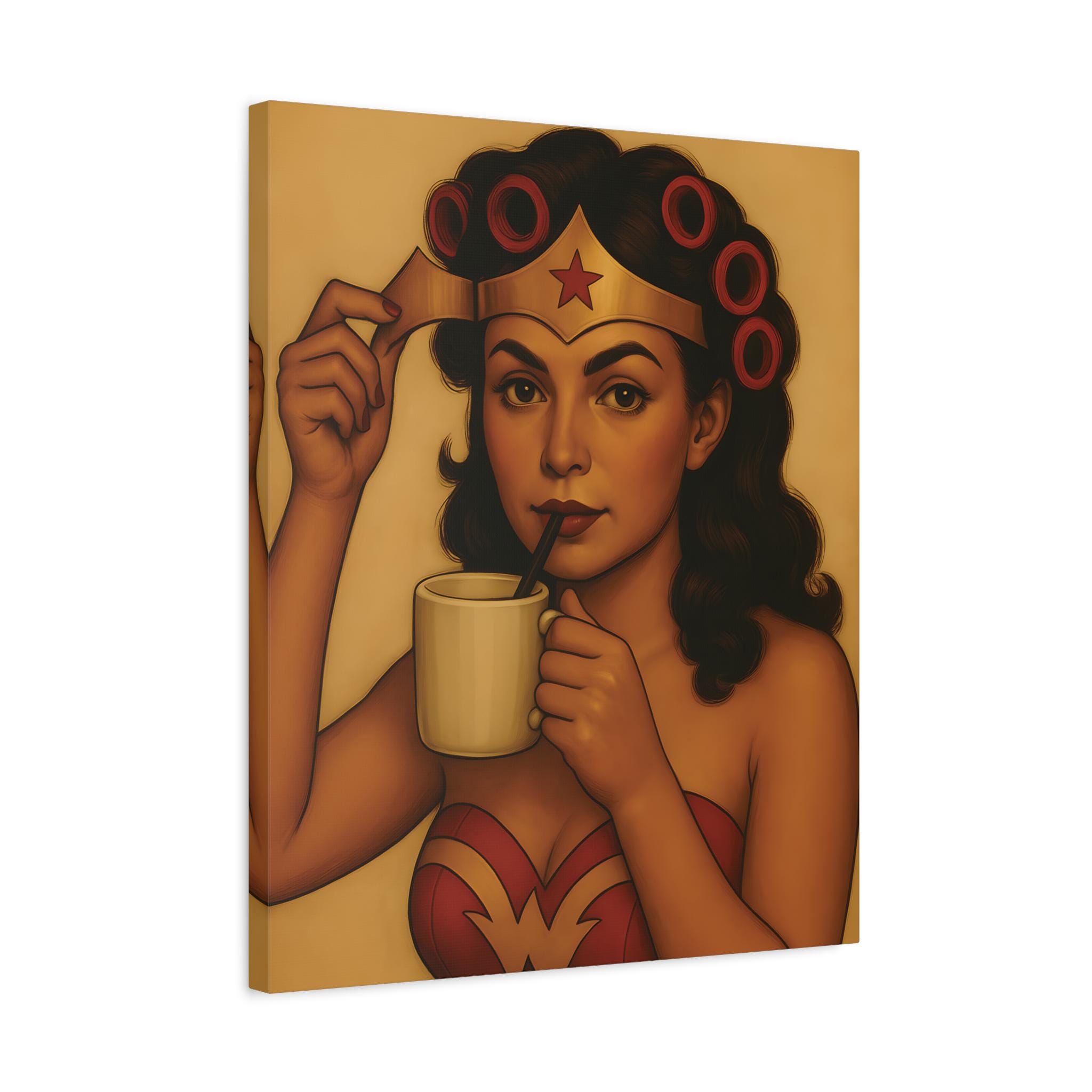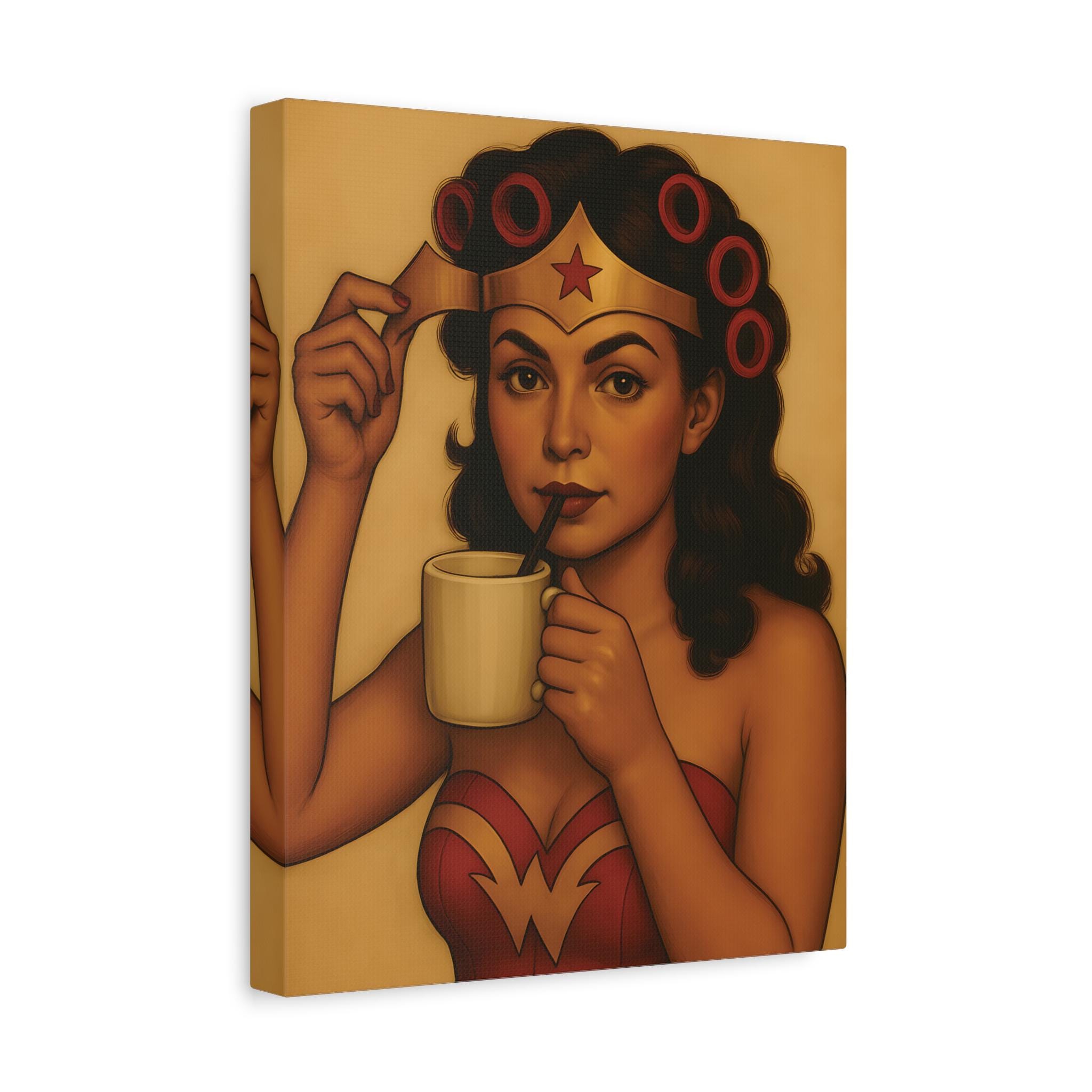 Add a dose of humor and empowerment to your space with this vintage comic-inspired canvas print. Featuring a Wonder Woman-style character rocking curlers, bold makeup, and a steaming cup of coffee, this artwork captures the relatable magic of being an “Everyday Goddess.” With rich nostalgic tones and subtle sass, it’s perfect for feminist art lovers, comic book fans, or anyone who needs a reminder that strength comes in all forms—even with a messy bun and caffeine in hand.