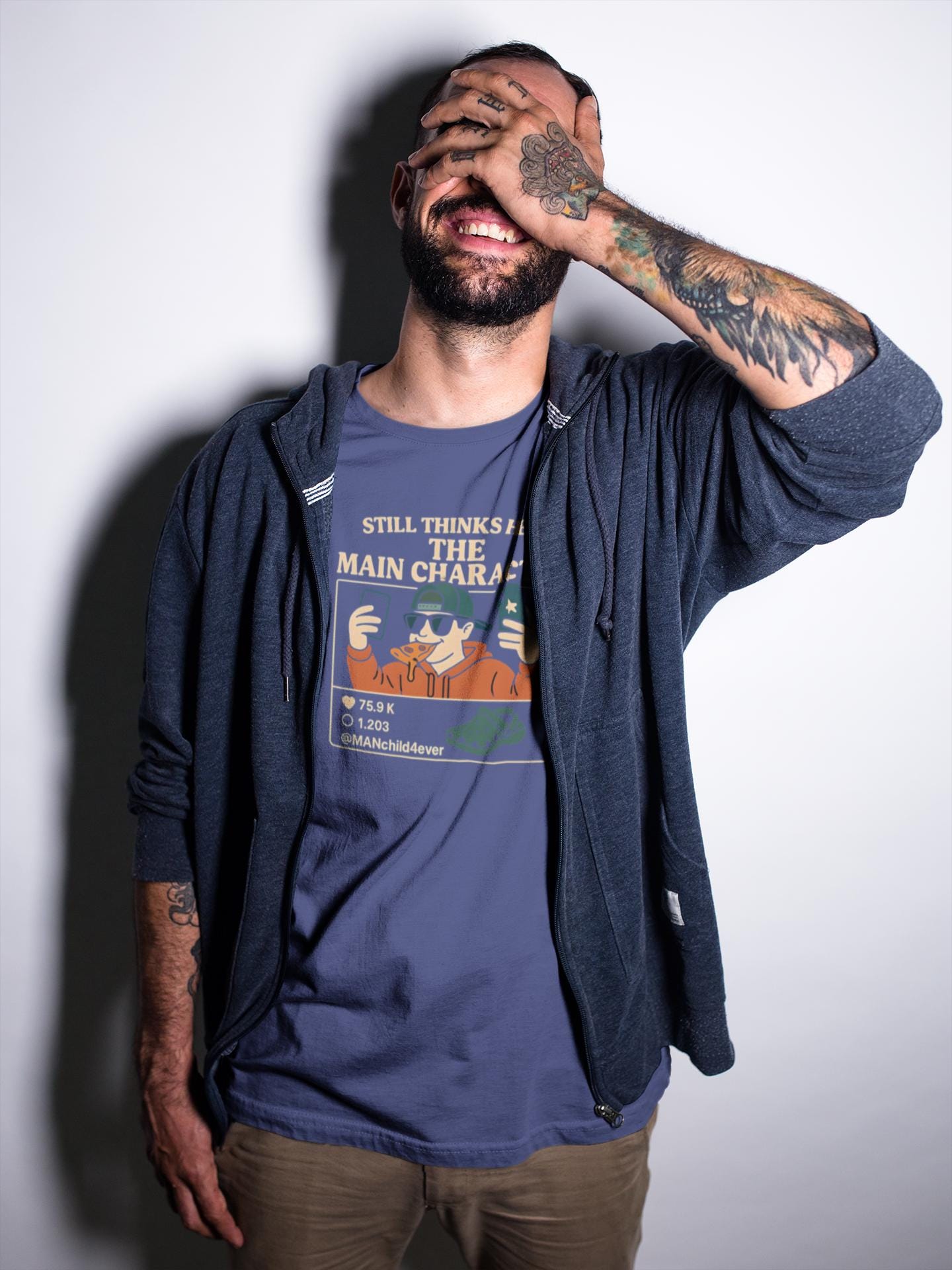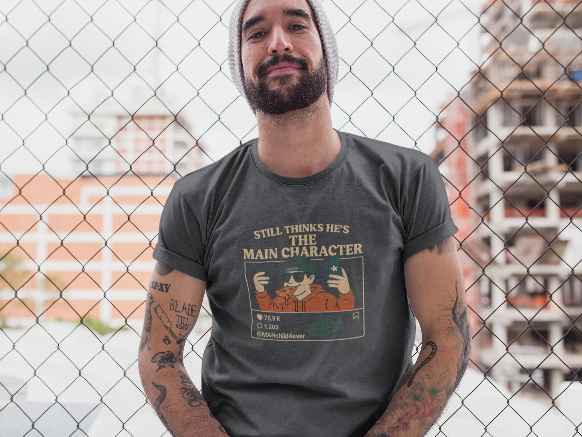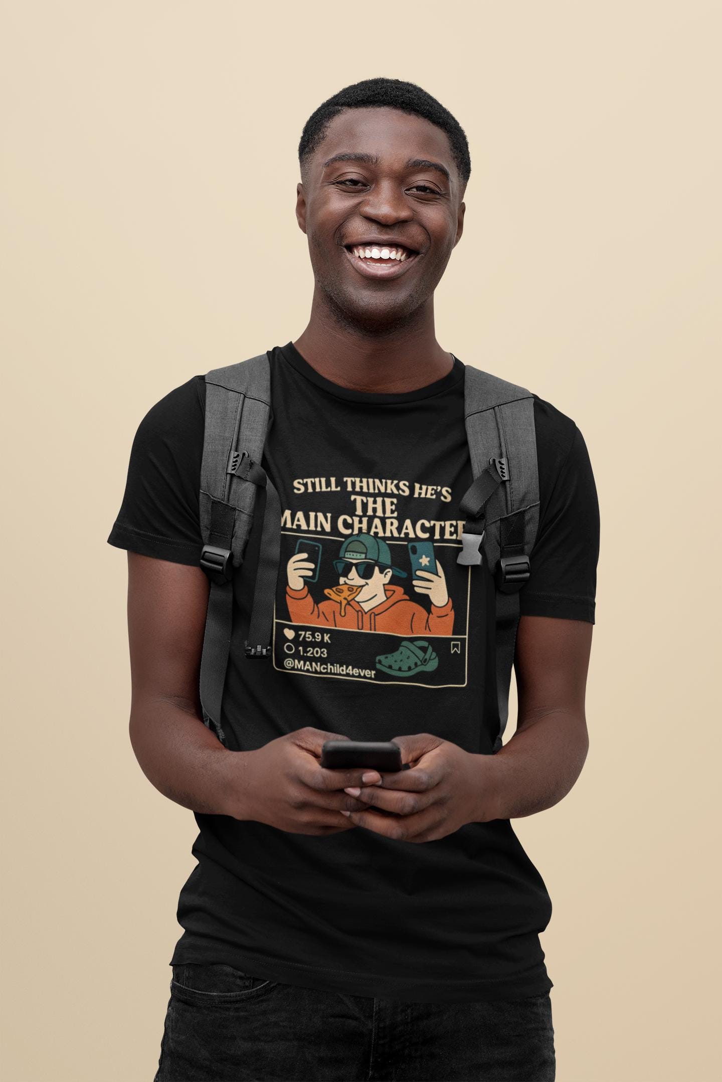 This “Still Thinks He’s the Main Character” tee is the ultimate callout shirt — ideal for the guy who still posts thirst traps like it's 2015, argues with teens online, or thinks Crocs are formalwear.