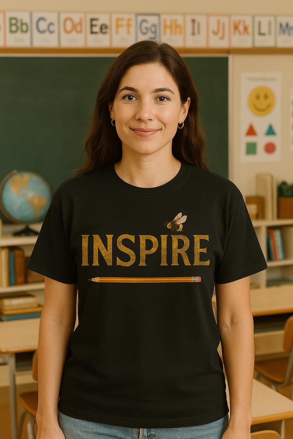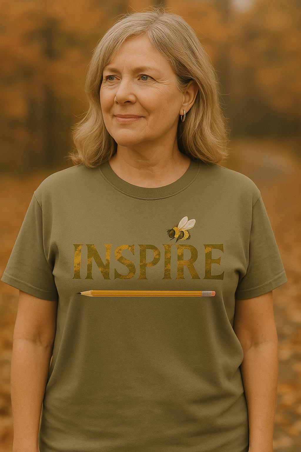 Design: Floral “INSPIRE” lettering with a pencil and bee motif