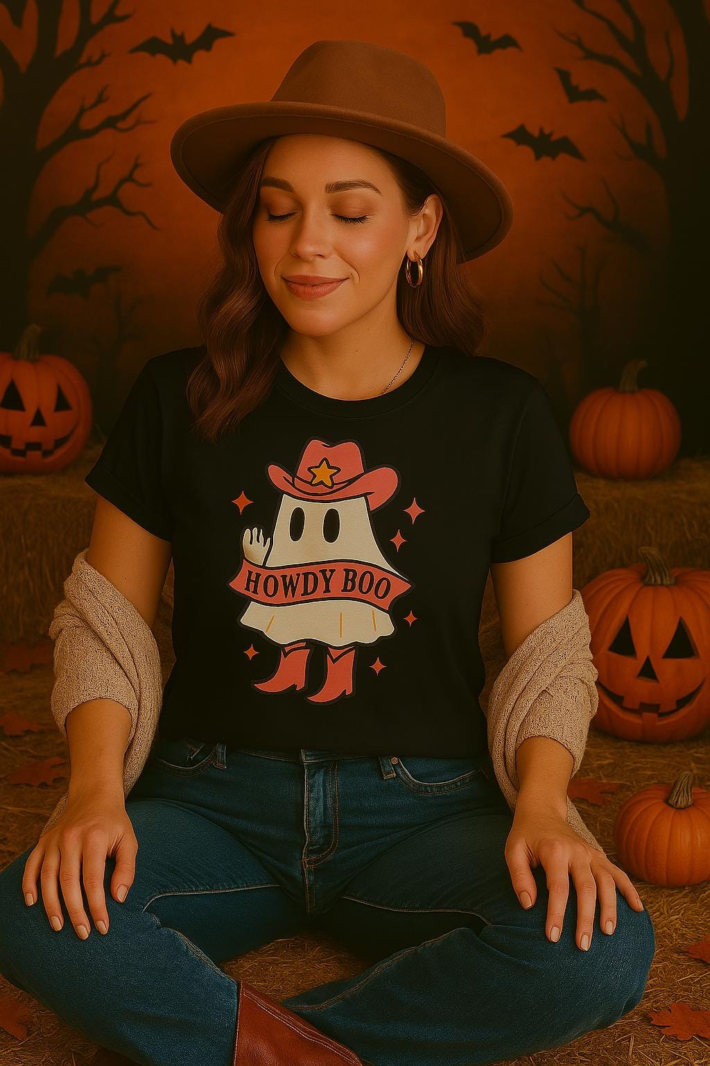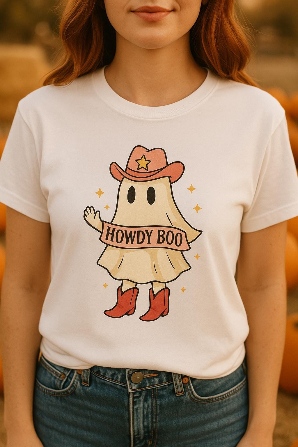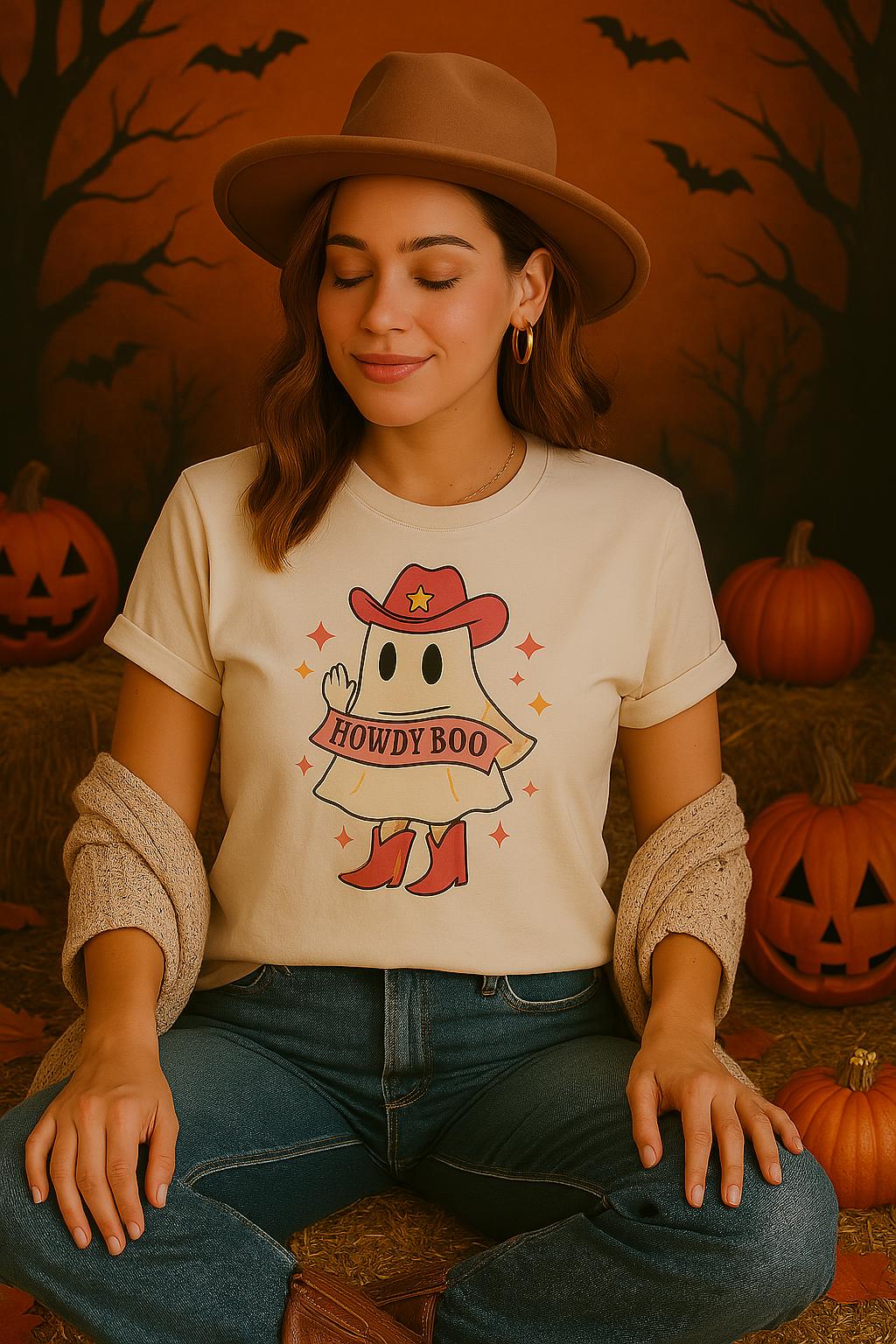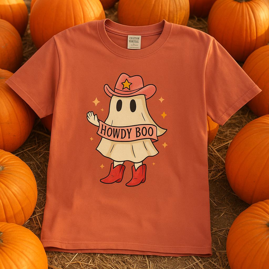 The design showcases an illustrated ghost in a pink cowgirl hat and boots, holding a banner that reads “Howdy Boo.” Bright stars and warm tones add a fun western twist to your fall fits.