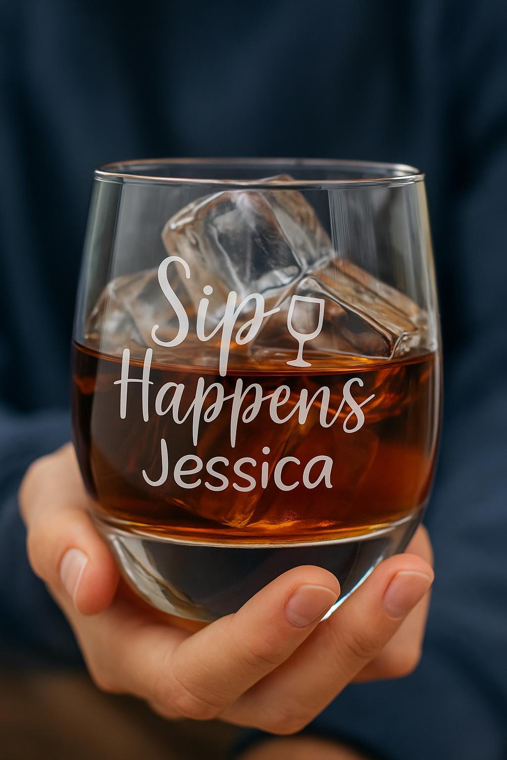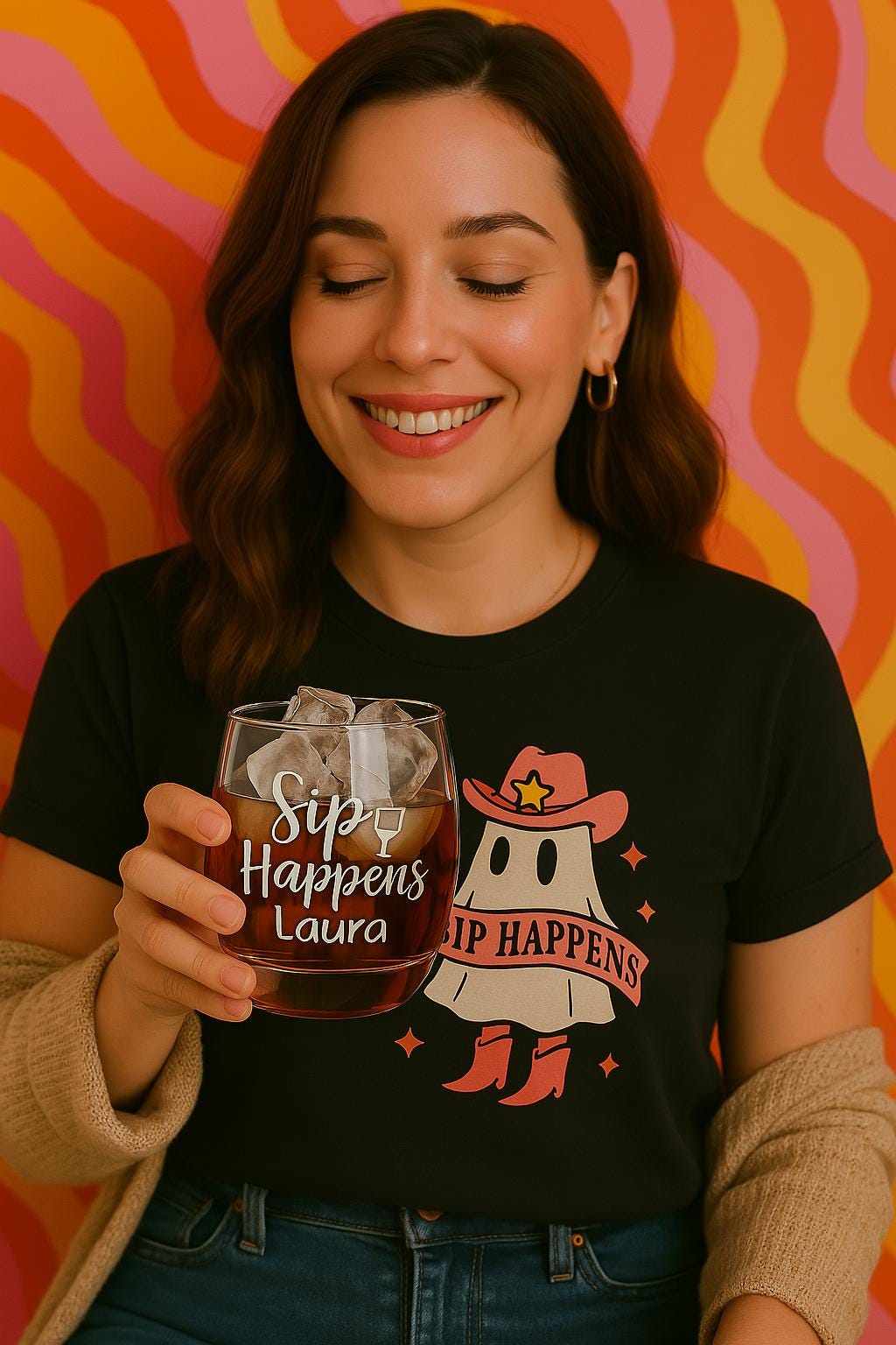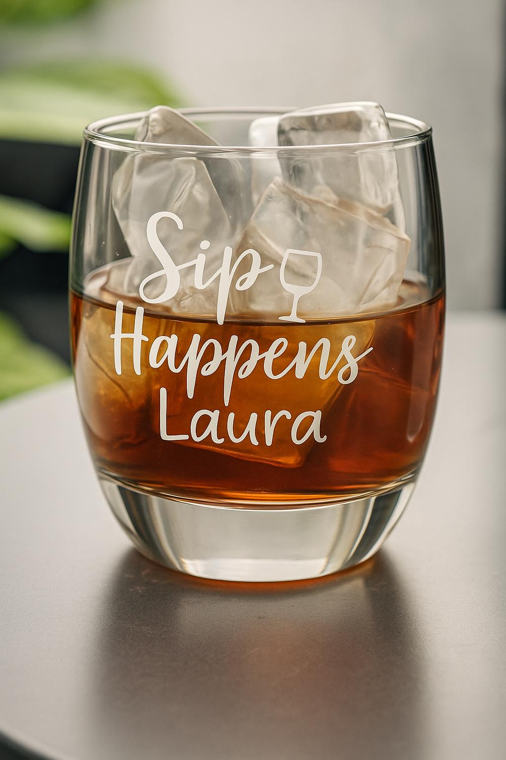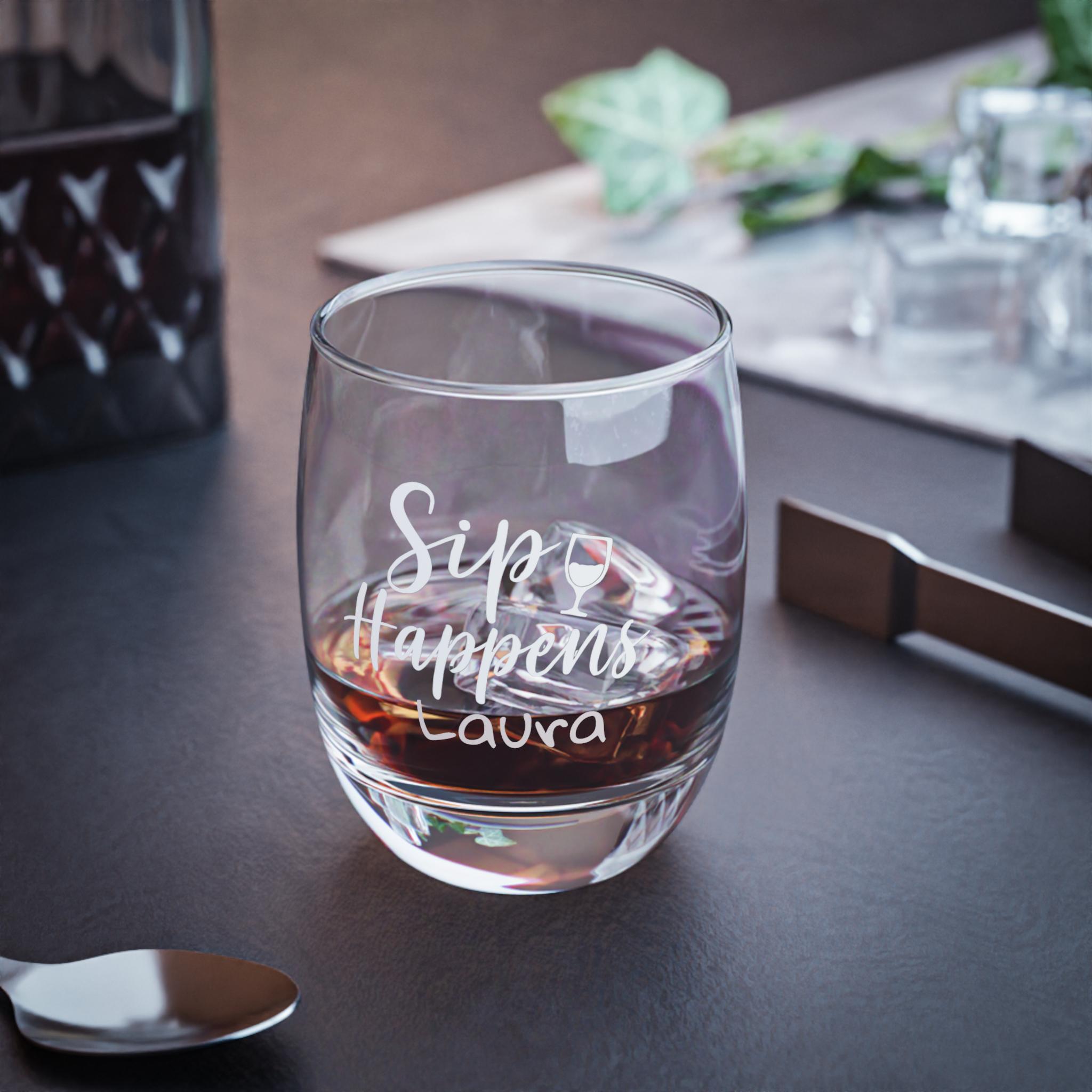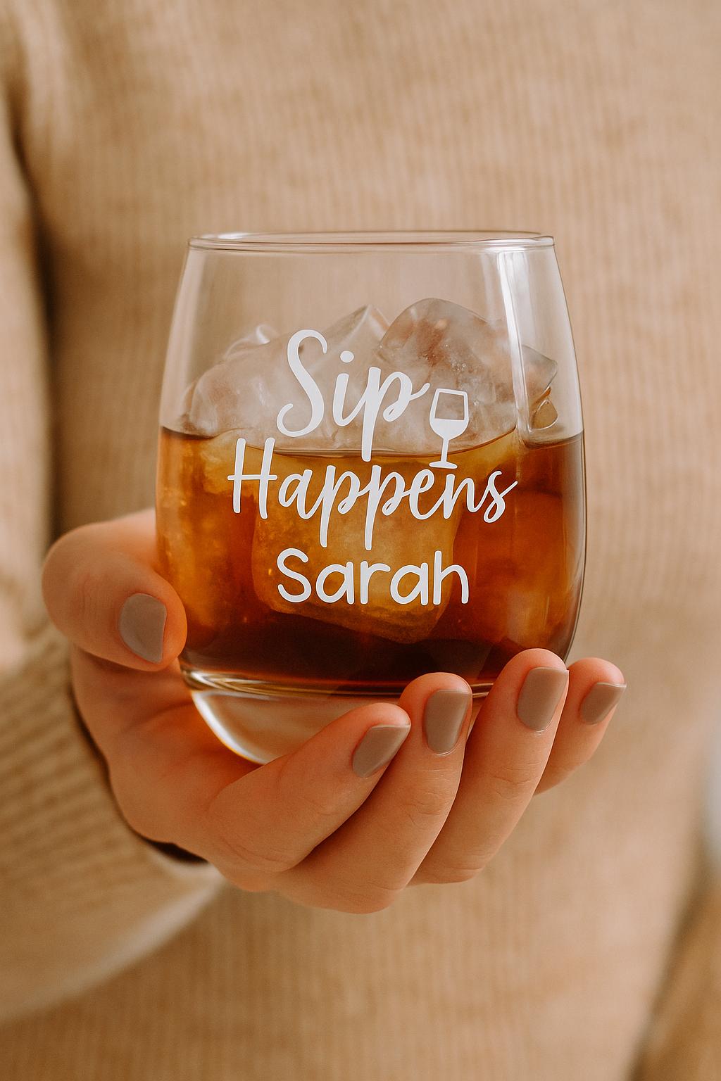 Sip Happens Personalized Whiskey Glass – Custom Name Wine Glass 6 oz – Funny Gift for Her, Bridesmaids, Coworkers, or Moms.