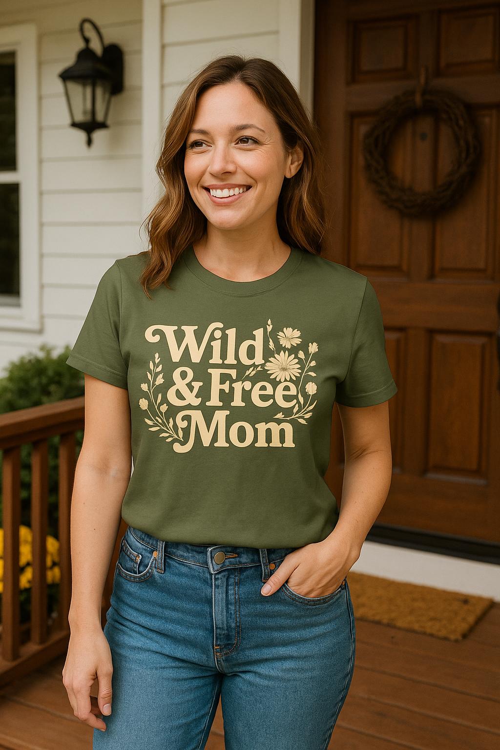 Wild & Free Mom T-Shirt: Boho Floral Graphic Tee - Military Green