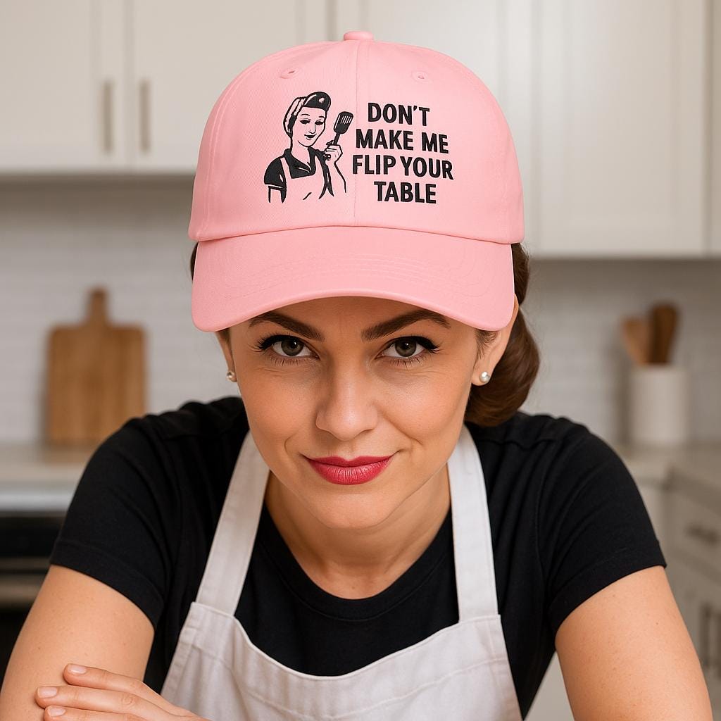 Created with help from AI and fueled by generations of unapologetic women with spatulas and opinions. This hat’s not just stitched—it’s statemented.