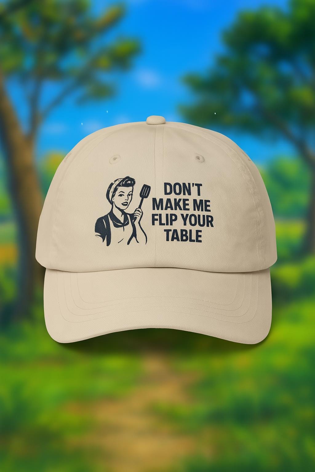 This pink embroidered dad cap brings big apron energy with a whole lot of attitude. Featuring a retro-style housewife holding a spatula like a mic drop, this hat is for every kitchen diva, brunch queen, or mom with zero time for nonsense.