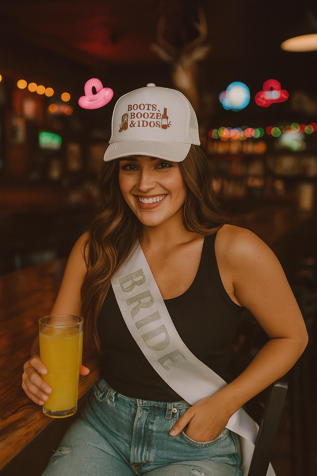 The “Boots, Booze & I Do’s” trucker hat is here to make your fall bachelorette party the rootinest, tootinest good time of the season.
