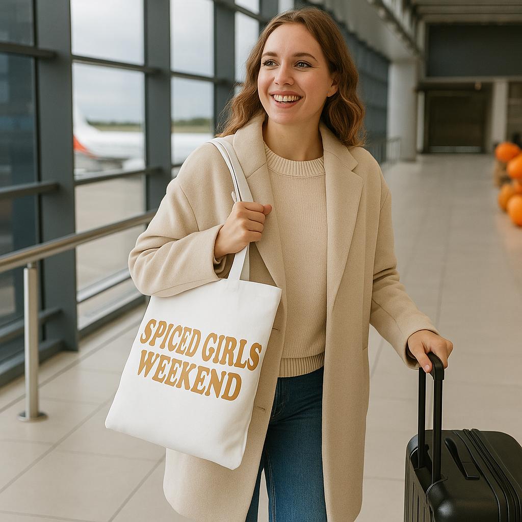 Our Spiced Girls Weekend personalized tote bag is the must-have carryall for cozy autumn getaways, pumpkin patch hopping, wine tasting, or that iconic cabin trip. Made from 100% durable polyester canvas, it’s roomy enough for all your weekend essentials—and totally Instagram-worthy.