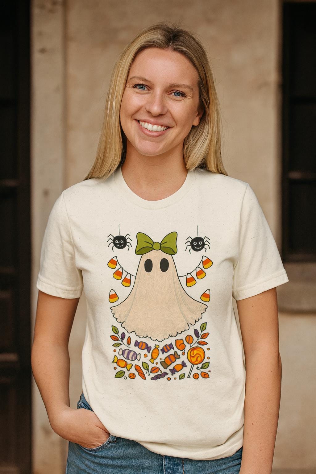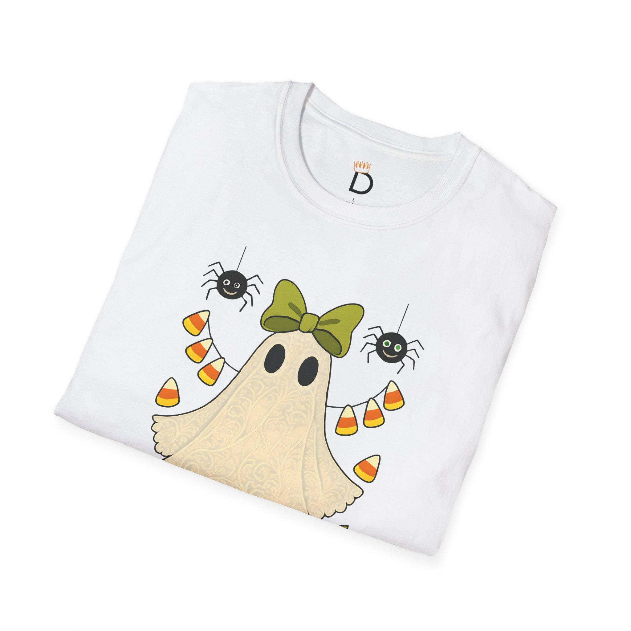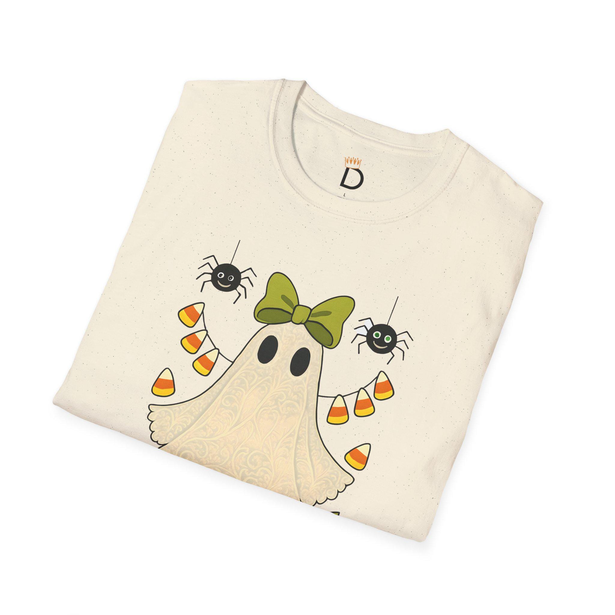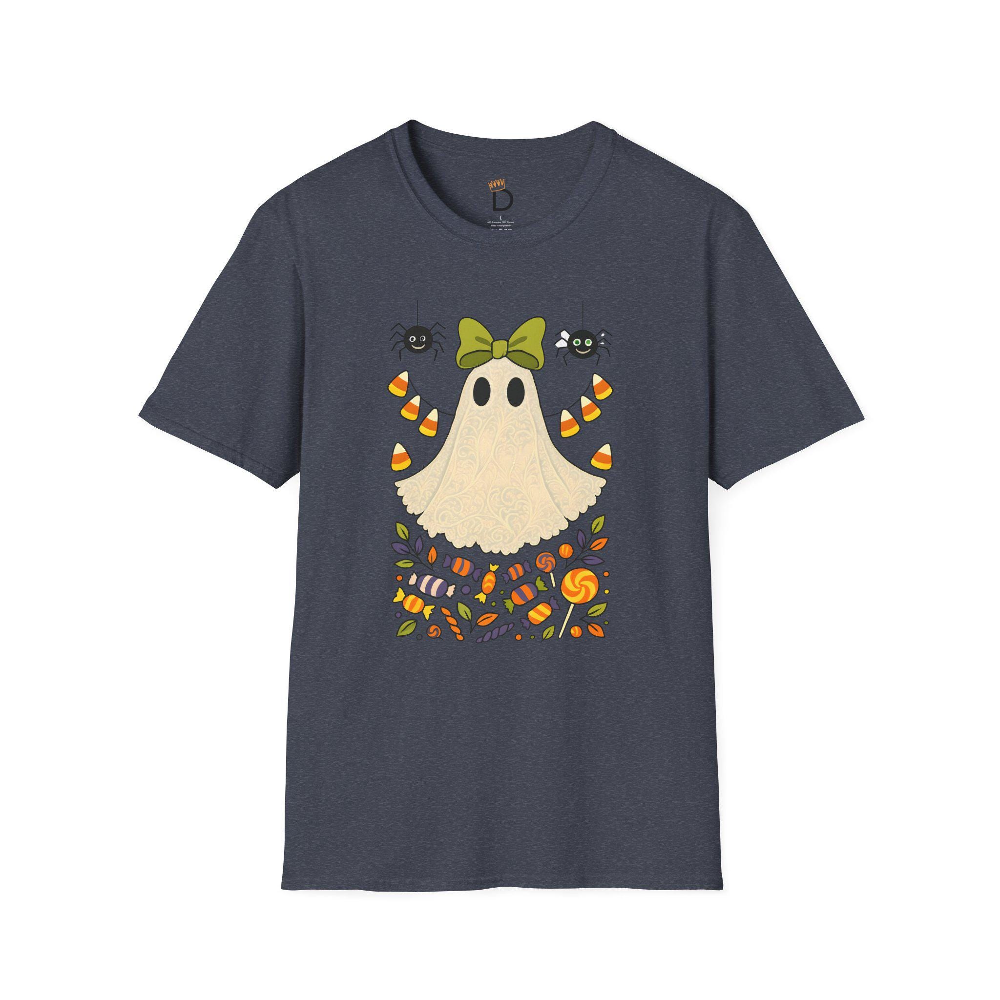 Cute Ghost Shirt, Halloween T-Shirt, Spooky Season Tee, Candy Ghost Graphic Tee, Fall Candy Corn and Spiders Tee, Unisex Halloween Top