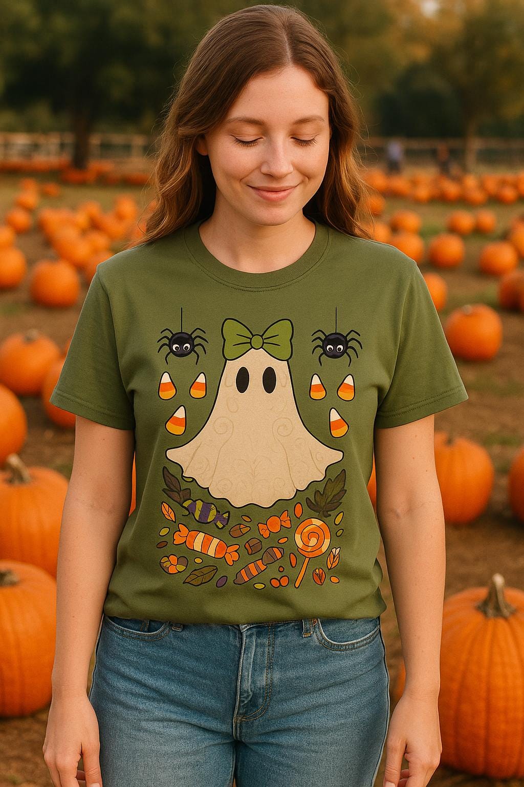 Trick-or-treat yourself to the cutest ghost on the block! This adorable Gildan 64000 tee features a charming little ghost with a green bow, surrounded by smiling spiders, candy corn, and a cascade of sweets and fall leaves. It’s spooky, it’s sweet, and it’s ready to haunt your closet (in the most wholesome way possible).