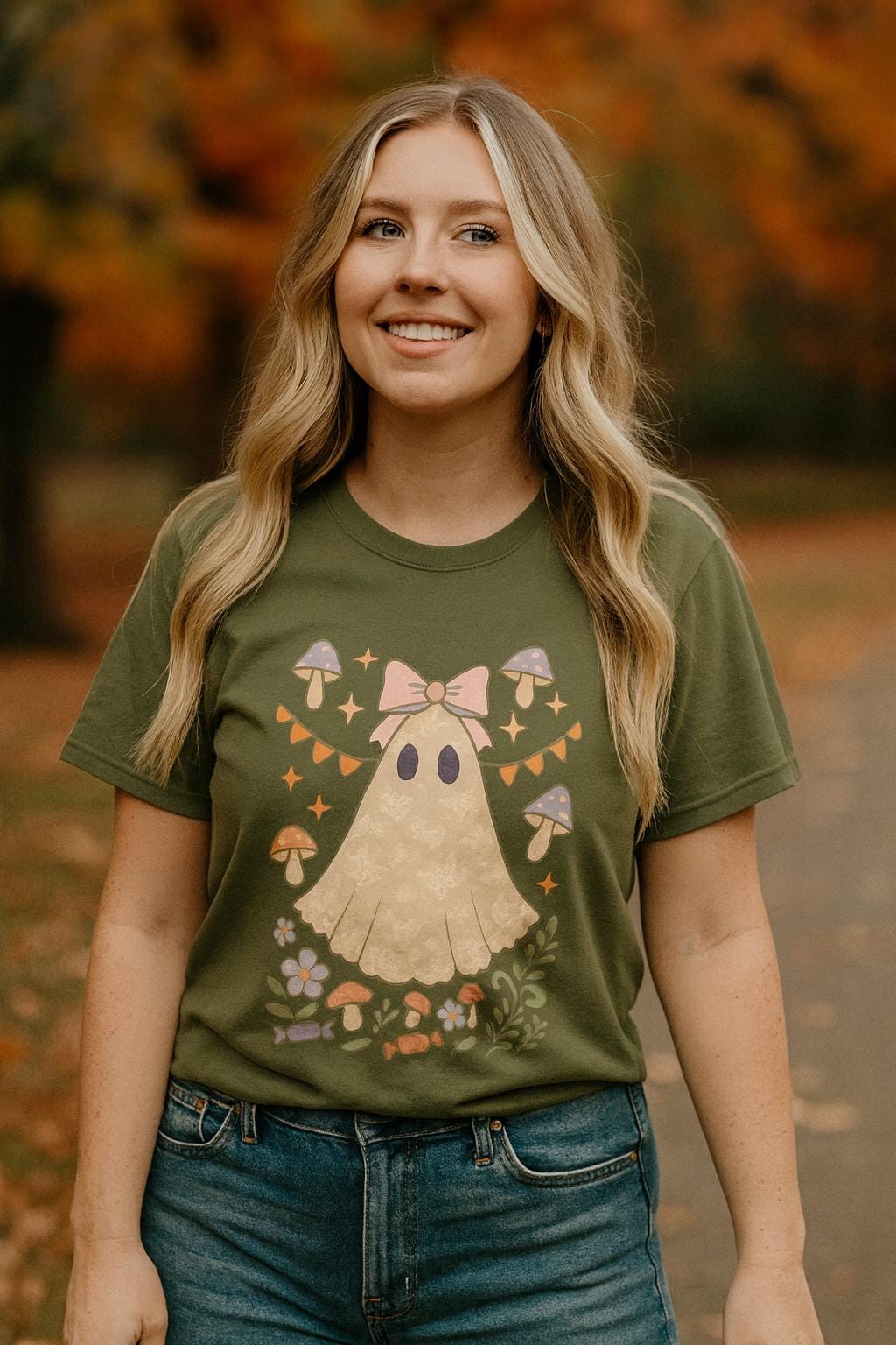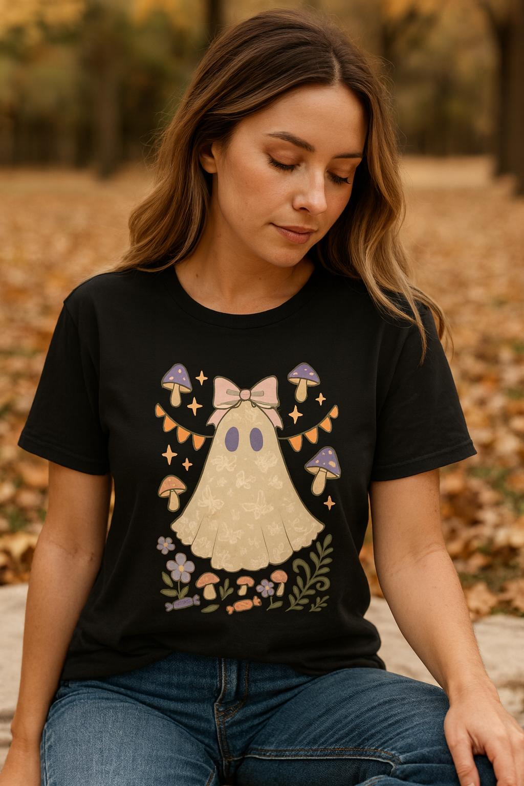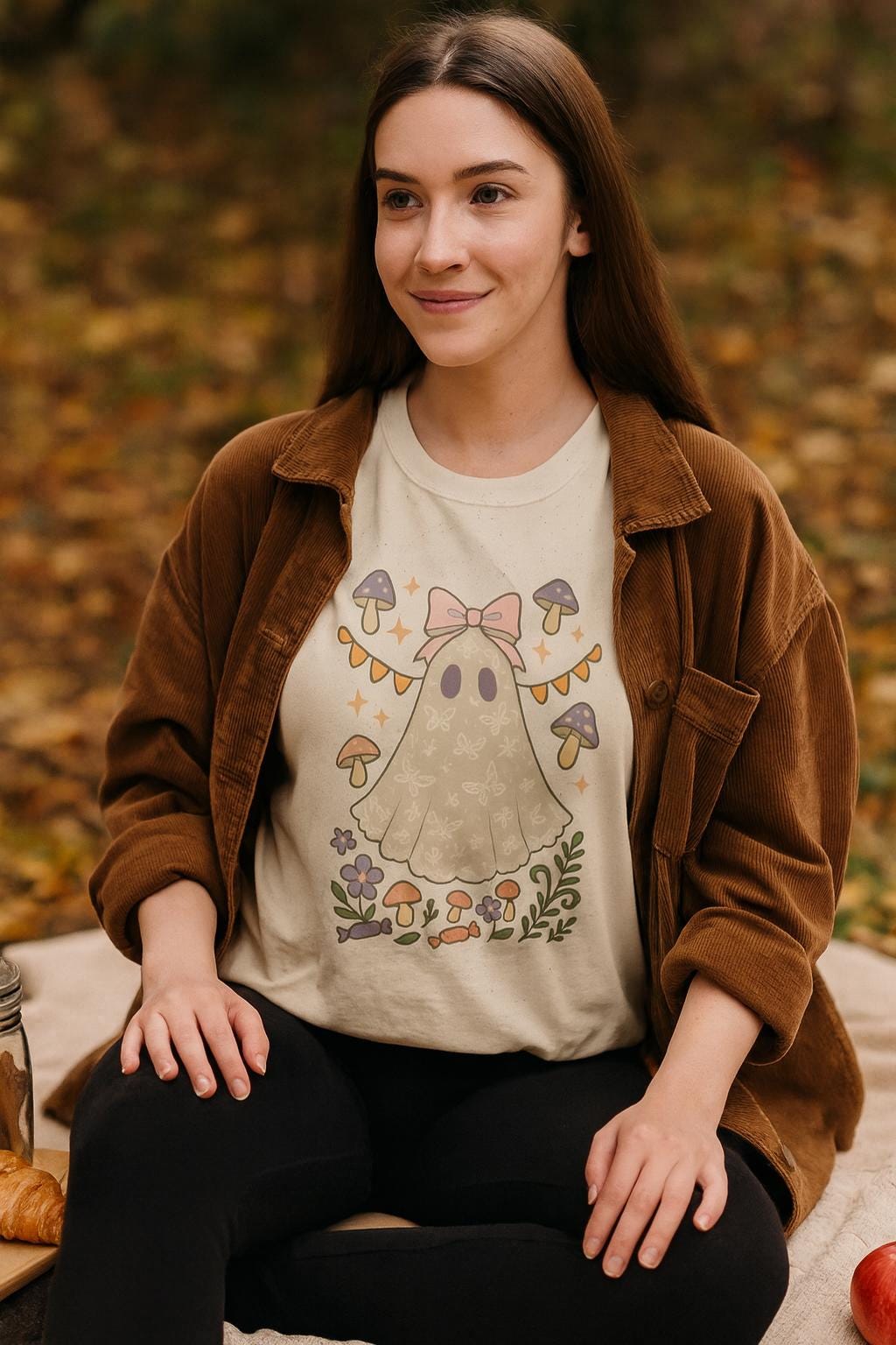 Step into a world where spooky meets sweet! This Cottagecore Ghost Shirt features a charming little ghost in a floral butterfly sheet, topped with a pink bow and surrounded by pastel mushrooms, woodland flowers, stars, and festive bunting. It’s the perfect cozy tee for fall, Halloween, or anyone who loves a touch of whimsy in their wardrobe.