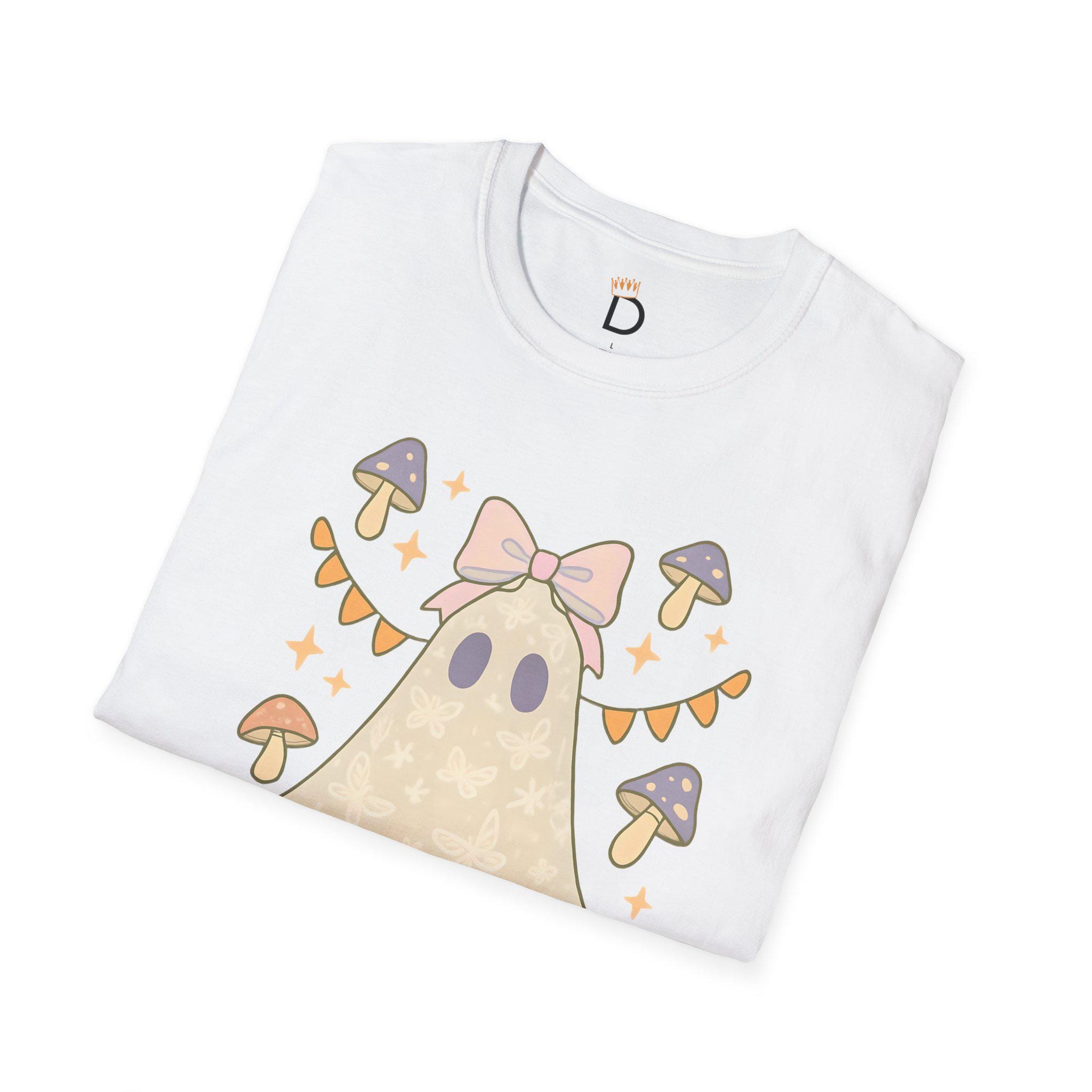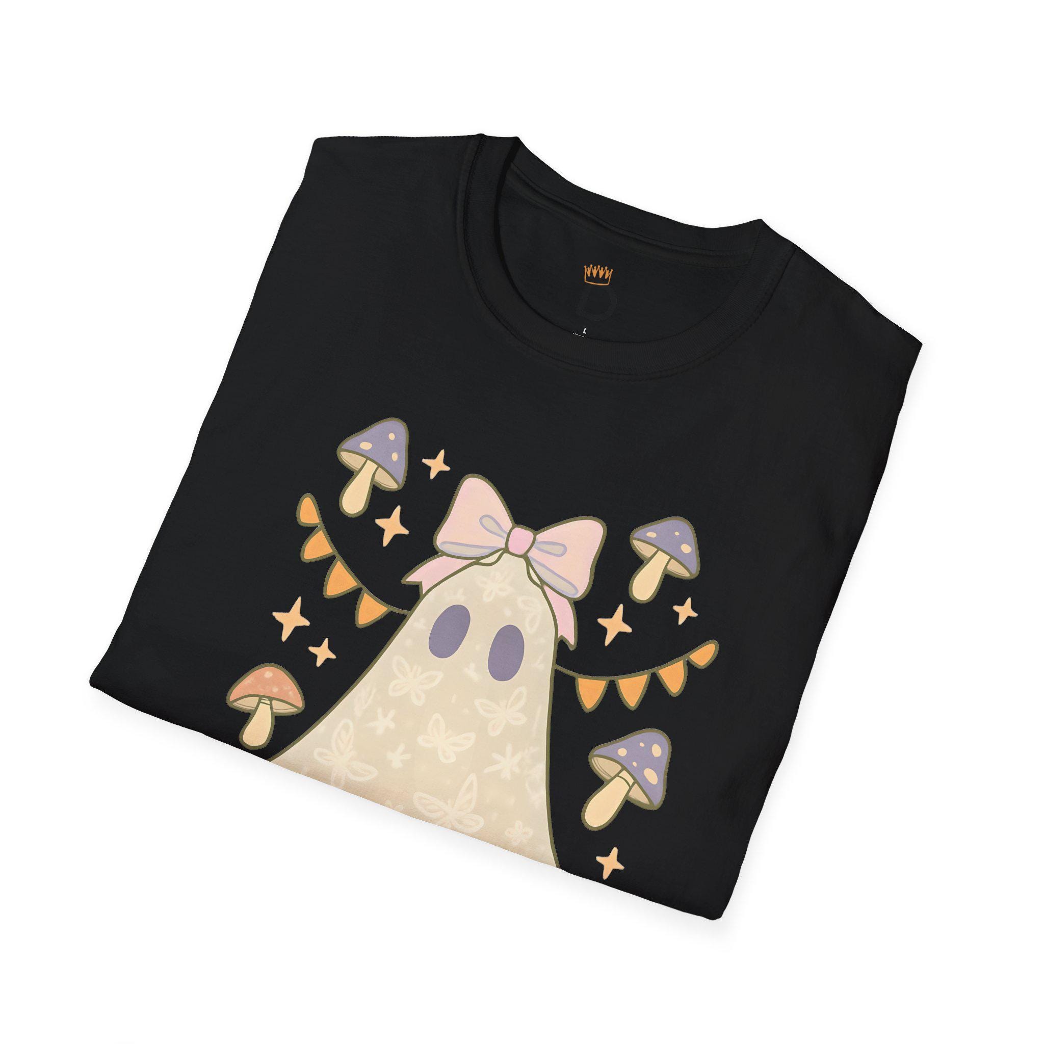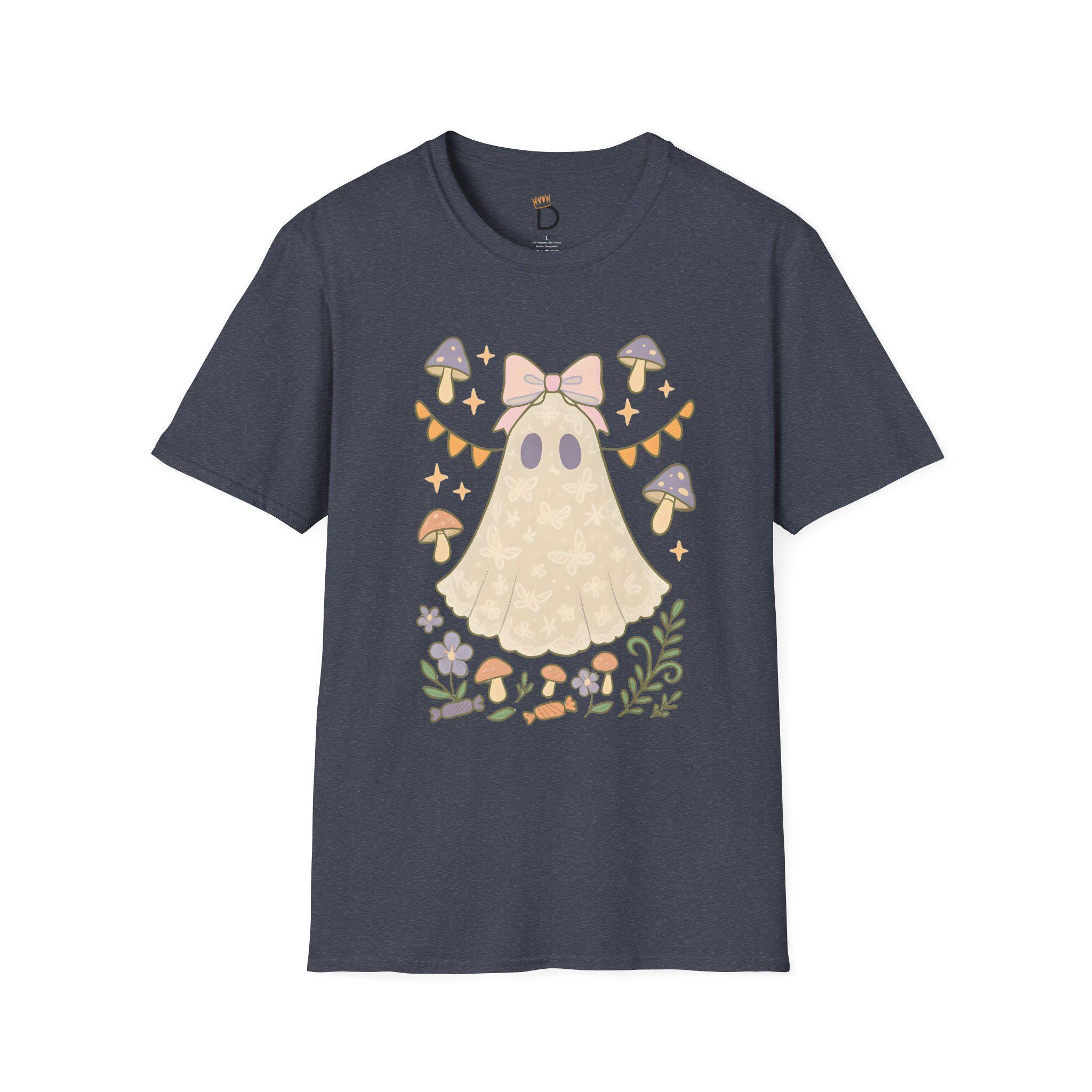 Step into a world where spooky meets sweet! This Cottagecore Ghost Shirt features a charming little ghost in a floral butterfly sheet, topped with a pink bow and surrounded by pastel mushrooms, woodland flowers, stars, and festive bunting. It’s the perfect cozy tee for fall, Halloween, or anyone who loves a touch of whimsy in their wardrobe.