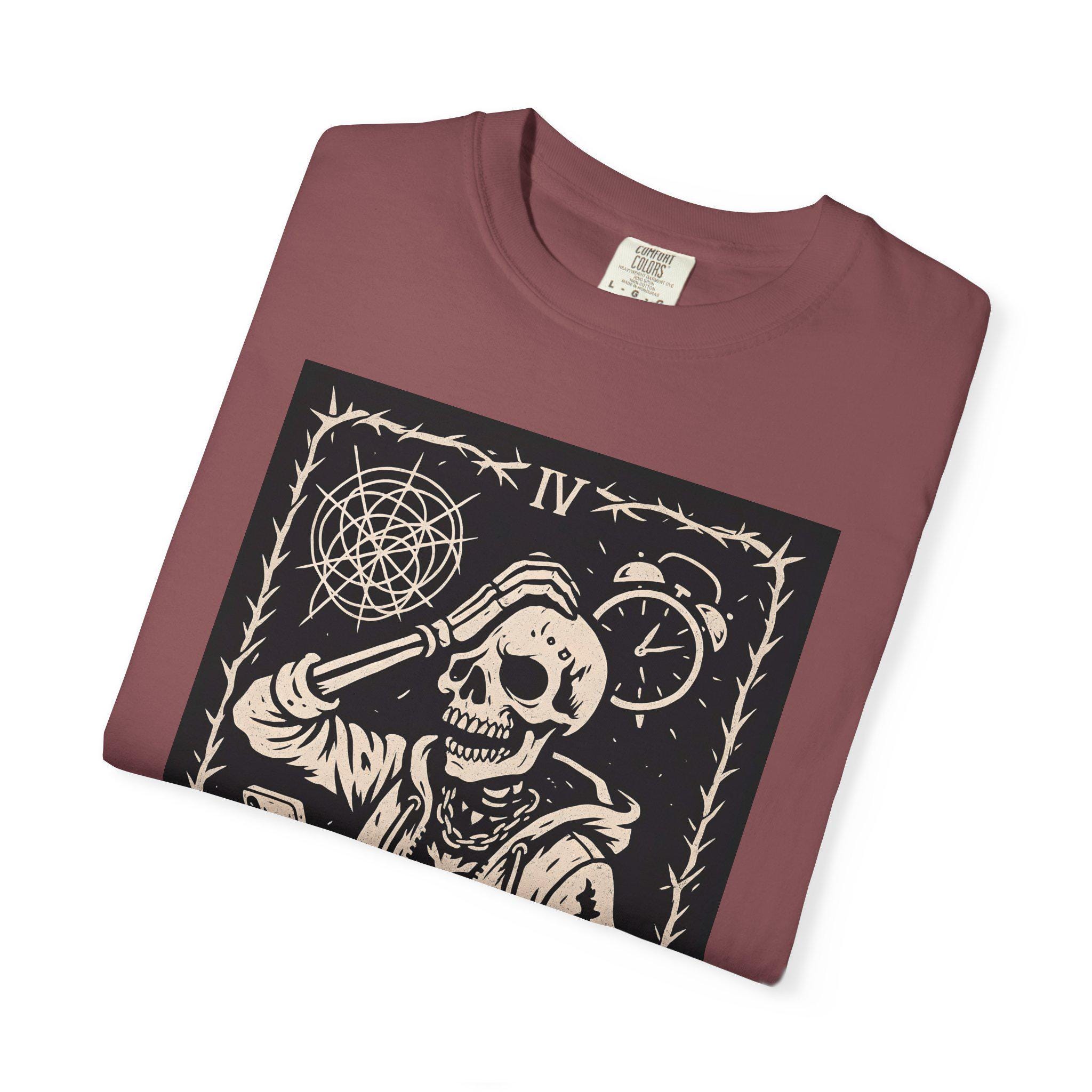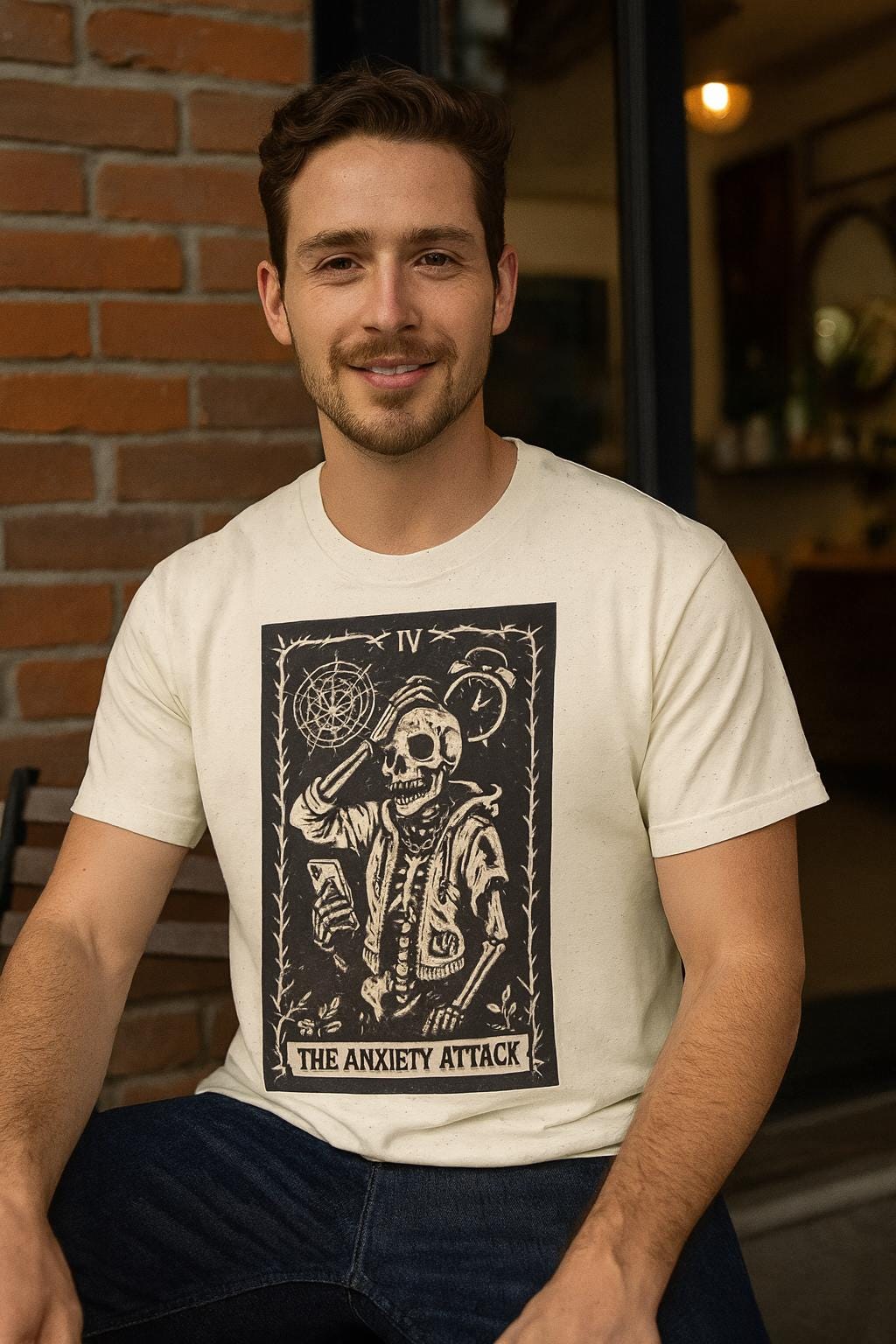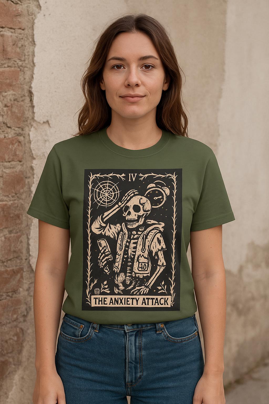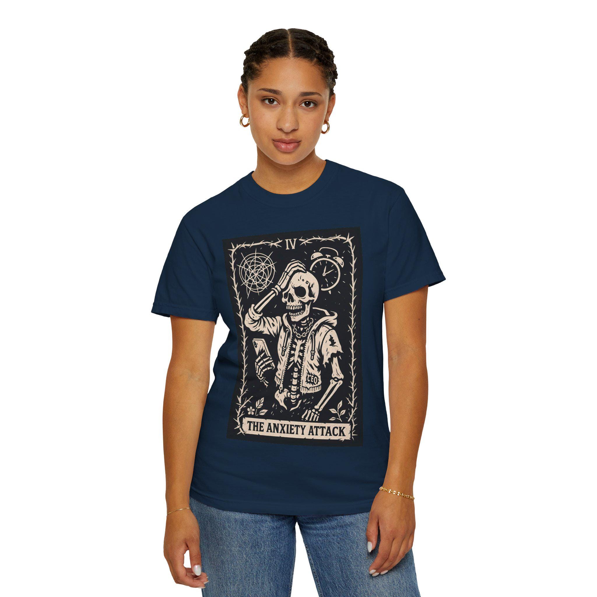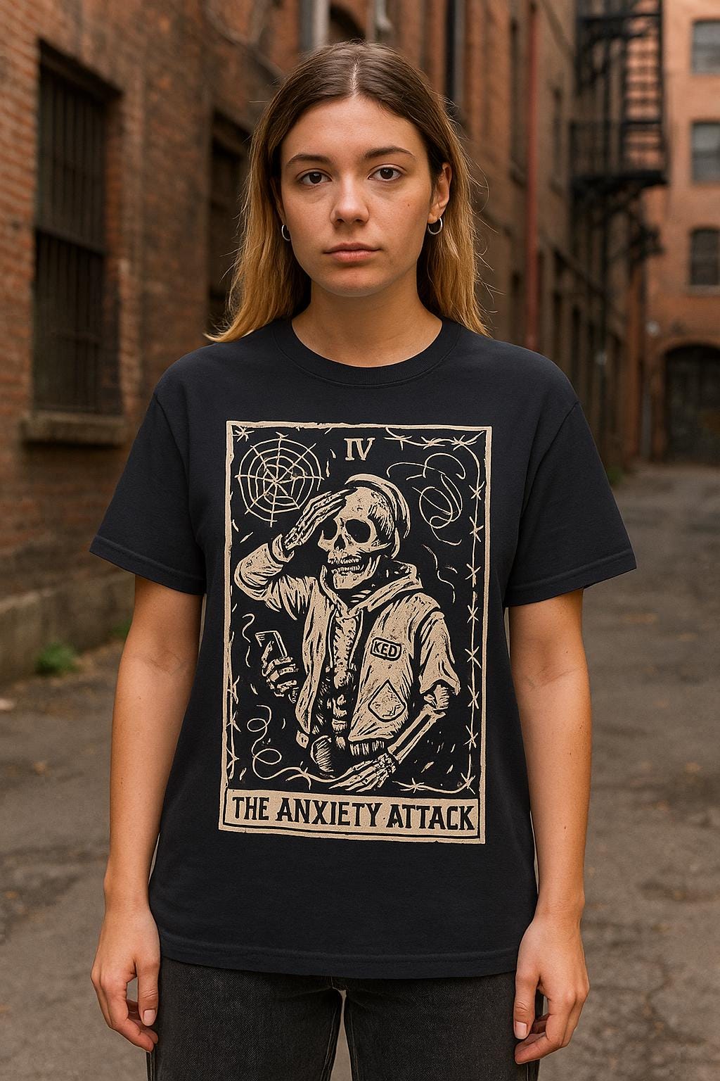 Introducing The Anxiety Attack—card IV in your daily tarot pull, and it's hitting hard. This Comfort Colors 1717 tee features a punk-style skeleton figure mid-panic, surrounded by barbed wire, chaos webs, and a ticking clock—because nothing screams “CEO of Overthinking” like spiraling in style.
