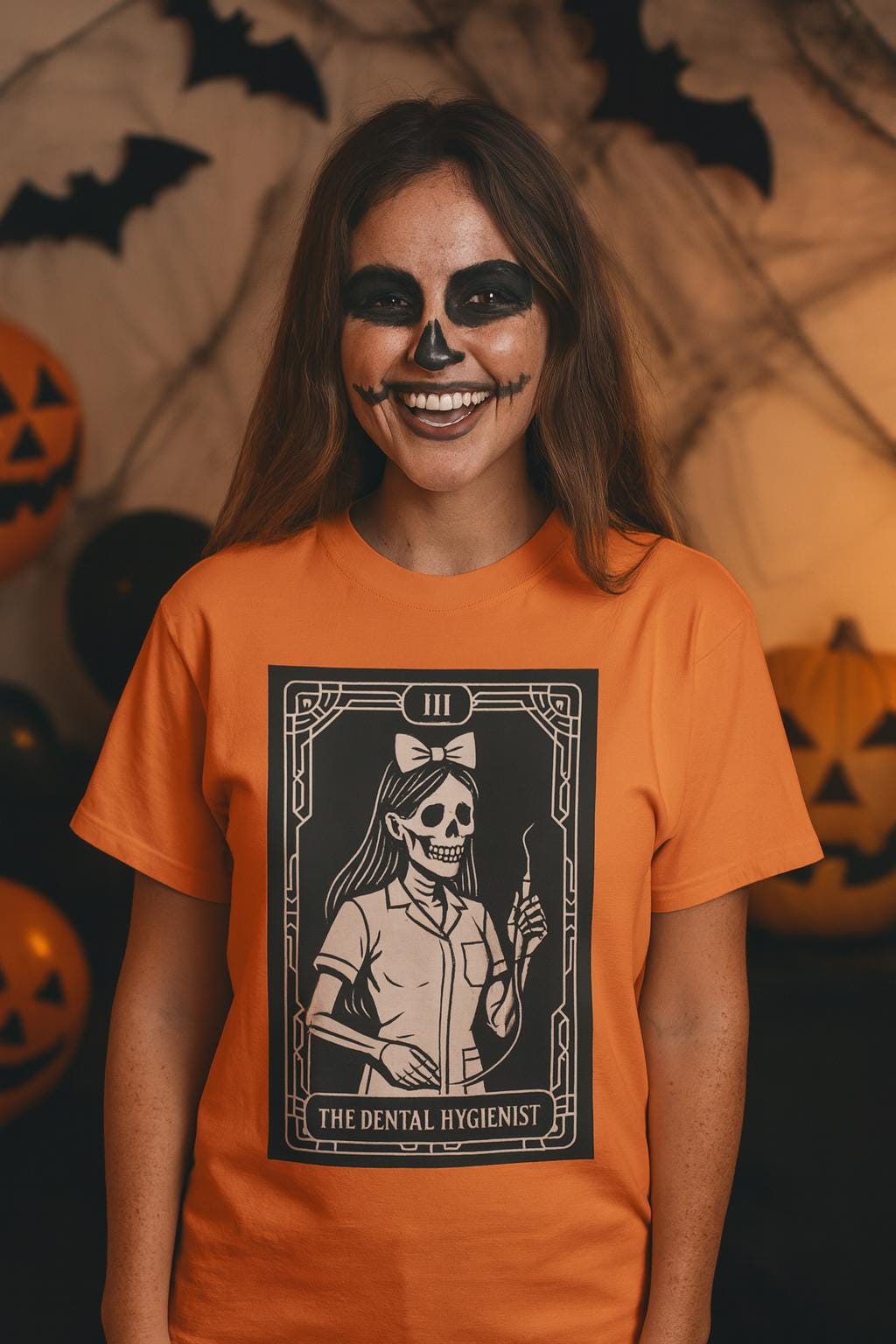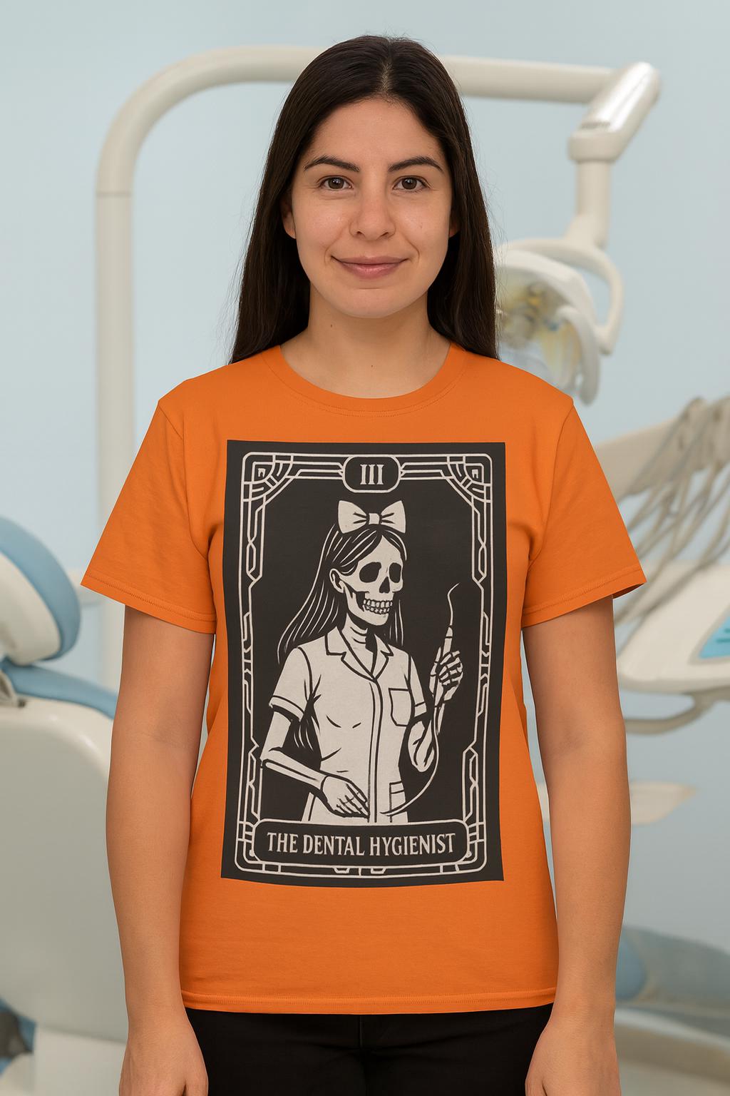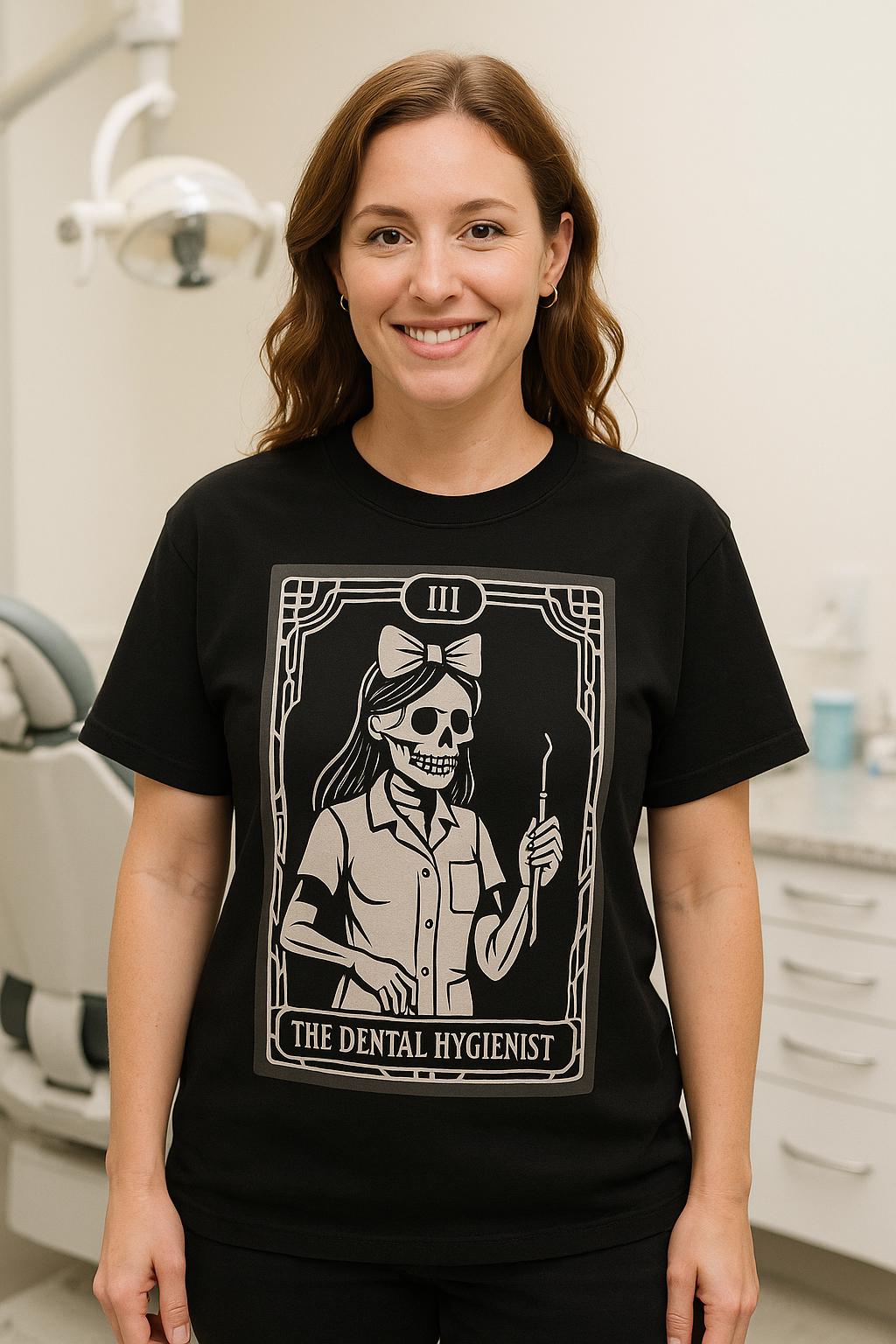 🦷 “The Dental Hygienist” Tarot Tee—because your smile is sacred and your vibes are spooky. This gothic-meets-funny design is perfect for dental professionals who love Halloween, humor, and making a statement.