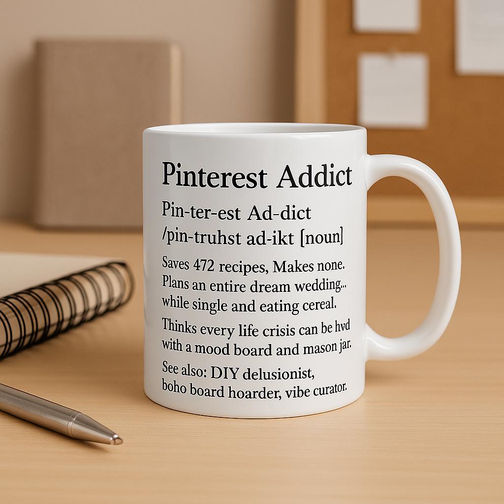 ✨ Calling all vibe curators and mason jar mood boarders! This hilarious and highly relatable Pinterest Addict mug is perfect for the woman who’s got big dreams and even bigger pin boards (and maybe a cereal addiction).