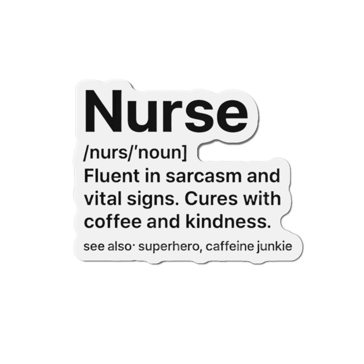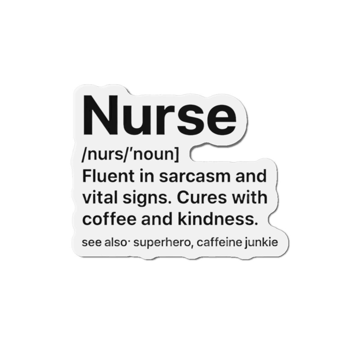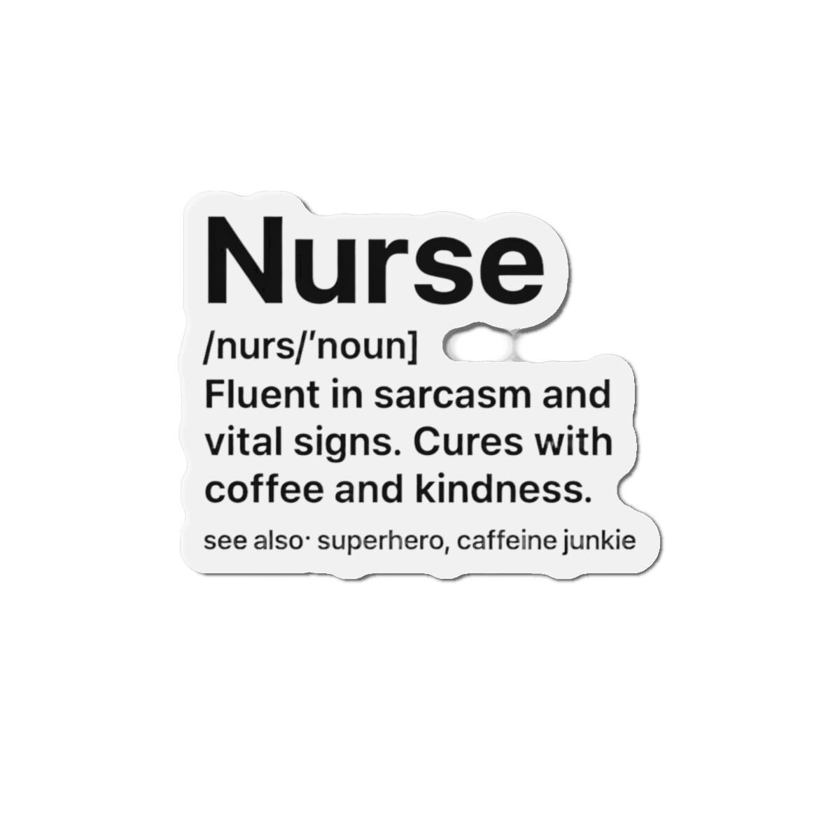 This witty magnet features a playful definition of a nurse—highlighting sarcasm, kindness, and caffeine addiction—making it an ideal gift for nurse appreciation, hospital staff, or coffee lovers. Whether you're decorating your workspace or searching for the perfect gift in scrubs, this magnet is sure to bring smiles and brighten any room.