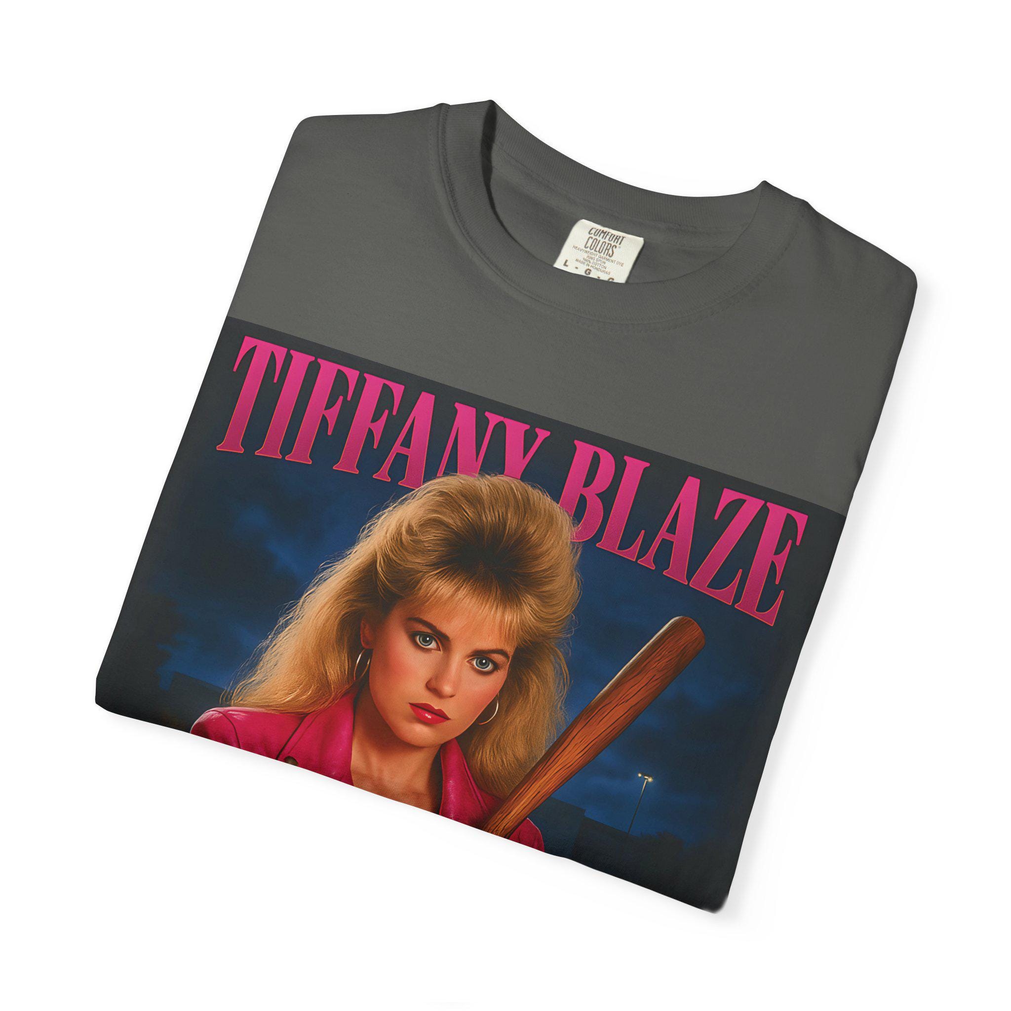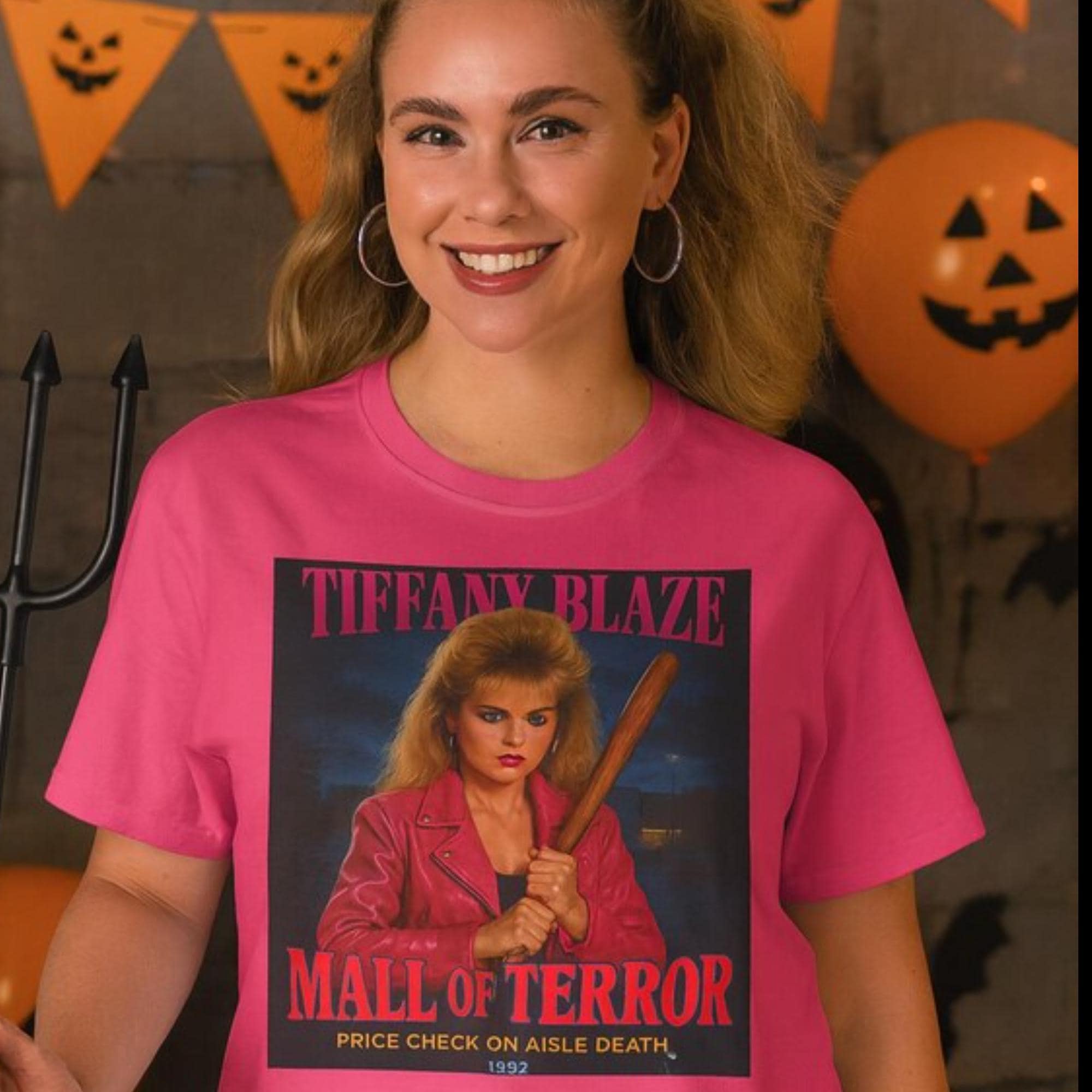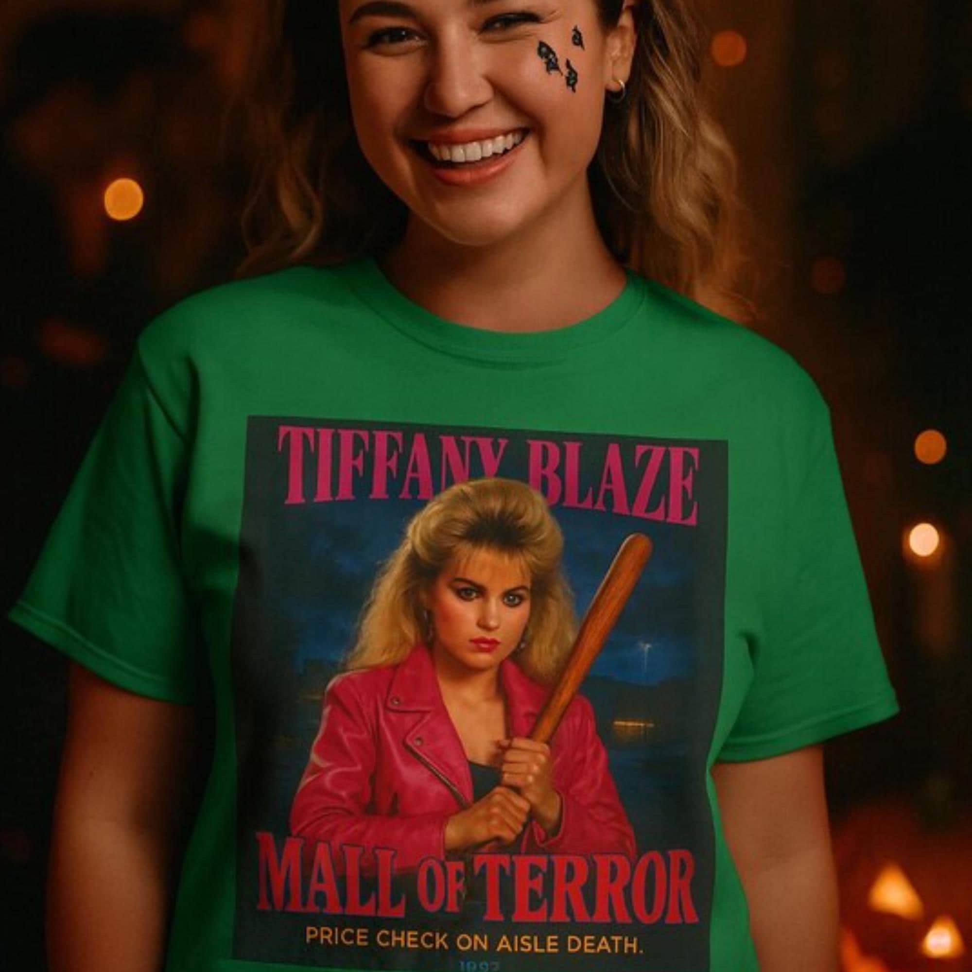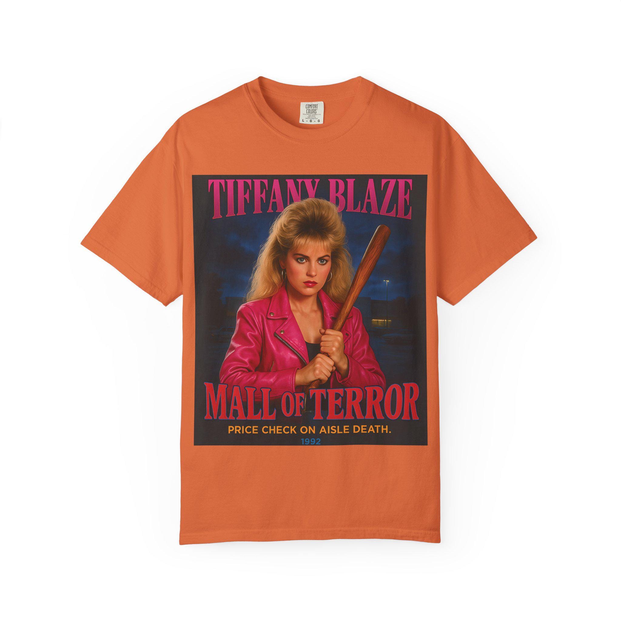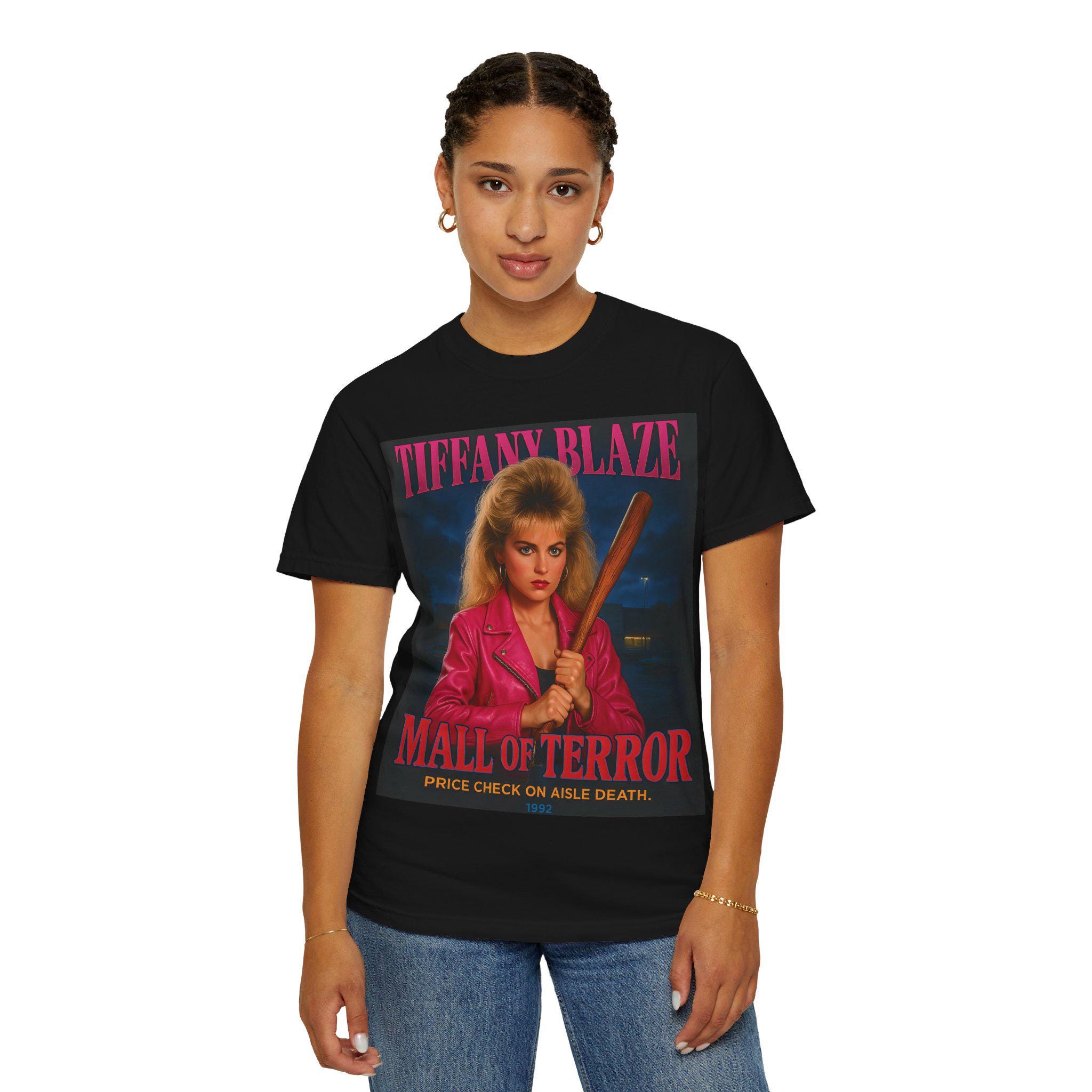 Step back into the VHS glory days of the early ’90s with this Tiffany Blaze – Mall of Terror Comfort Colors® Comic Con shirt.