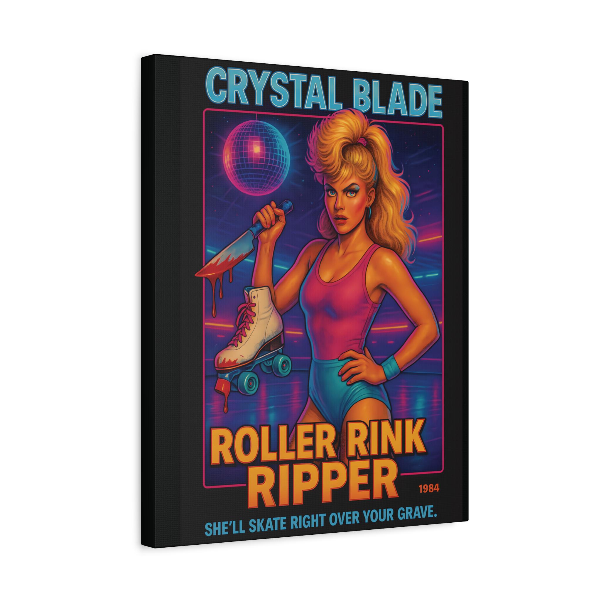 Meet Crystal Blade, the ultimate 80s scream queen—she’s fierce, fearless, and armed with skates sharper than your last breakup. Our Roller Rink Ripper Matte Canvas brings neon nostalgia and horror camp to your walls in stunning, high-quality detail.