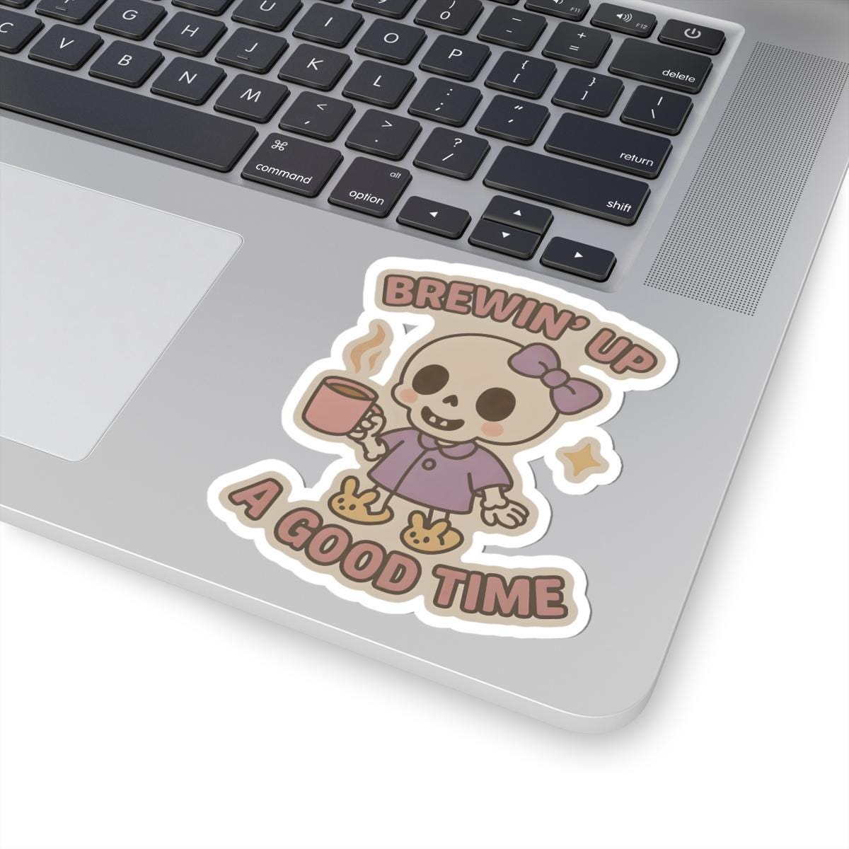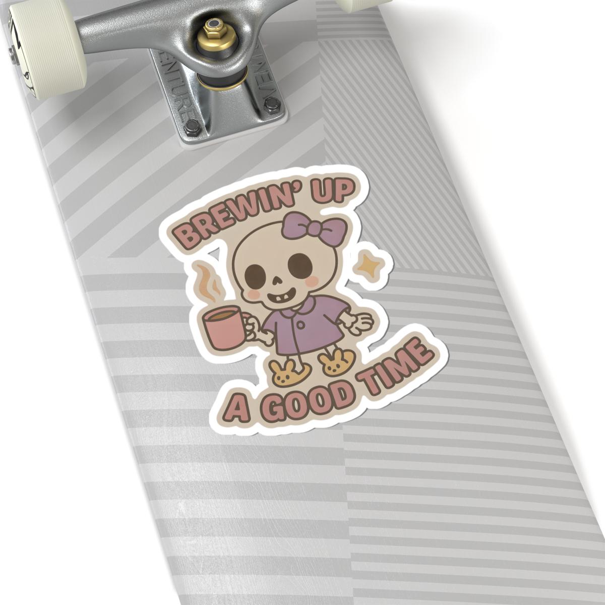 Made with high-quality, durable materials, this glossy sticker ensures long-lasting vibrancy and resistance to everyday wear and tear. The whimsical art style captures a cute skeleton holding a steaming mug with the phrase "Brewin' Up A Good Time," blending humor and charm into one irresistible design.