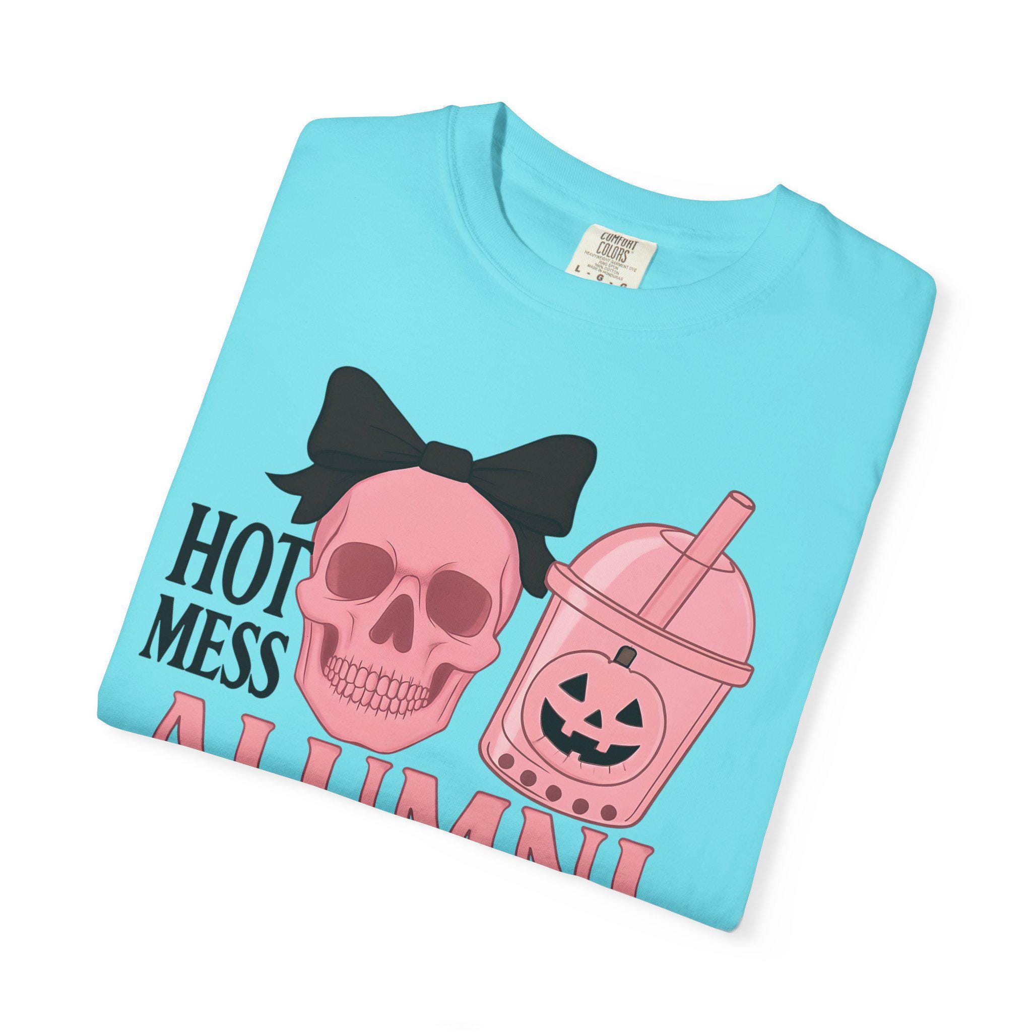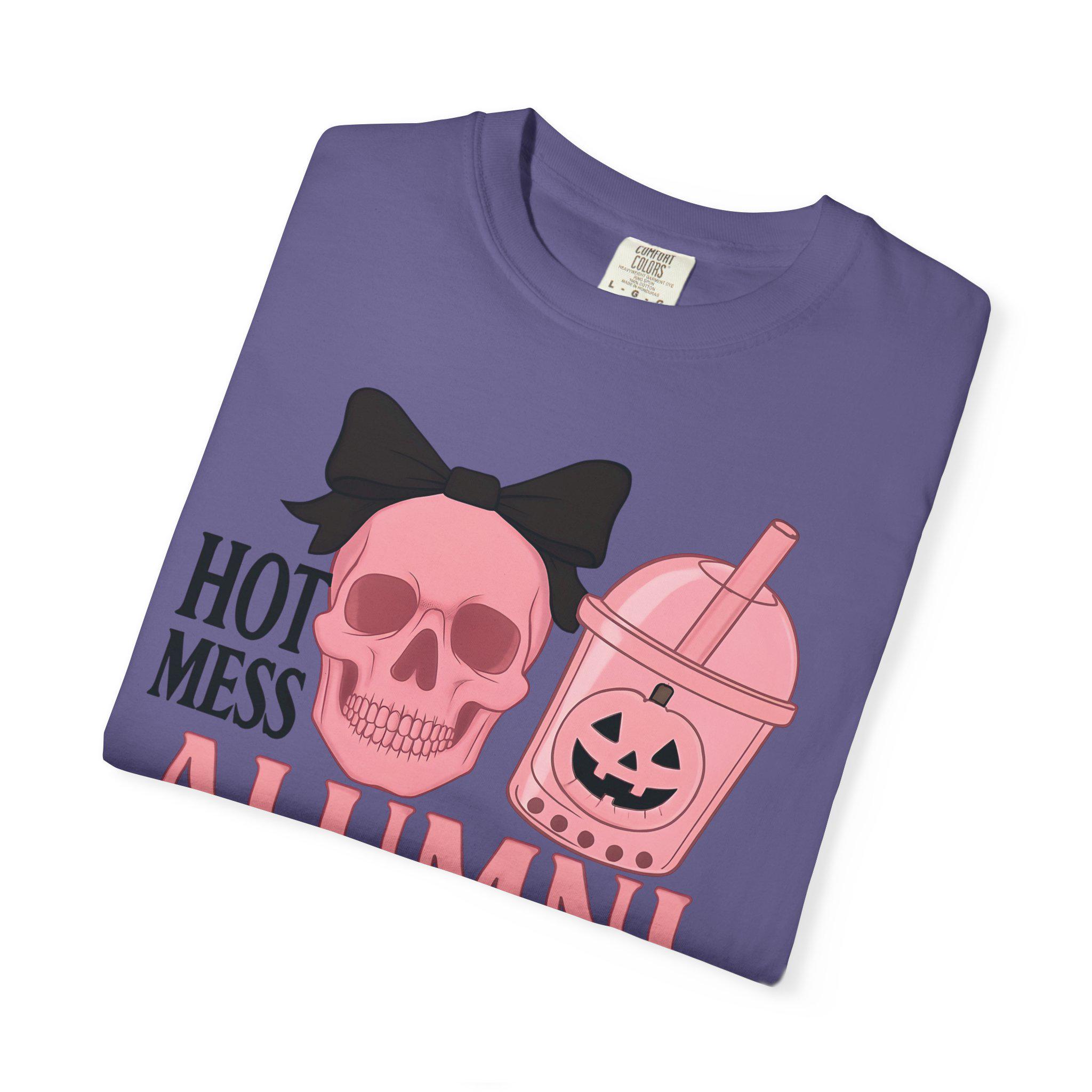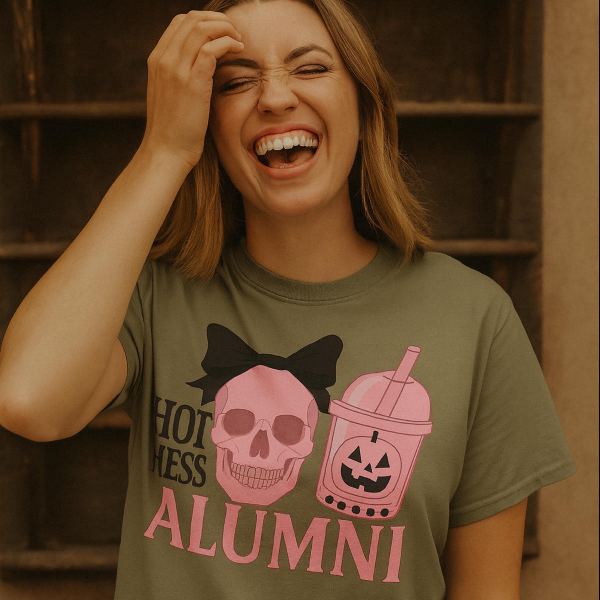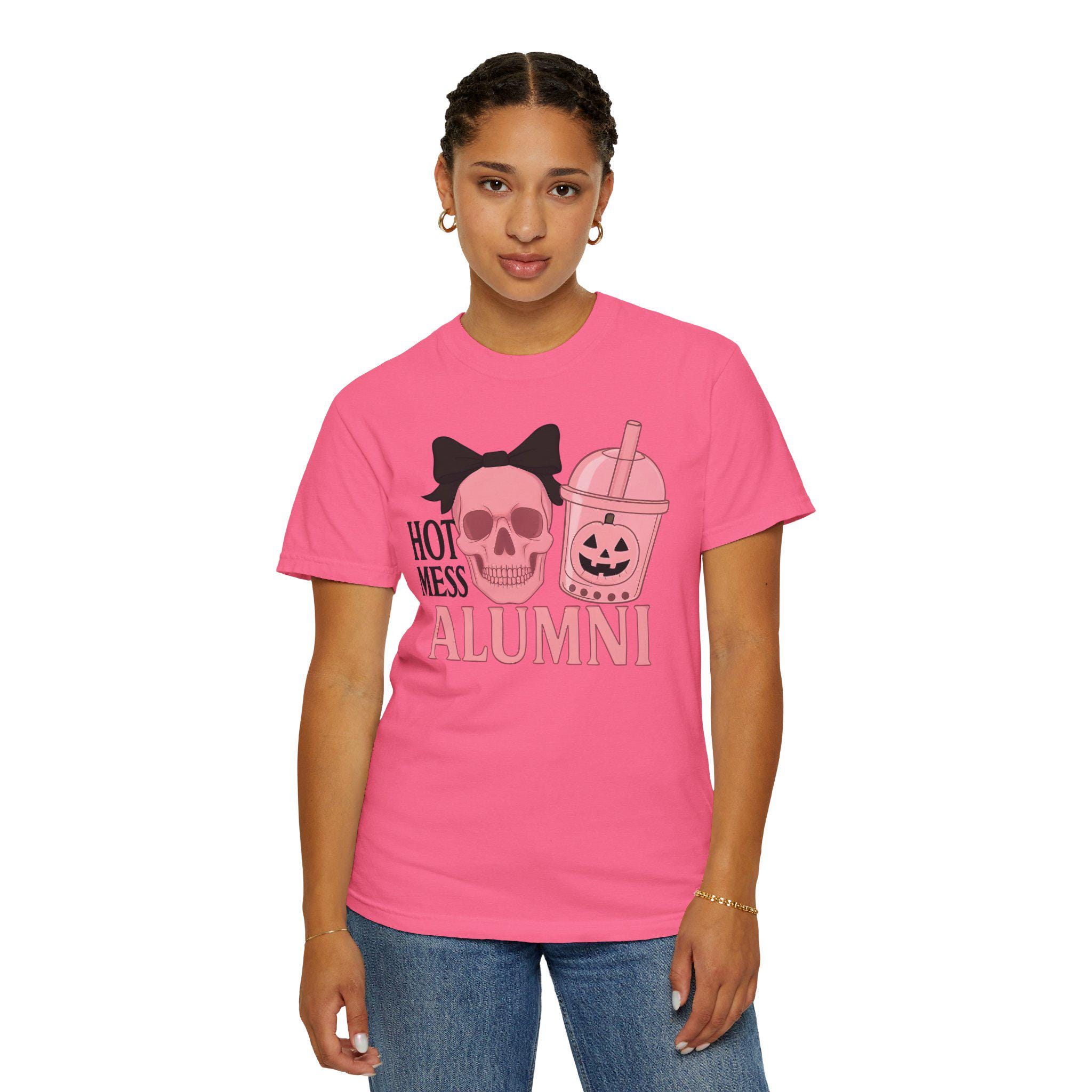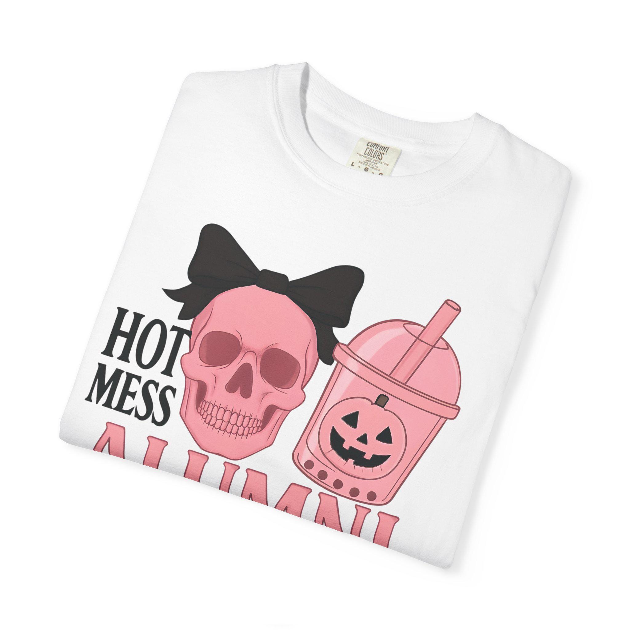 Some of us didn’t just survive Hot Mess University… we earned our diploma. This Hot Mess Alumni Comfort Colors Tee combines a vintage skull with an oversized orange bow, a pumpkin spice latte cup, and bold retro lettering to create the perfect fall graphic shirt. Whether you’re heading to a haunted house, strolling the pumpkin patch, or fueling up at your local coffee shop, this shirt says, "Yes, I’m a mess, but I look fabulous doing it."