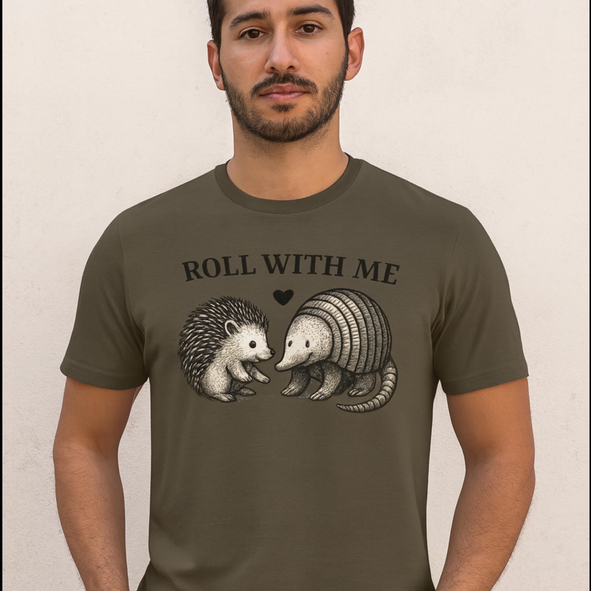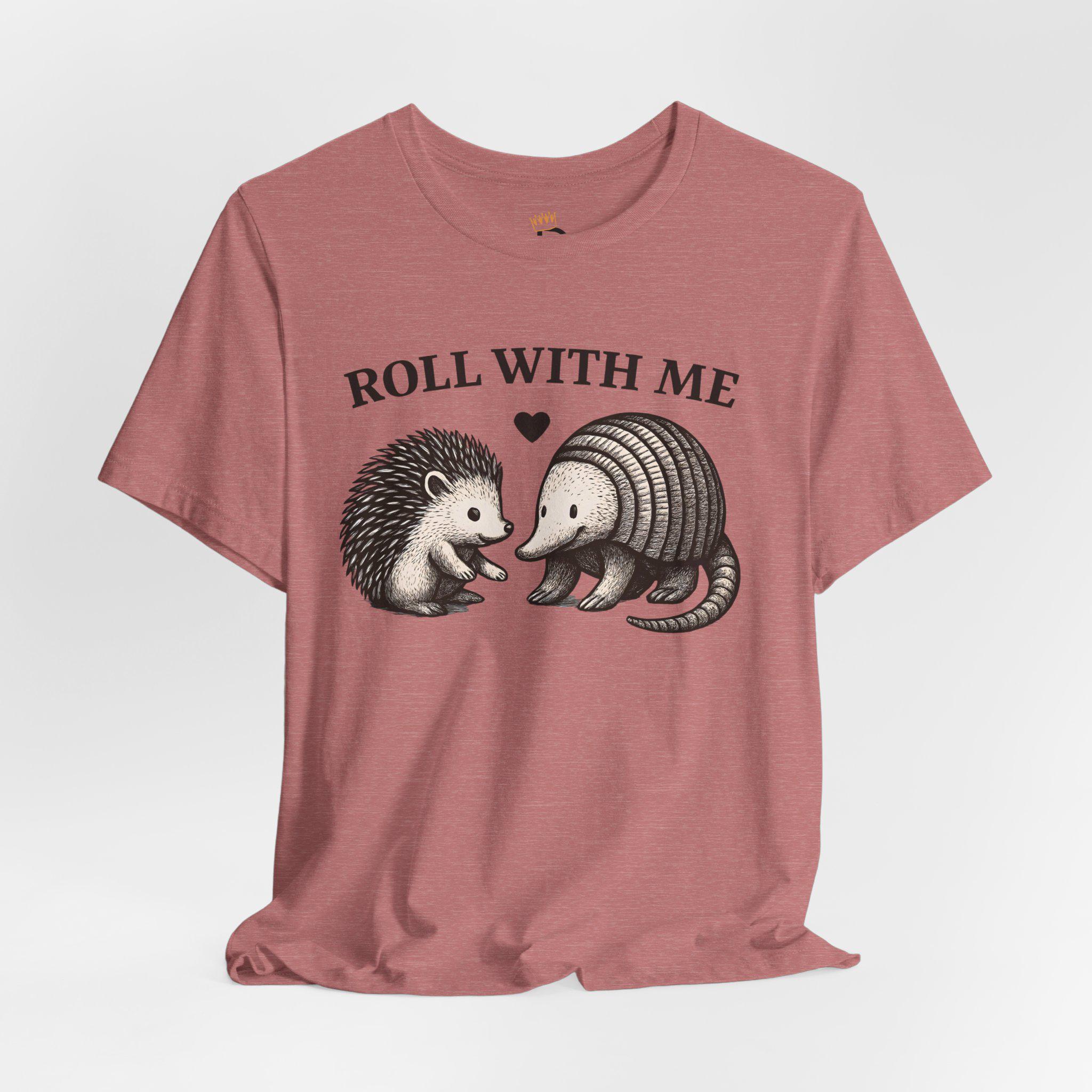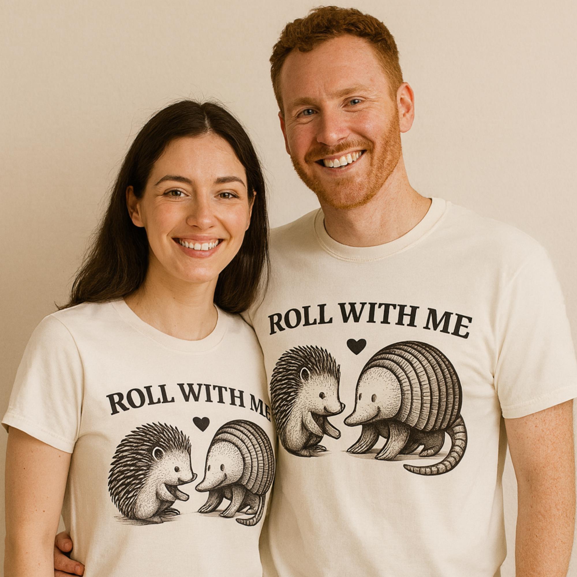 This “Roll With Me” Couple Funny T-shirt is the perfect couple funny shirt and pairs the cutest unlikely duo — a hedgehog and an armadillo — for a funny animal pun design that’s sure to make people smile. Featuring a hand-drawn vintage illustration and a playful heart detail, it’s the perfect gift for animal lovers, pun enthusiasts, and best friends who roll through life together.