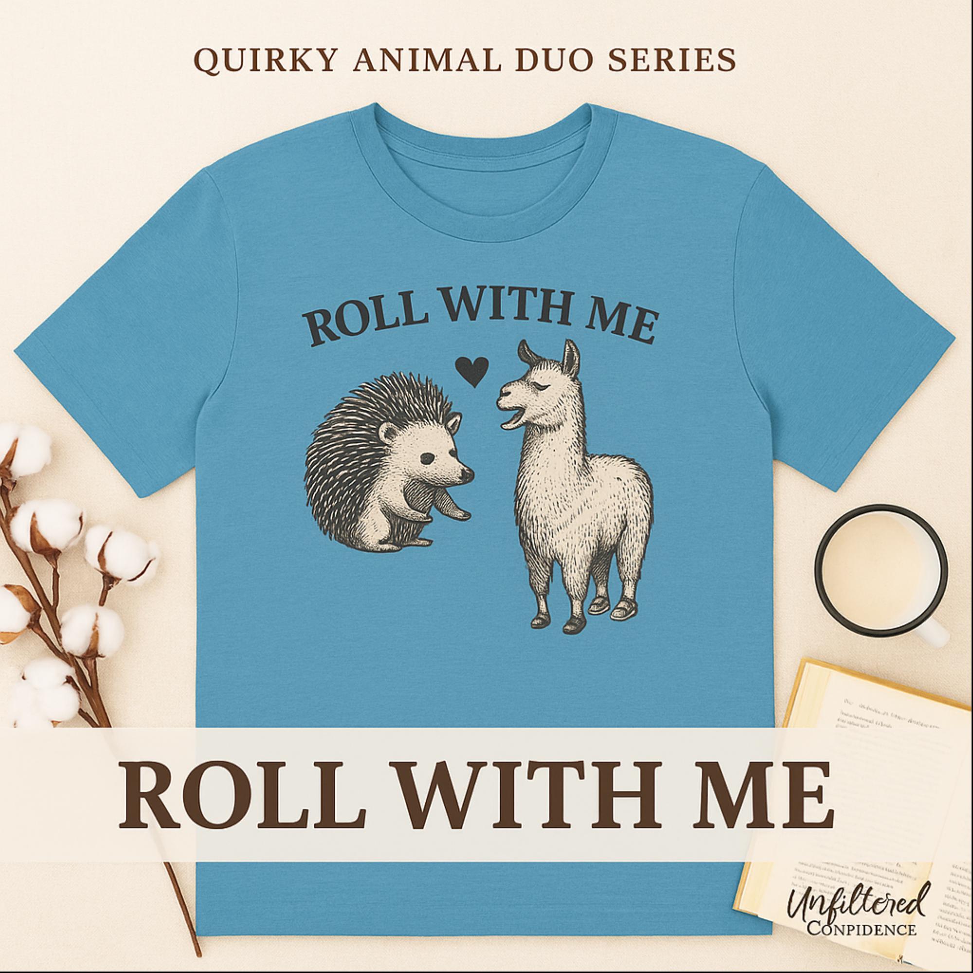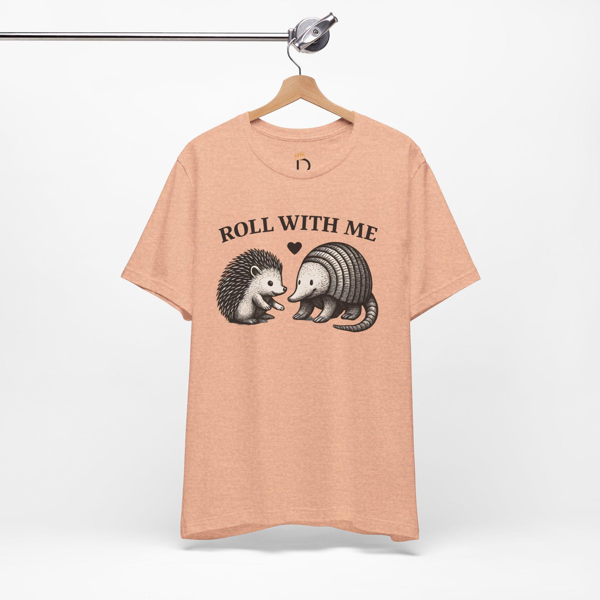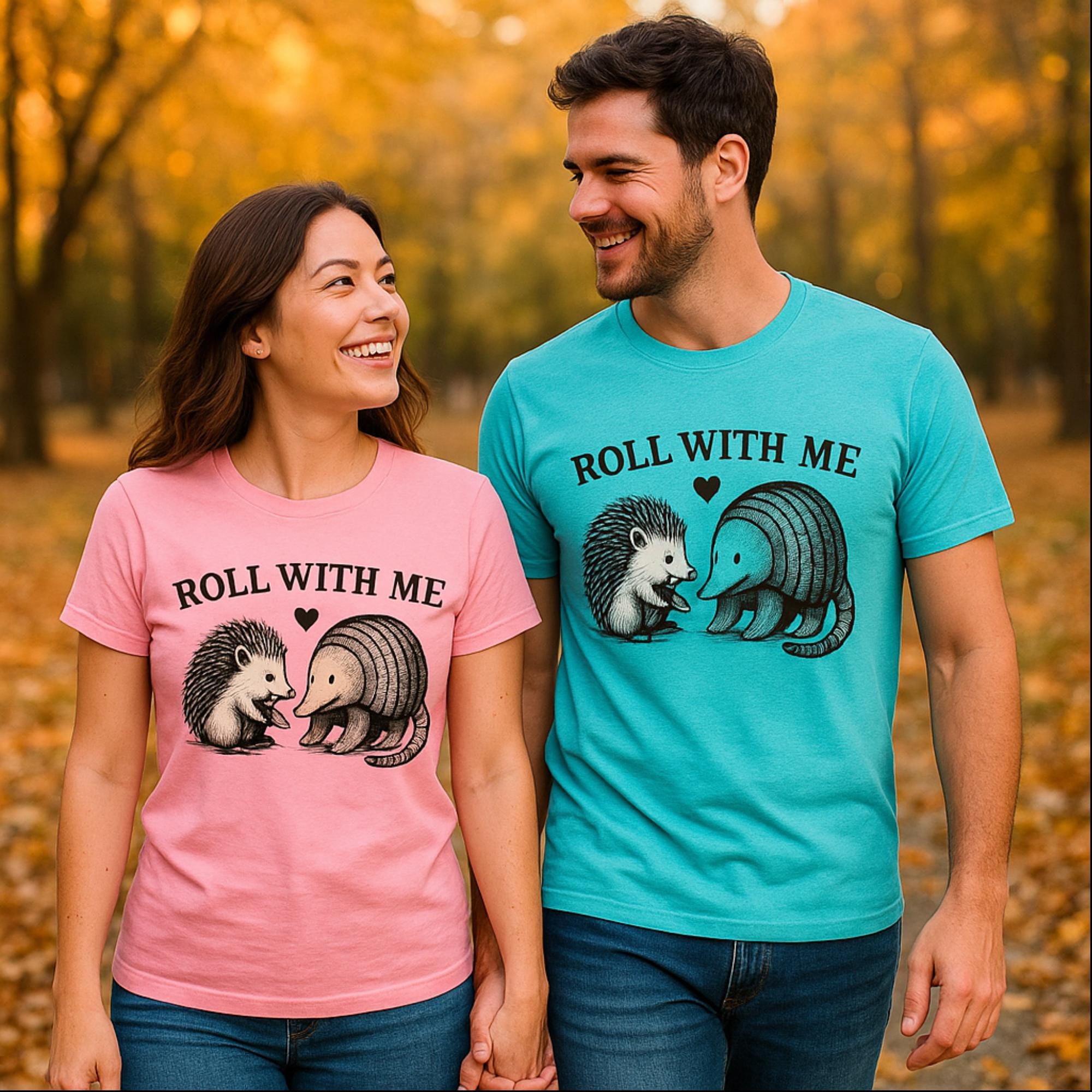 This “Roll With Me” Couple Funny T-shirt is the perfect couple funny shirt and pairs the cutest unlikely duo — a hedgehog and an armadillo — for a funny animal pun design that’s sure to make people smile. Featuring a hand-drawn vintage illustration and a playful heart detail, it’s the perfect gift for animal lovers, pun enthusiasts, and best friends who roll through life together.