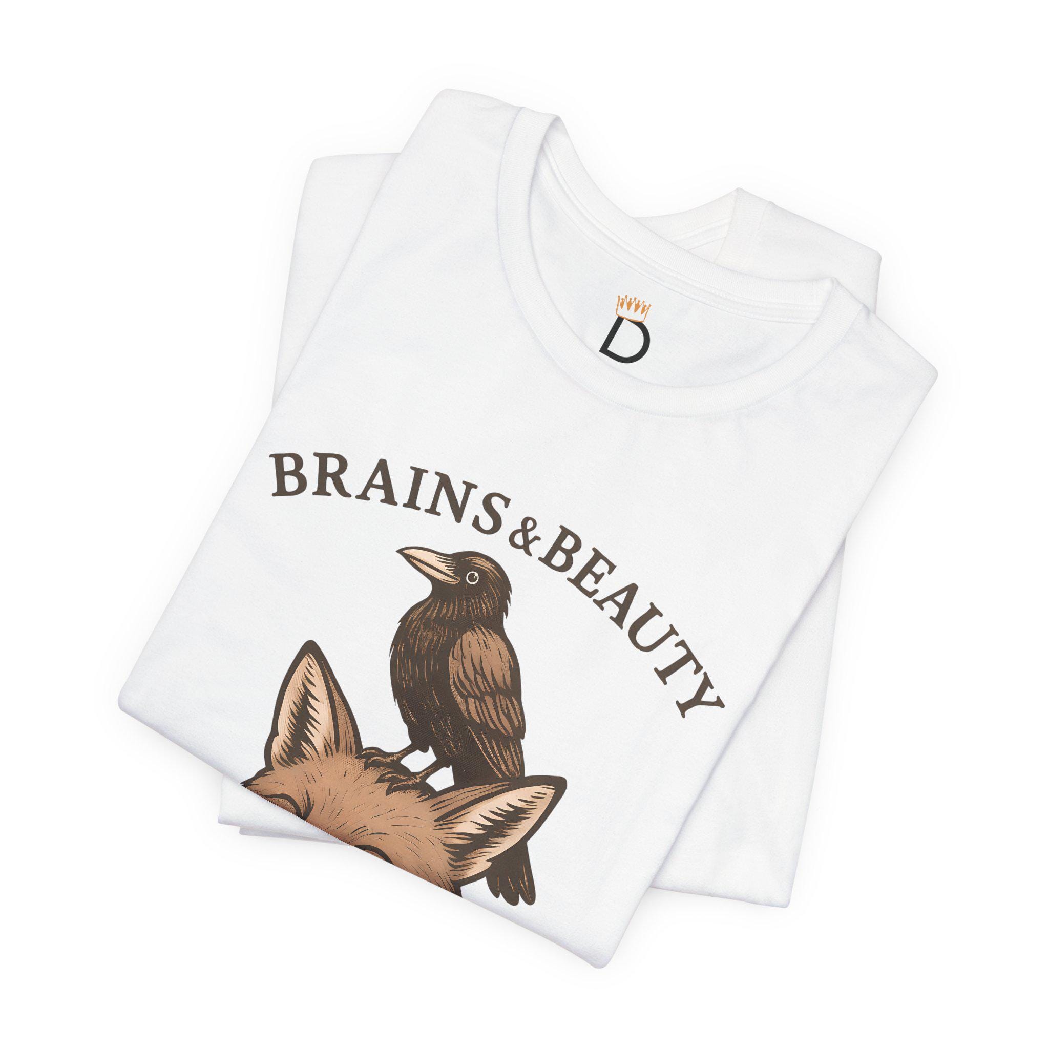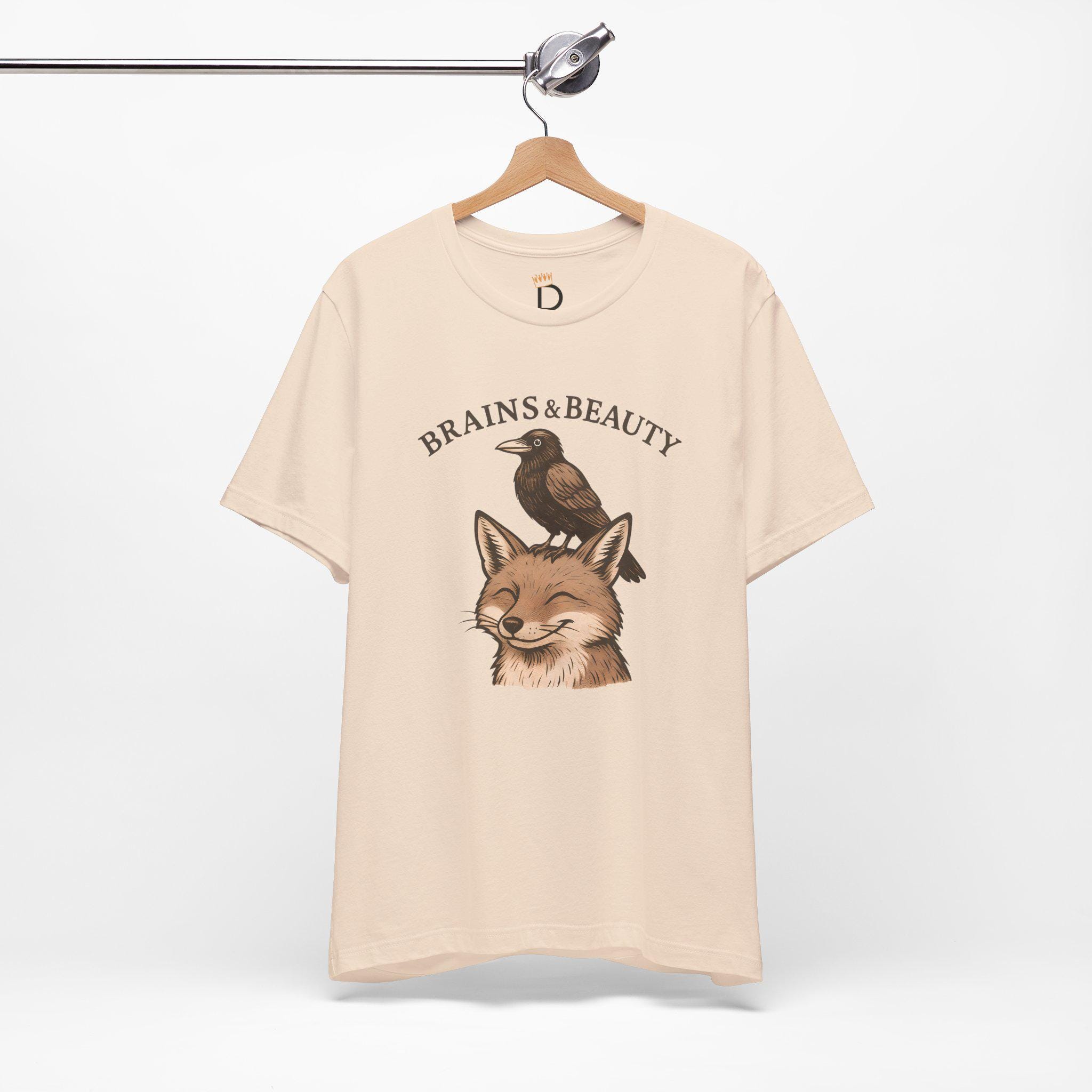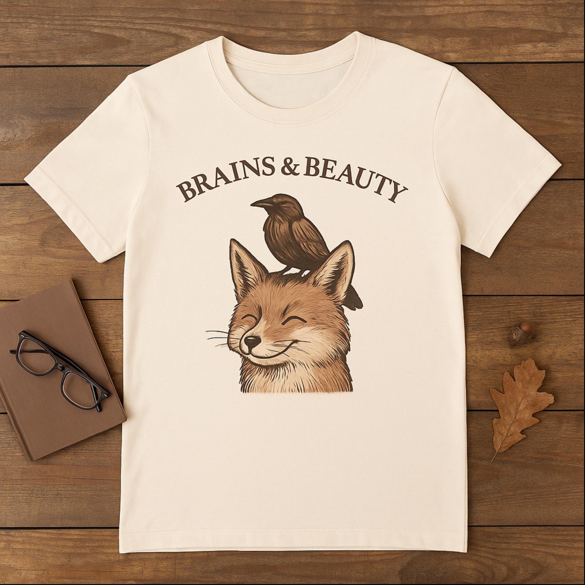 Smart meets stunning. Our “Brains & Beauty” Fox Tee Shirt, pairs a clever crow with a foxy grin for a whimsical, vintage-style illustration that celebrates unlikely friendships and balanced vibes. Perfect for nature lovers, cottagecore cuties, and best-friend gifts.