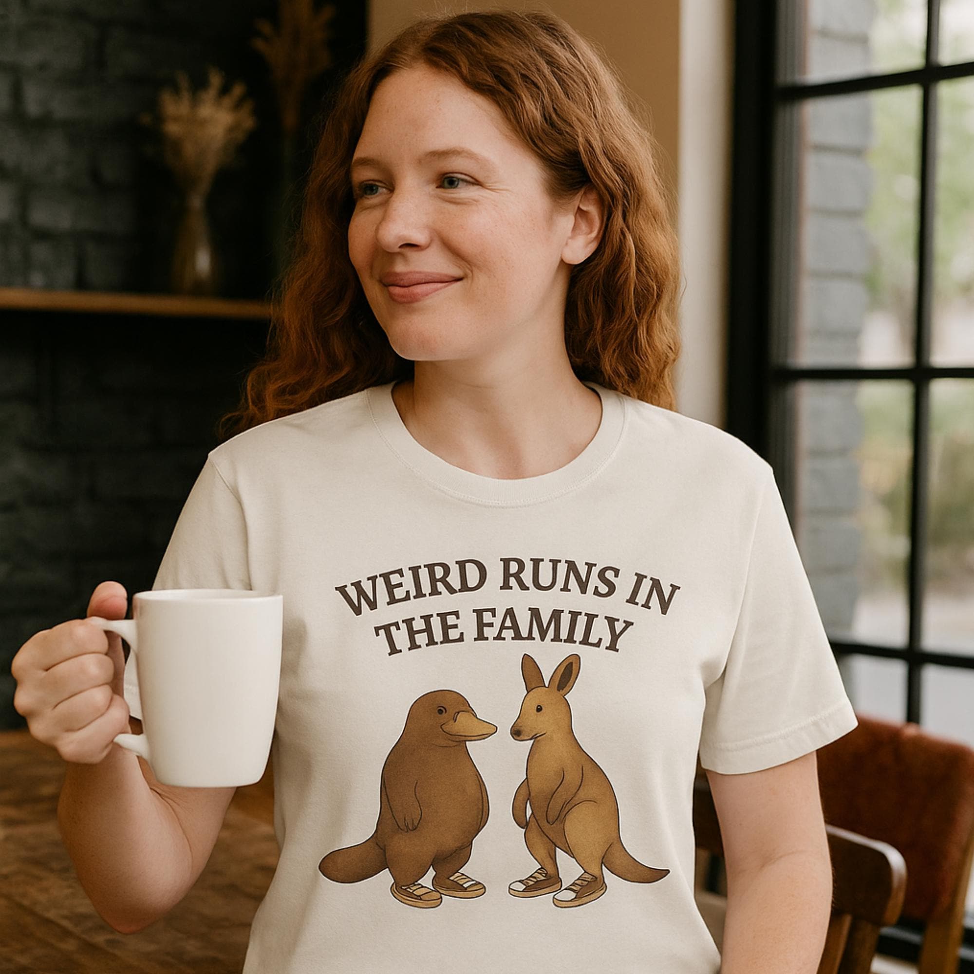 Celebrate your unique family reunion dynamic with a shirt that says it all: "Weird Runs in the Family." Featuring an adorable platypus and kangaroo duo rocking sneakers, this tee is perfect for anyone who embraces their quirks with pride. Great as a gift for siblings, cousins, parents, or your chosen family, it’s a conversation starter for every occasion.