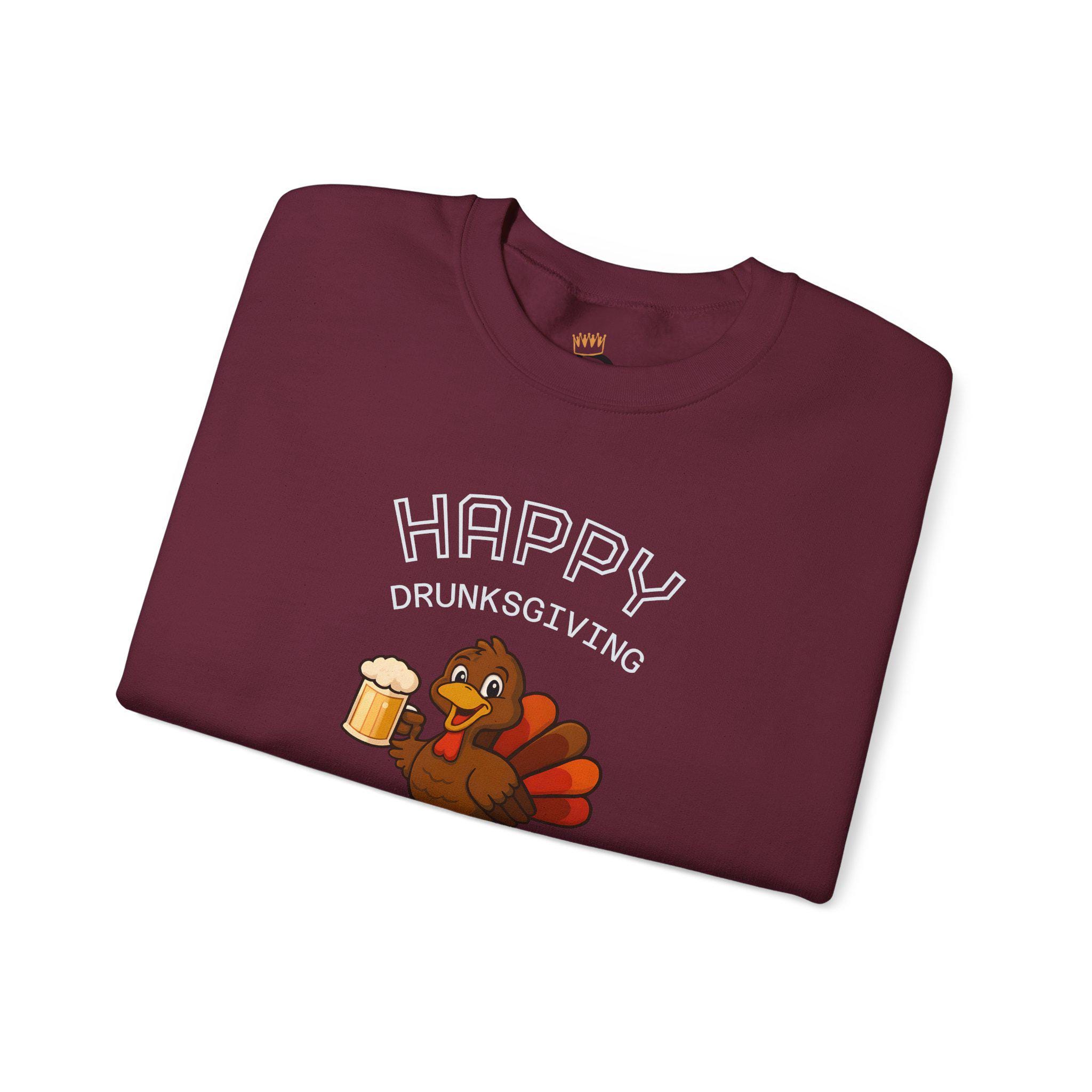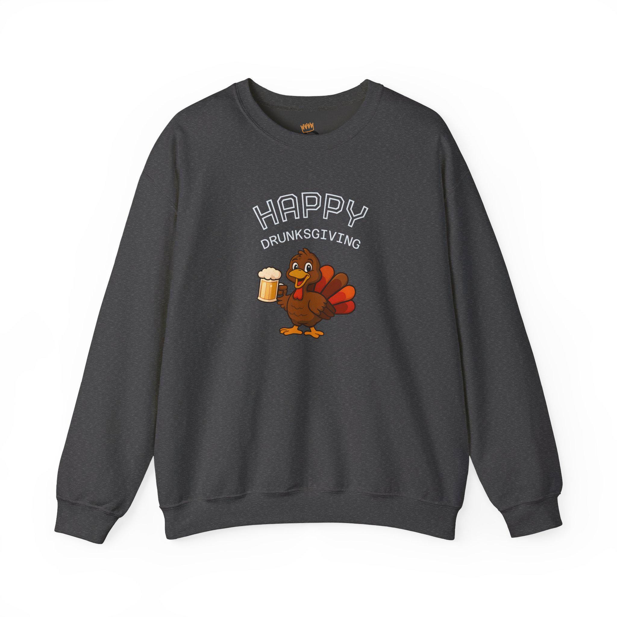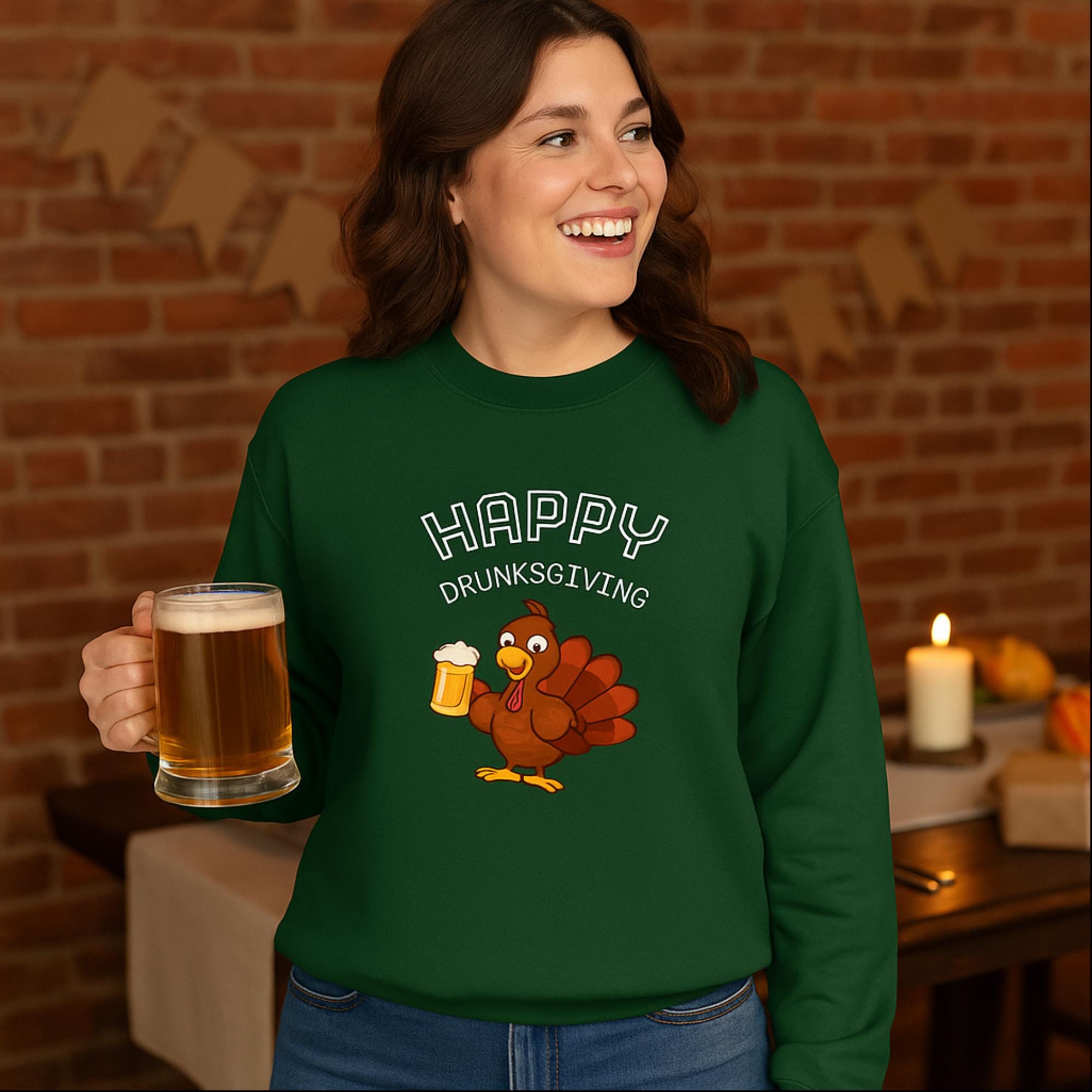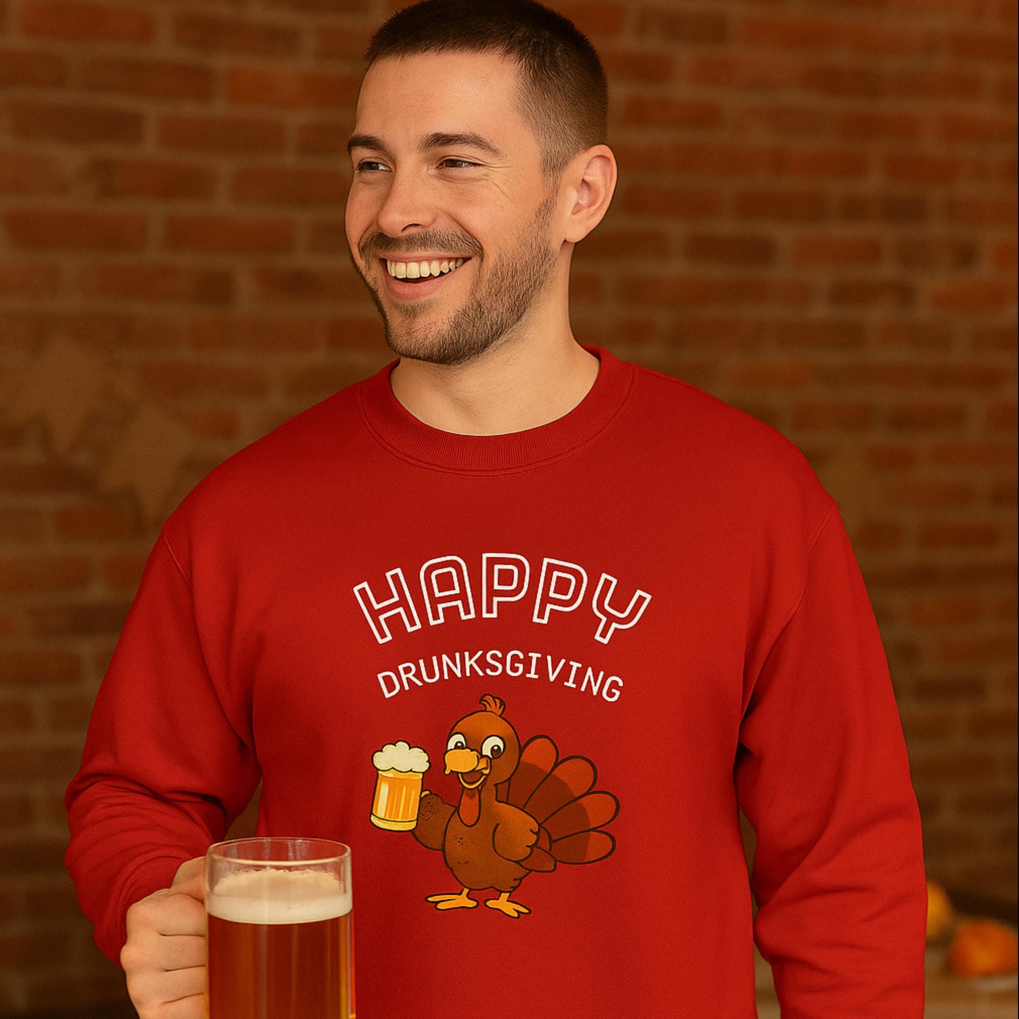 Celebrate Thanksgiving the fun way with our Happy Drunksgiving Sweatshirt — the perfect pick for turkey day laughs, Friendsgiving parties, or just lounging with a cold one. Featuring a cartoon turkey proudly holding a beer, this cozy Gildan 18000 crewneck brings humor, comfort, and style to your holiday gatherings.
