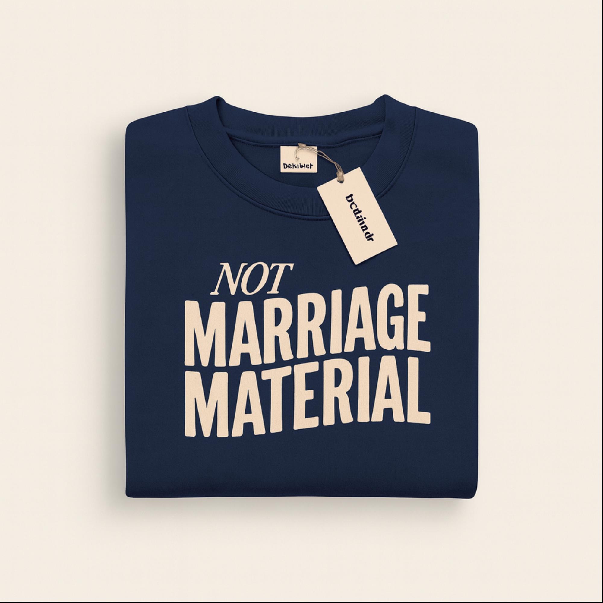 Statement text: “NOT MARRIAGE MATERIAL” in retro-inspired bold font.