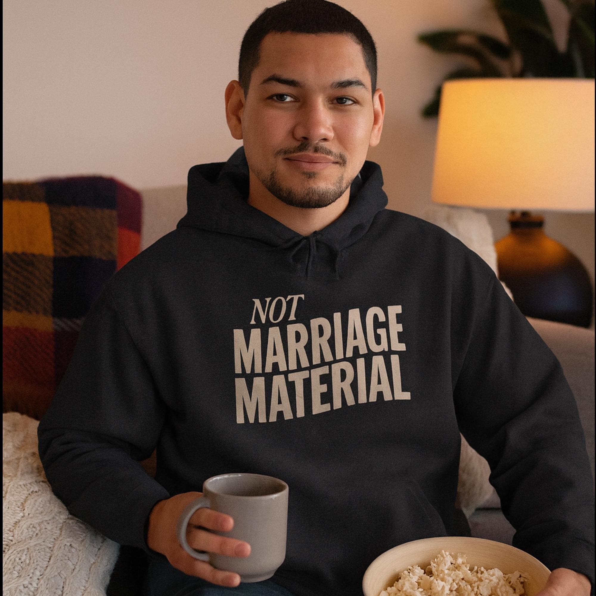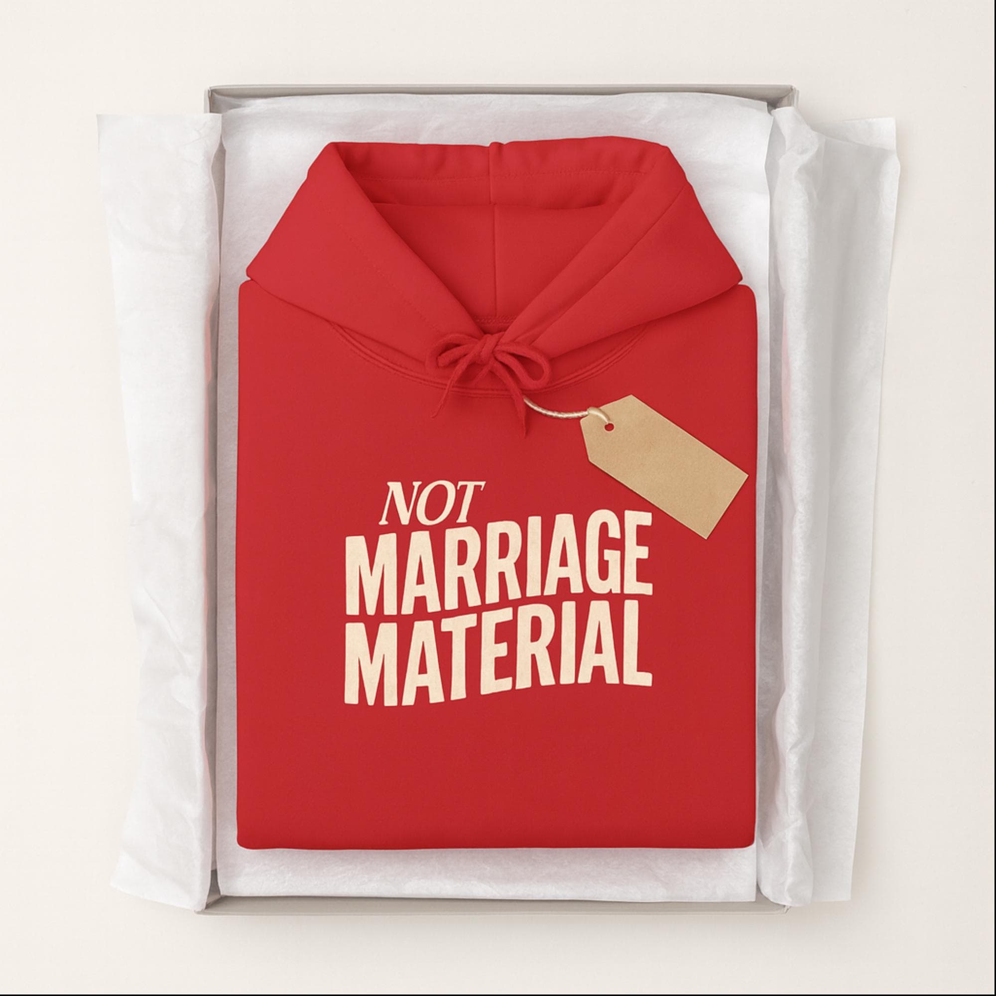 Bold text: “NOT MARRIAGE MATERIAL” in retro-inspired block lettering.