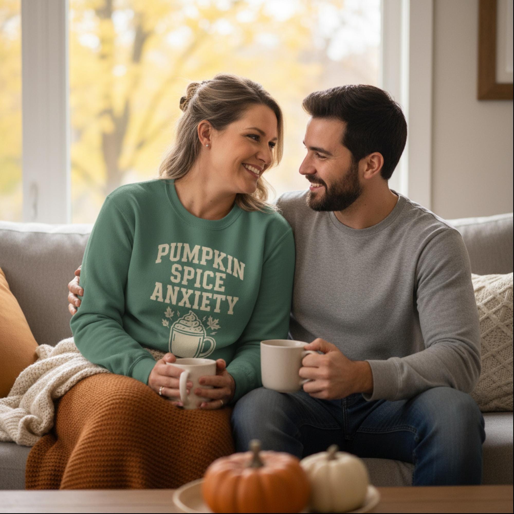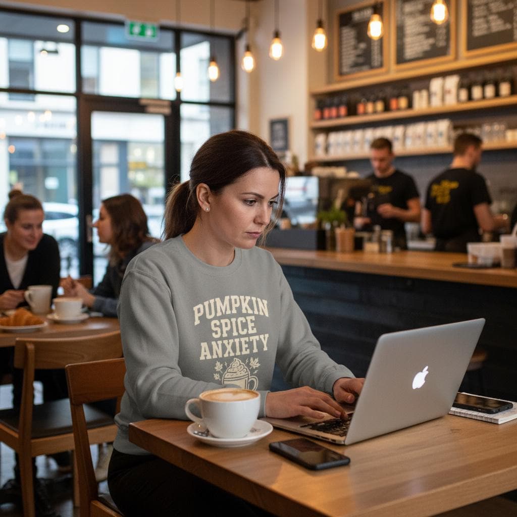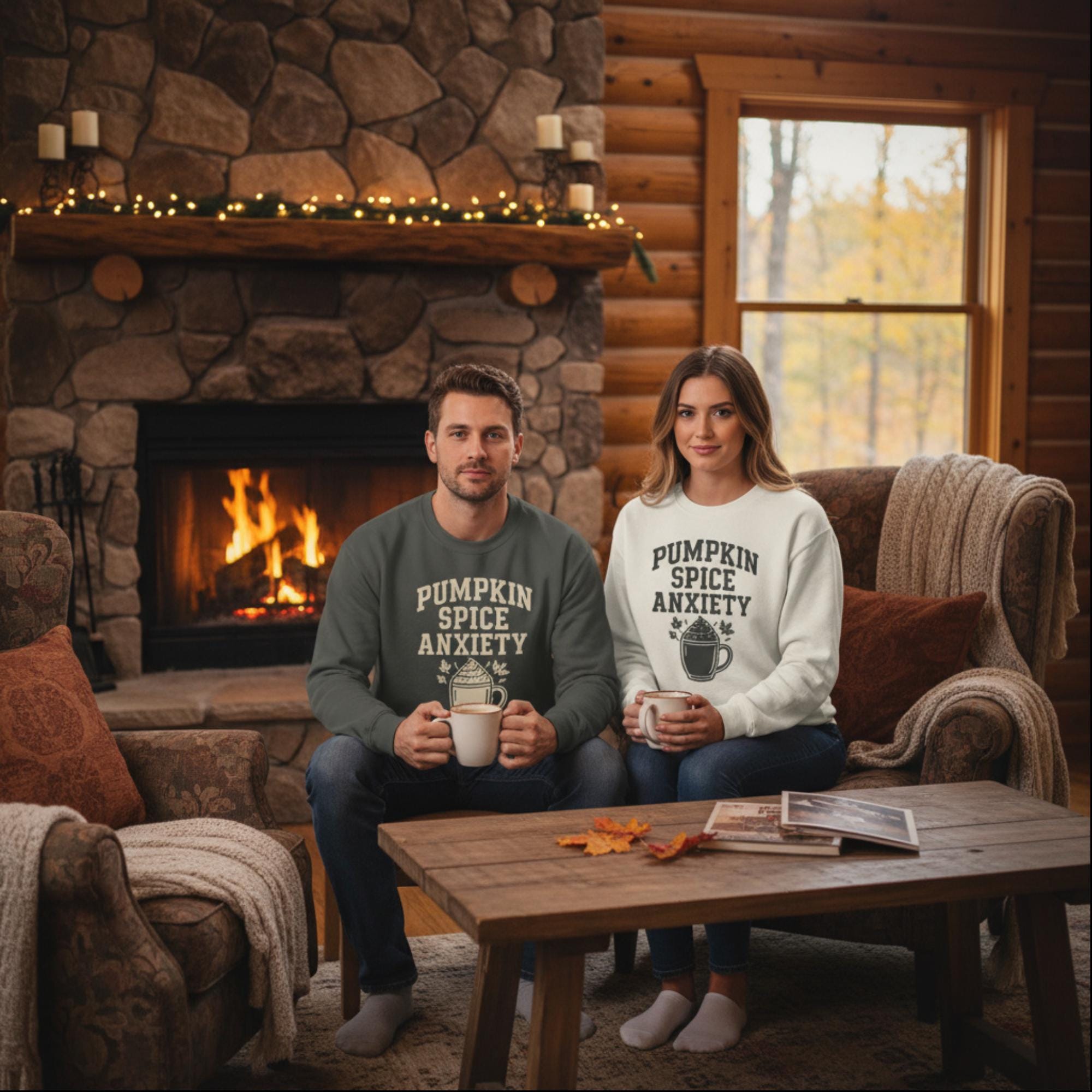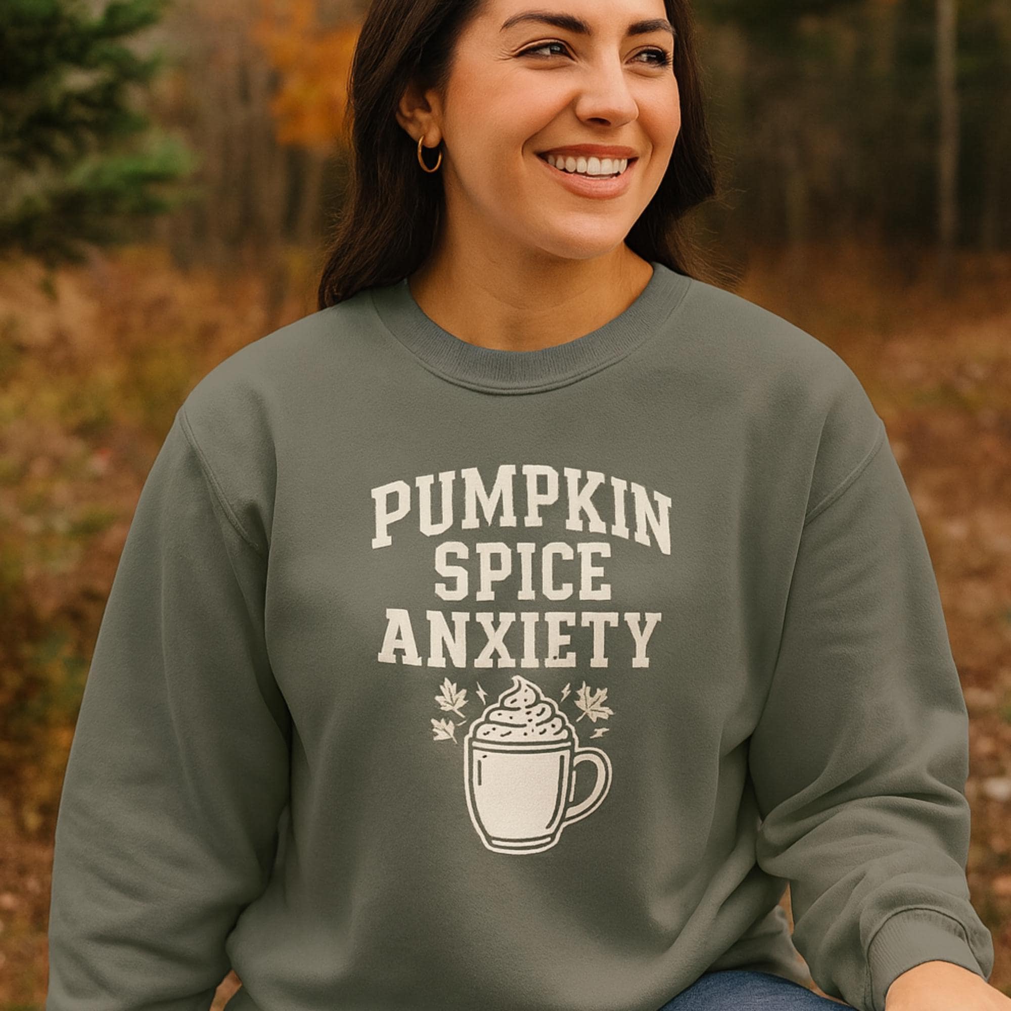 Meet your new fall PSL sweatshirt uniform: the Pumpkin Spice Anxiety sweatshirt. Cozy, sarcastic, and caffeine-fueled — this bold design is made for coffee lovers who thrive on pumpkin spice and chaos. Perfect for pumpkin patch trips, fall fairs, or curling up with a latte while the leaves fall.