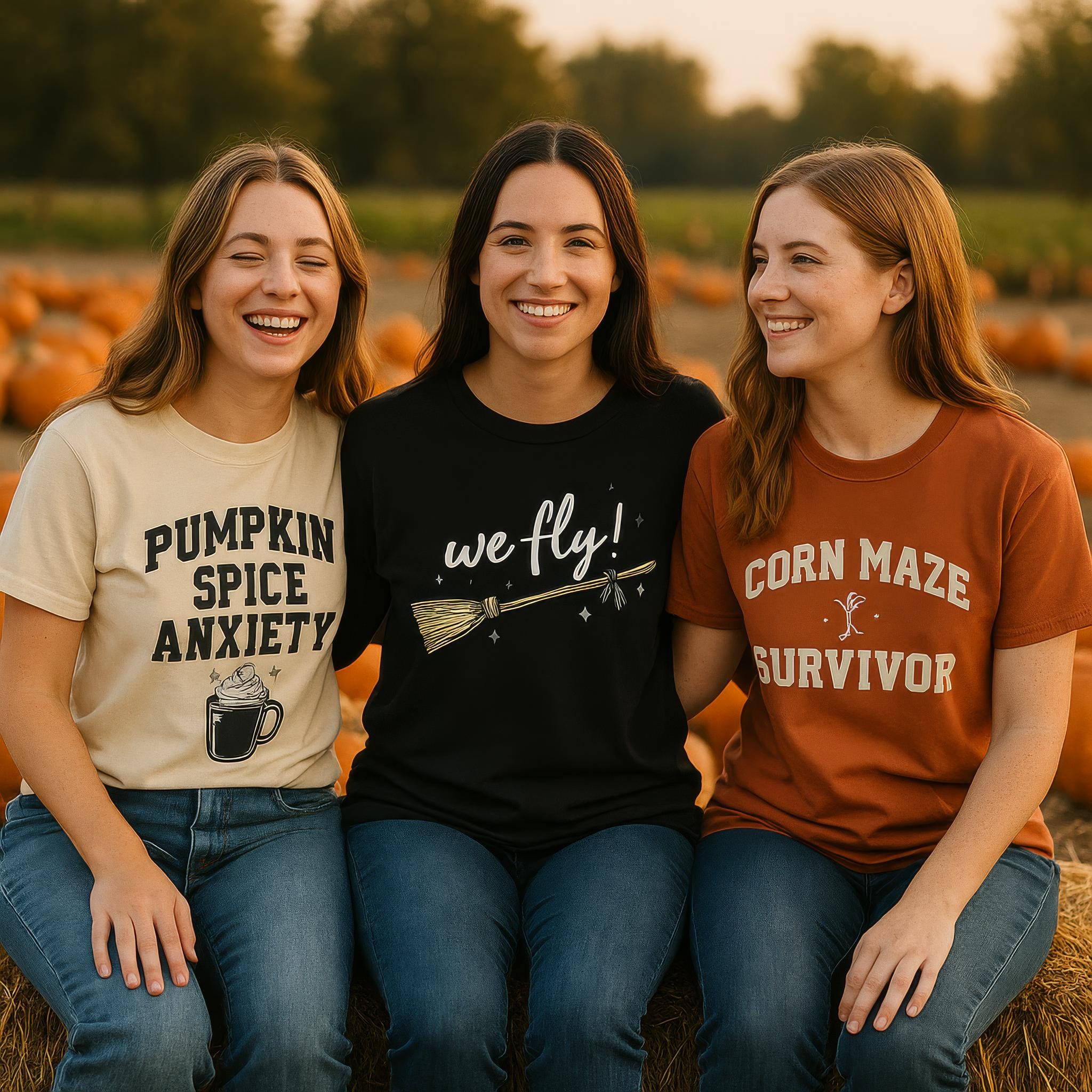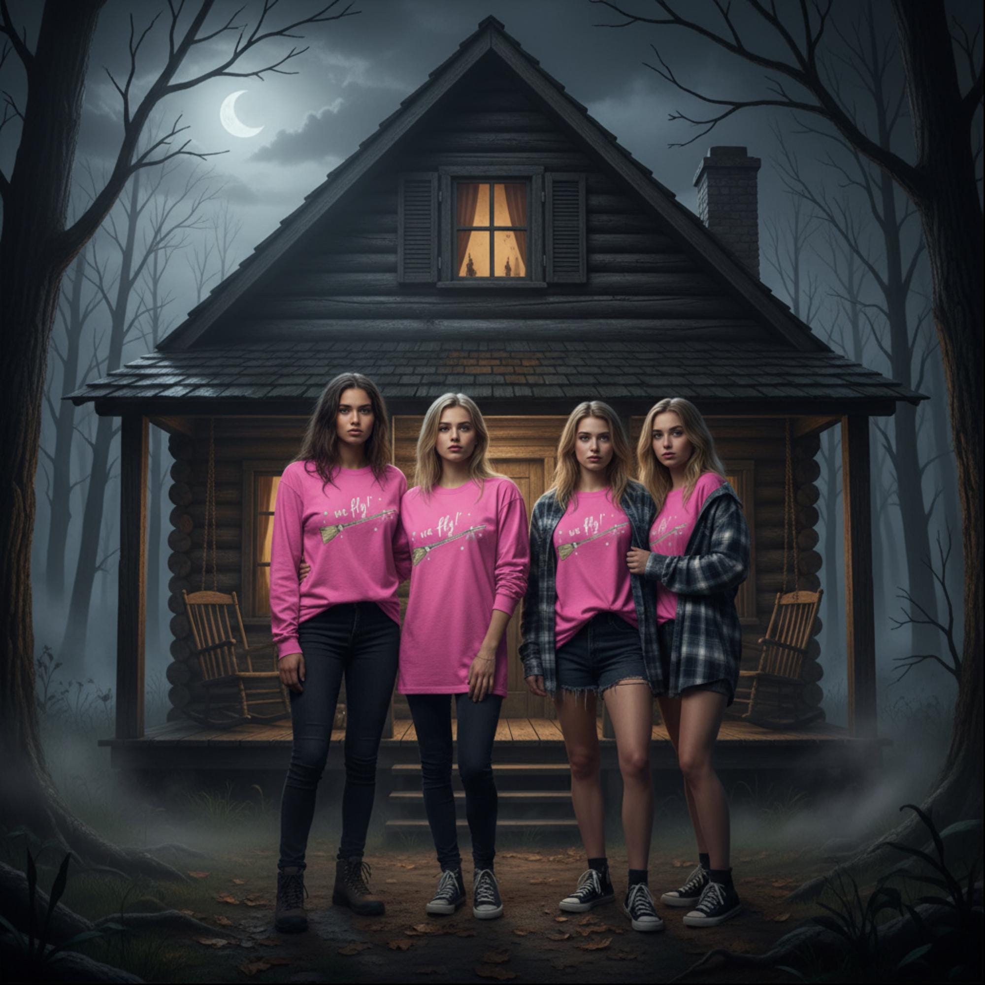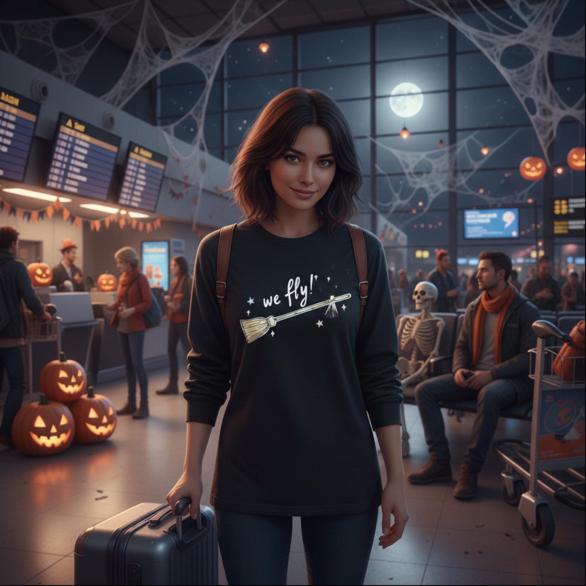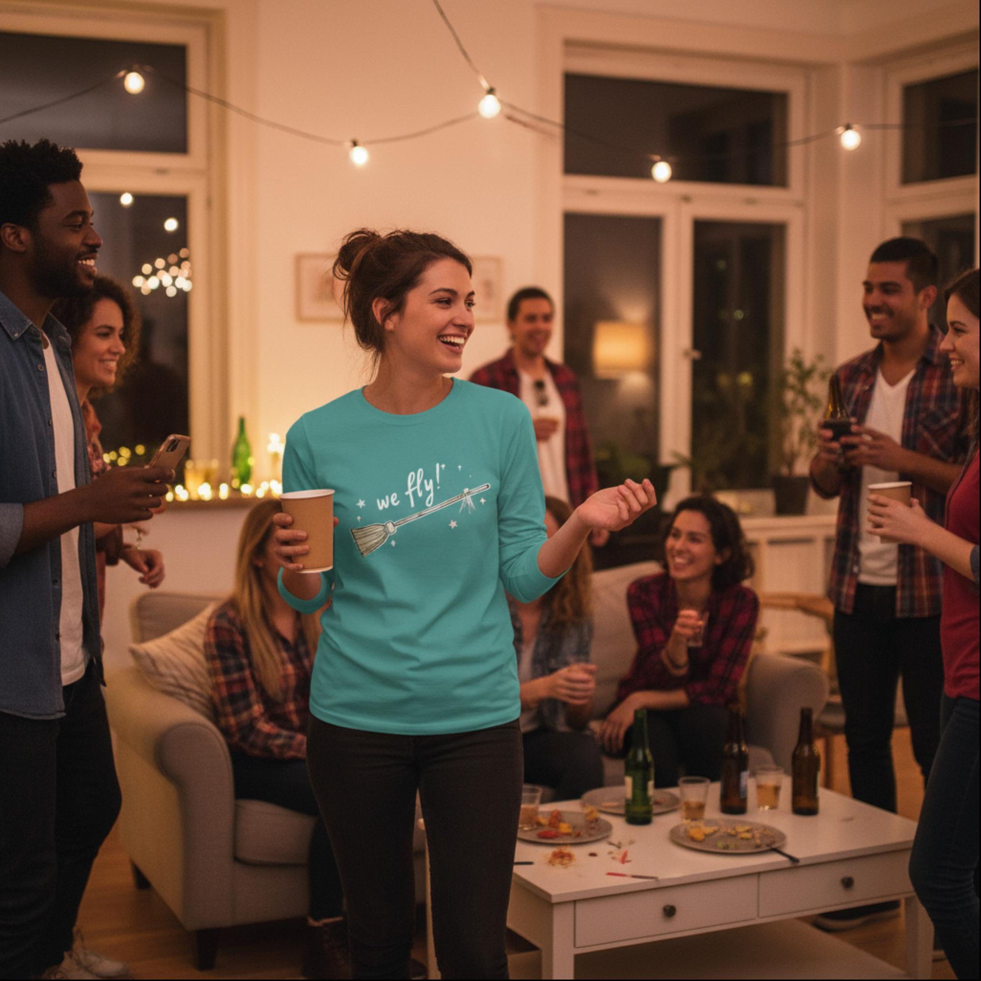 Take flight this spooky season with the We Fly Tee! Comfort Colors long-sleeve tee. Featuring a playful broomstick design surrounded by pastel stars and bold script text, this shirt is perfect for witches, dreamers, and anyone ready to celebrate Halloween in style.