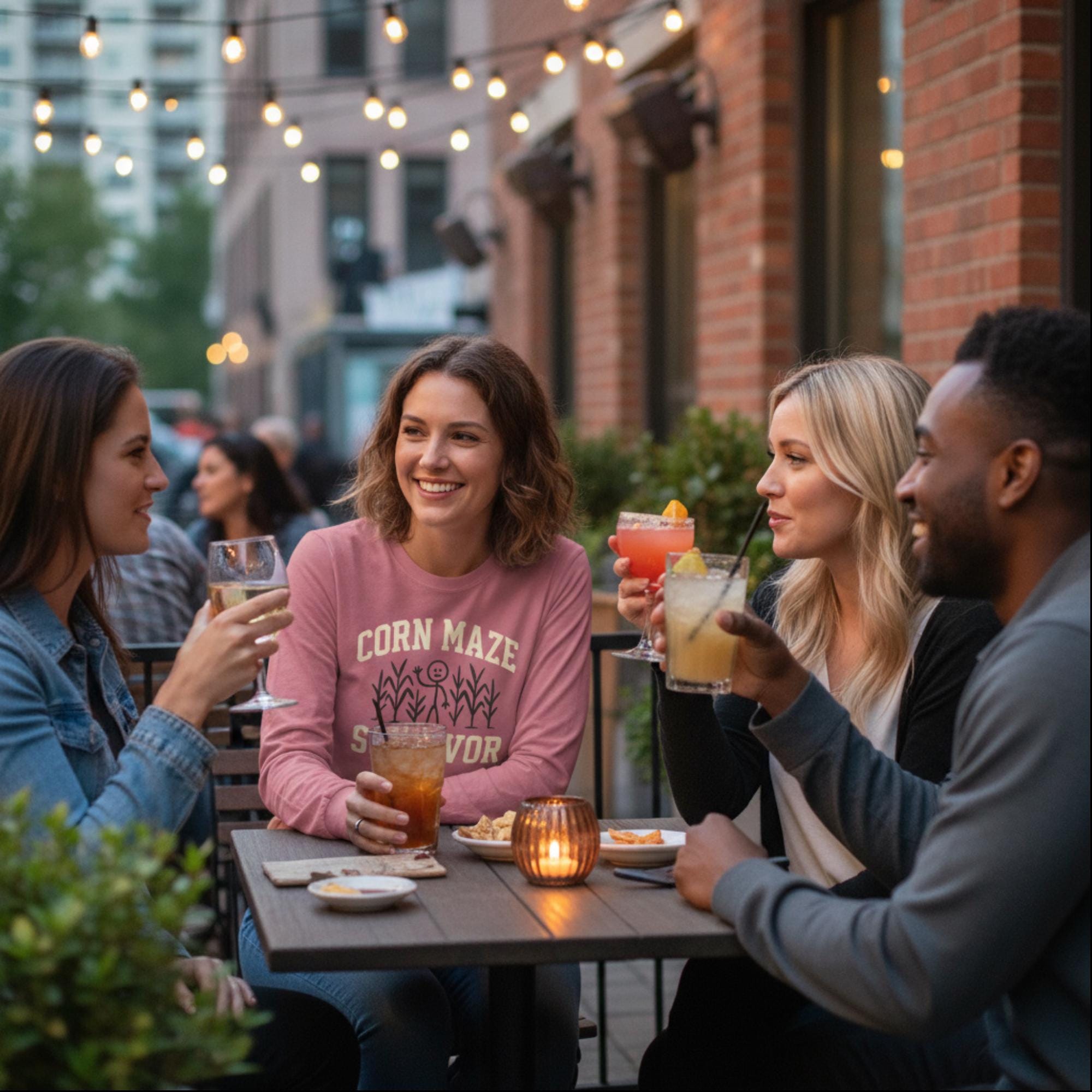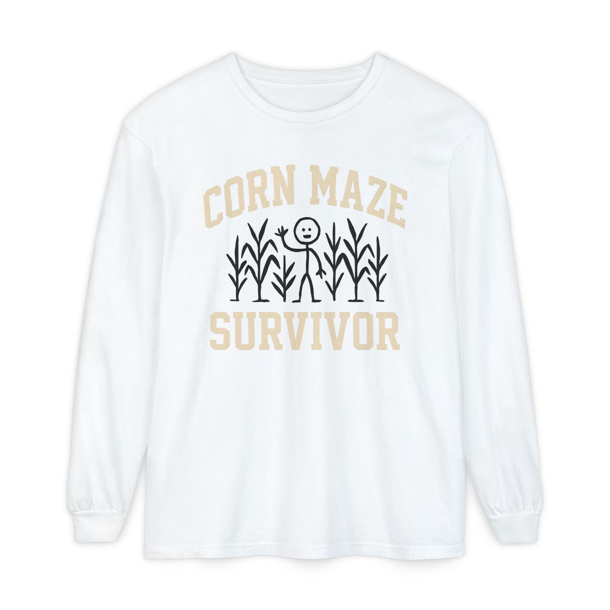 Celebrate your fall victories with the Corn Maze Survivor Comfort Colors long sleeve top. Featuring bold varsity lettering and a playful stick figure waving from the corn stalks, this shirt is the ultimate badge of honor for anyone who’s ever gotten lost—and found their way out.