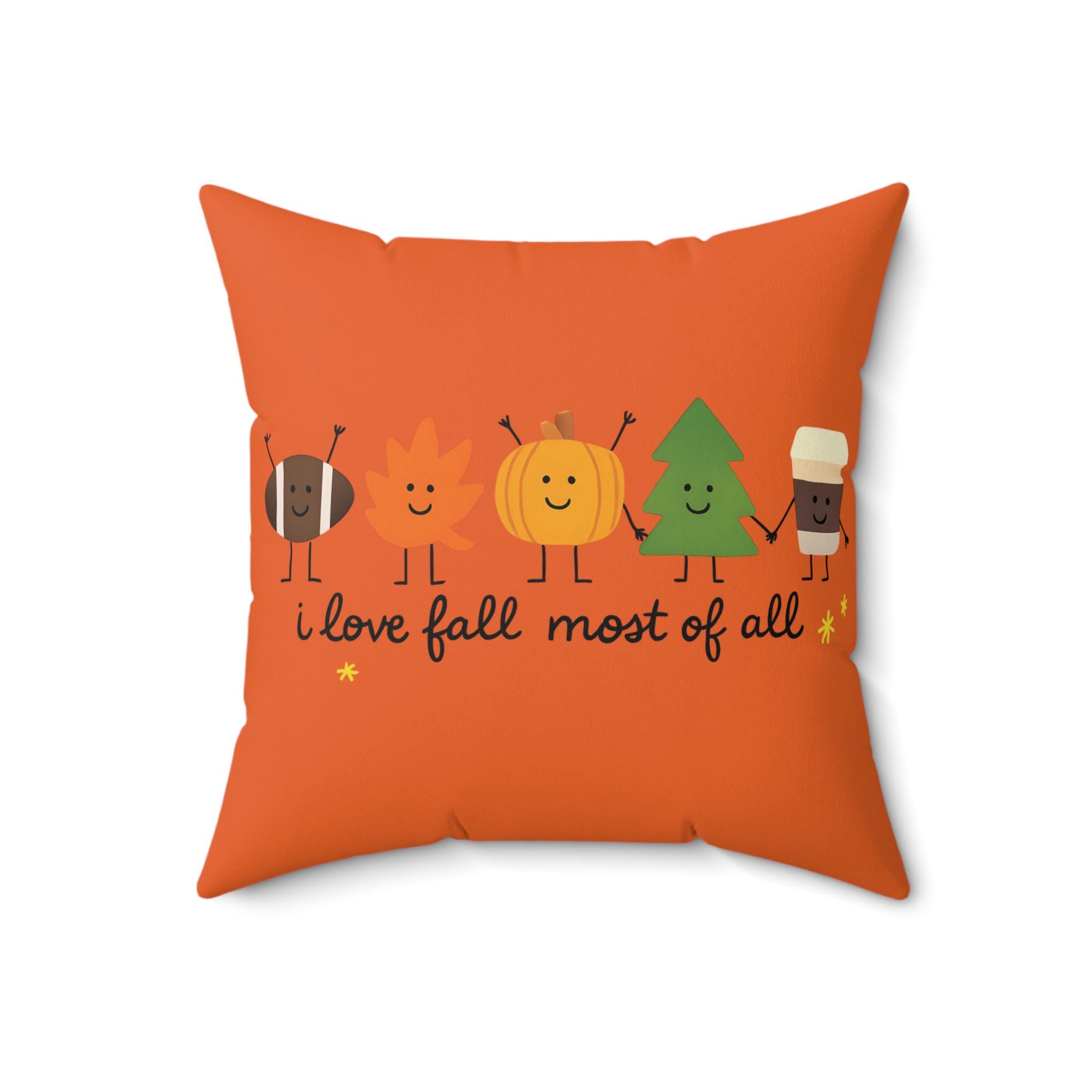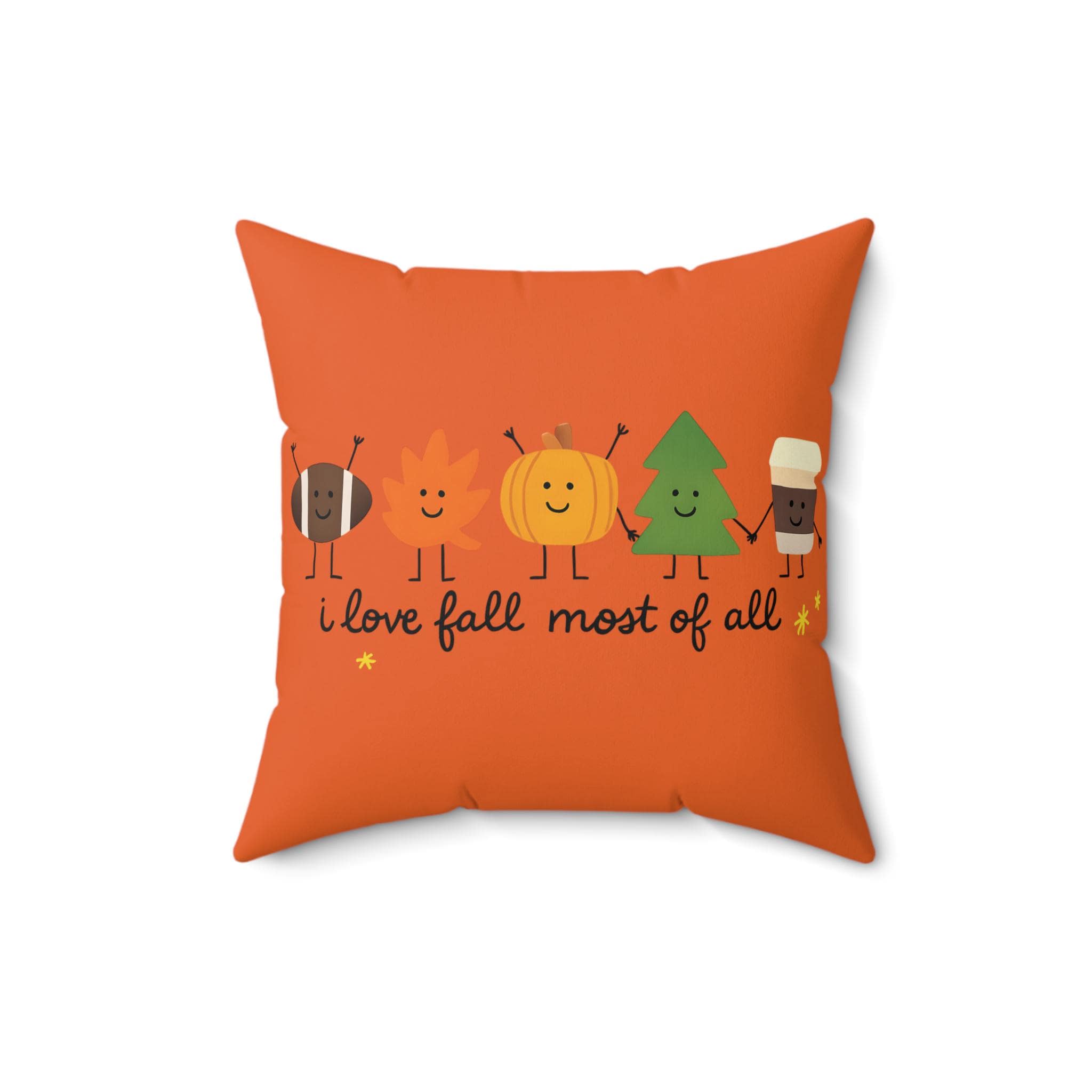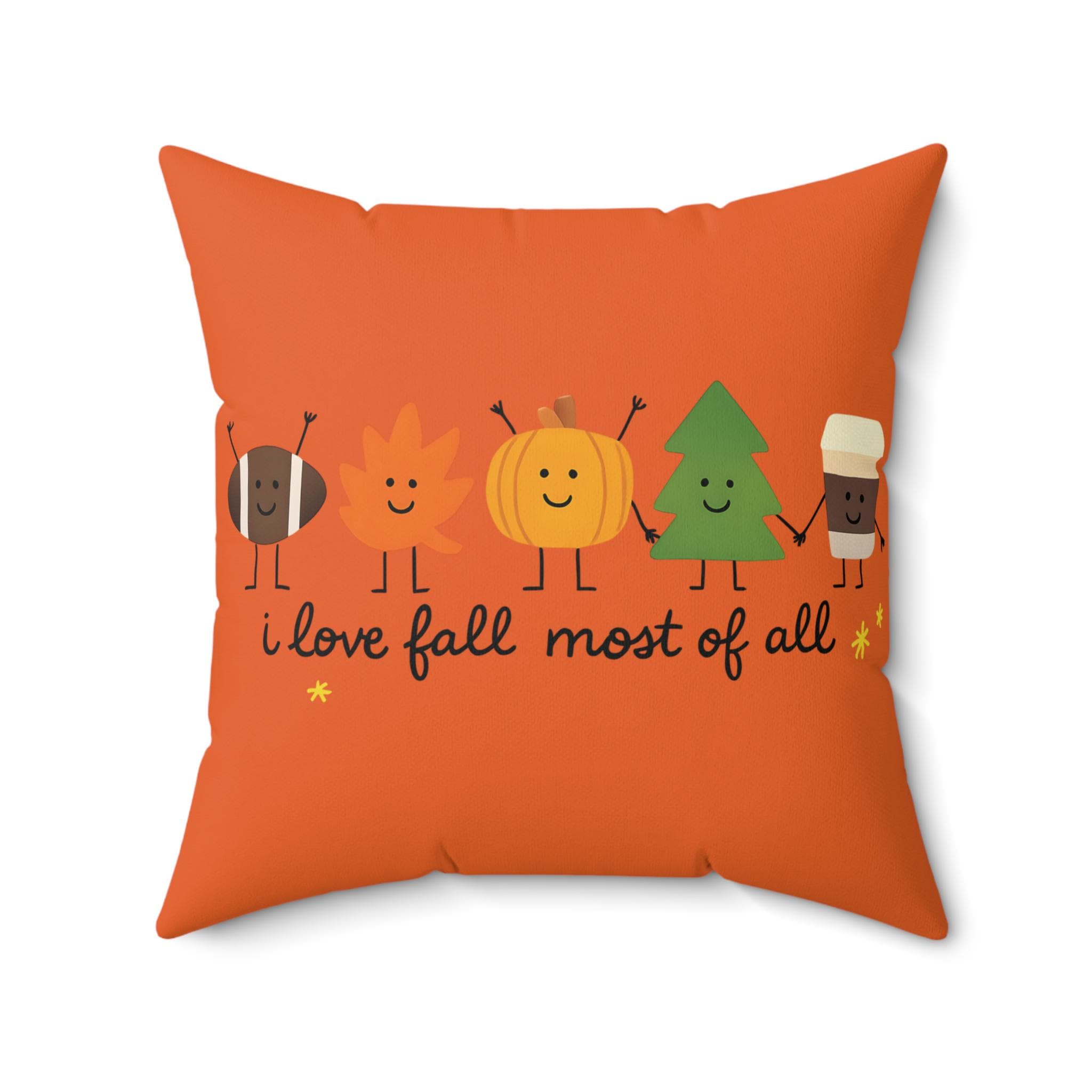 Featuring smiling seasonal icons—a football, maple leaf, pumpkin, evergreen tree, and marshmallow—all holding hands beneath the heartwarming phrase “I love fall most of all.” This vibrant orange pillow instantly adds a pop of color and charm to your living room, bedroom, entryway, or porch.