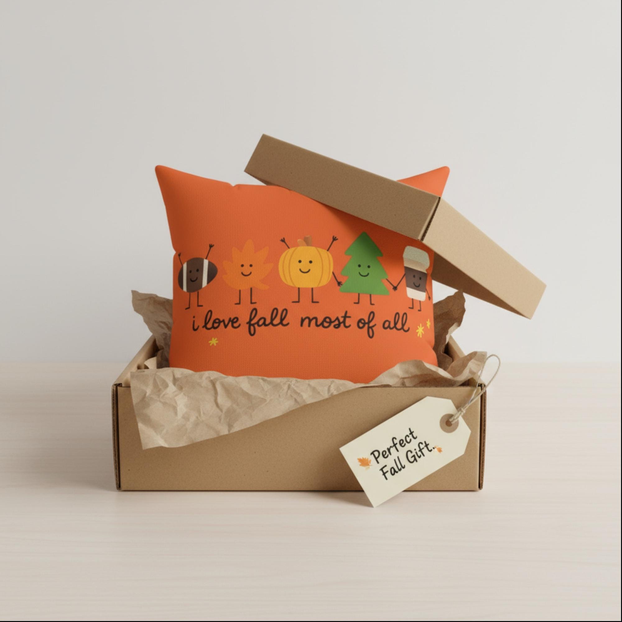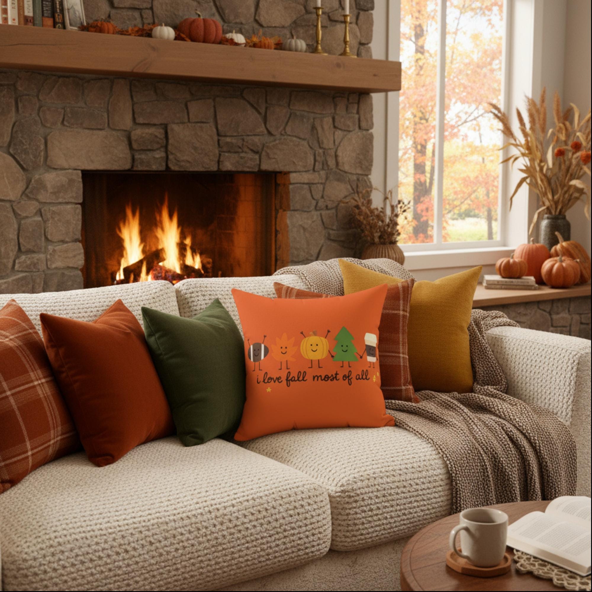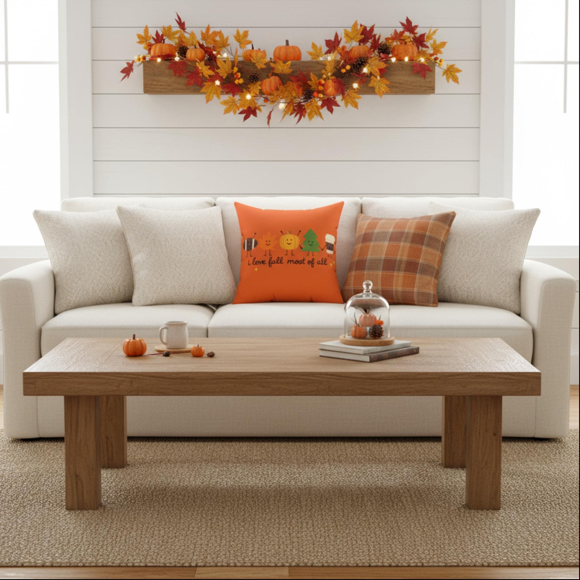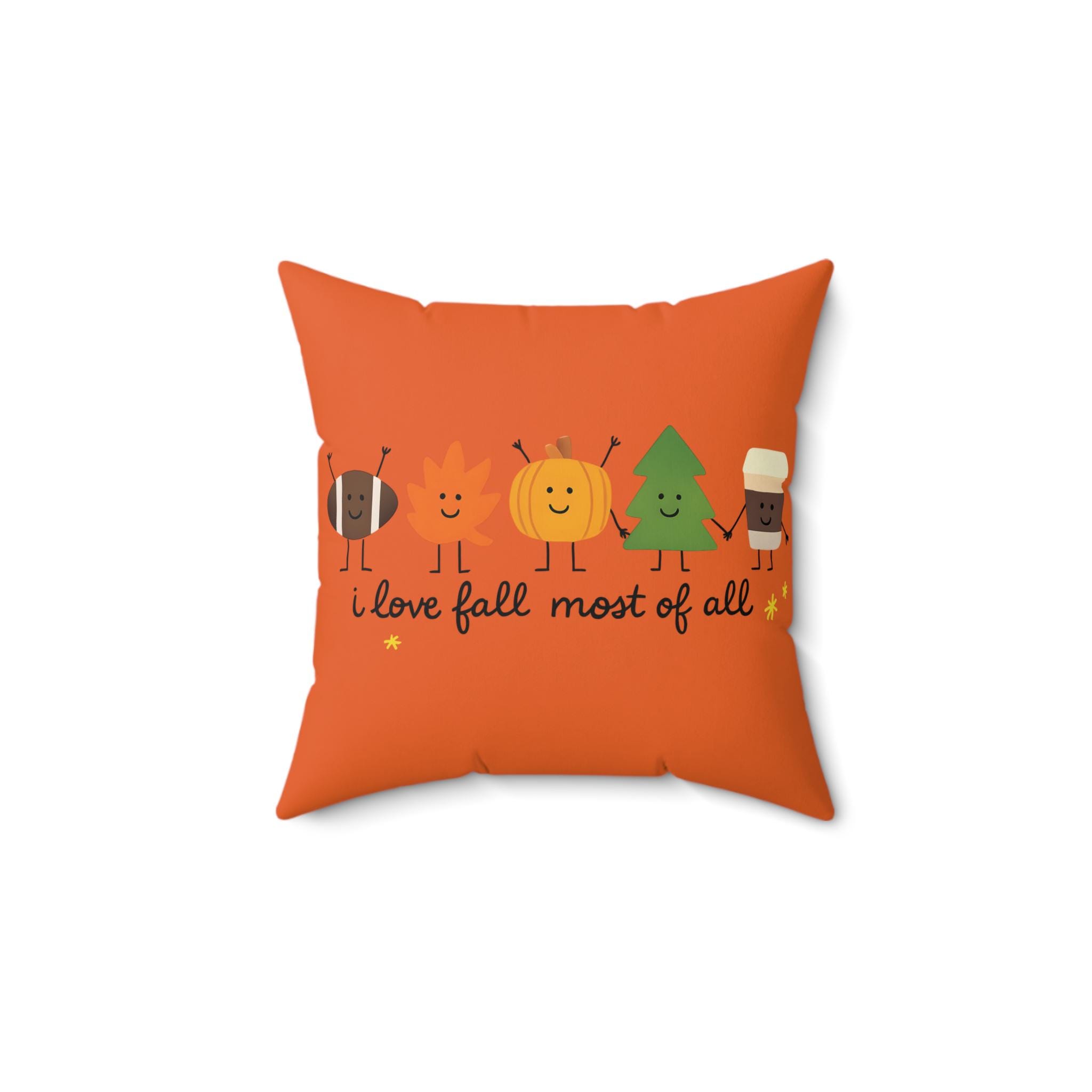 Featuring smiling seasonal icons—a football, maple leaf, pumpkin, evergreen tree, and marshmallow—all holding hands beneath the heartwarming phrase “I love fall most of all.” This vibrant orange pillow instantly adds a pop of color and charm to your living room, bedroom, entryway, or porch.