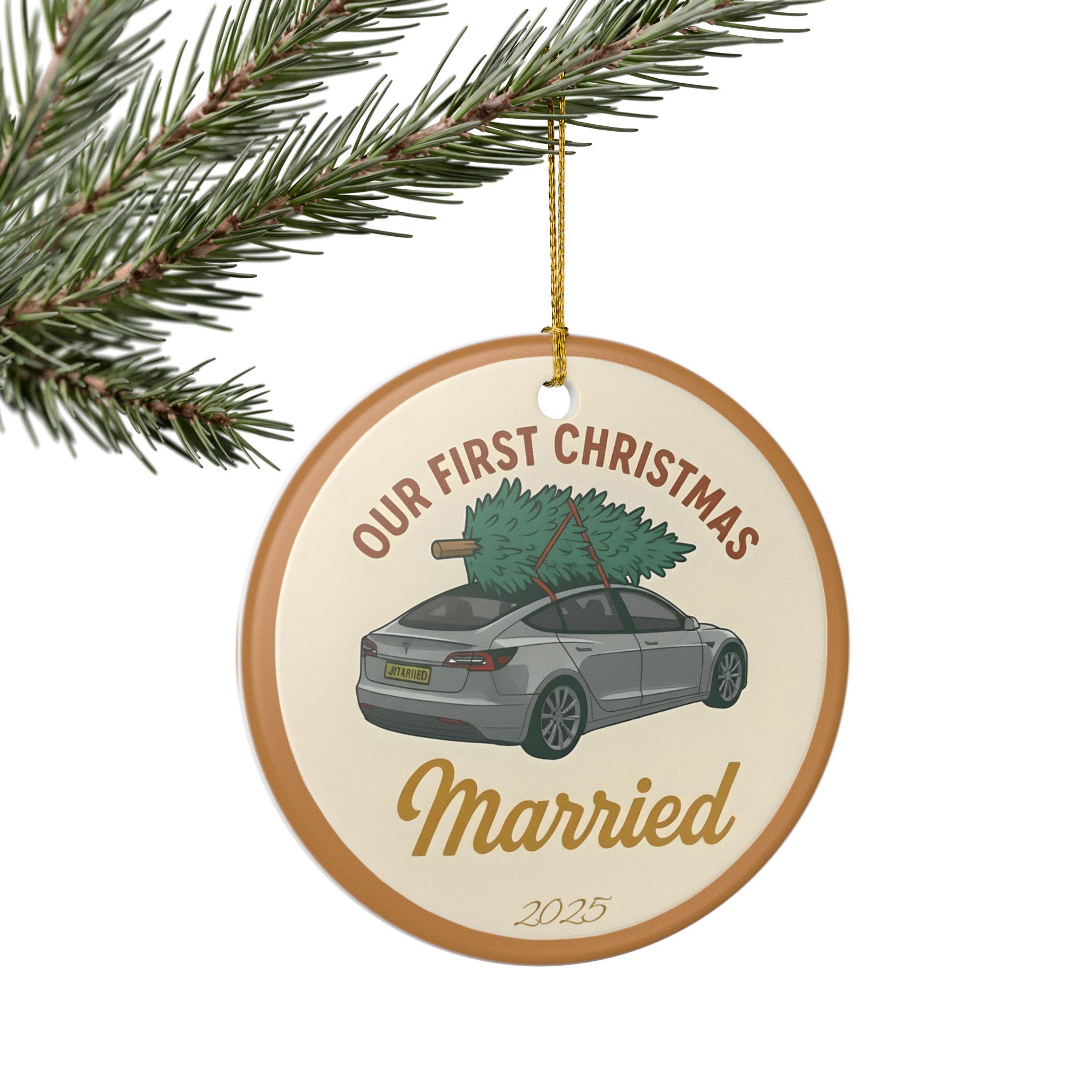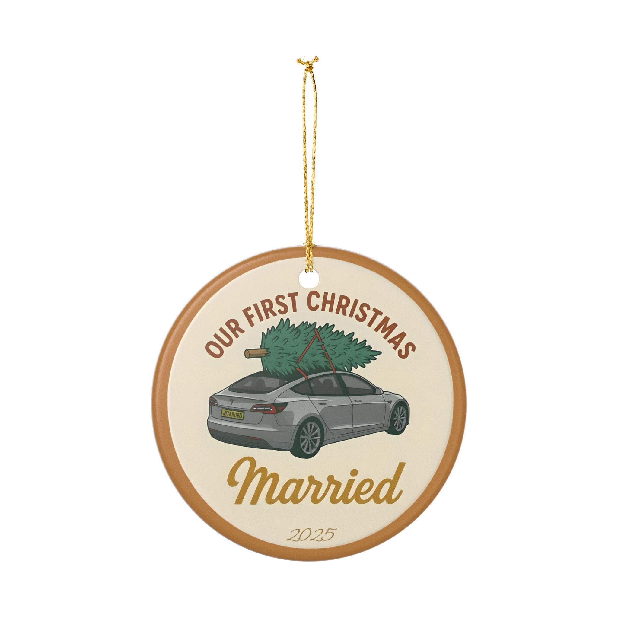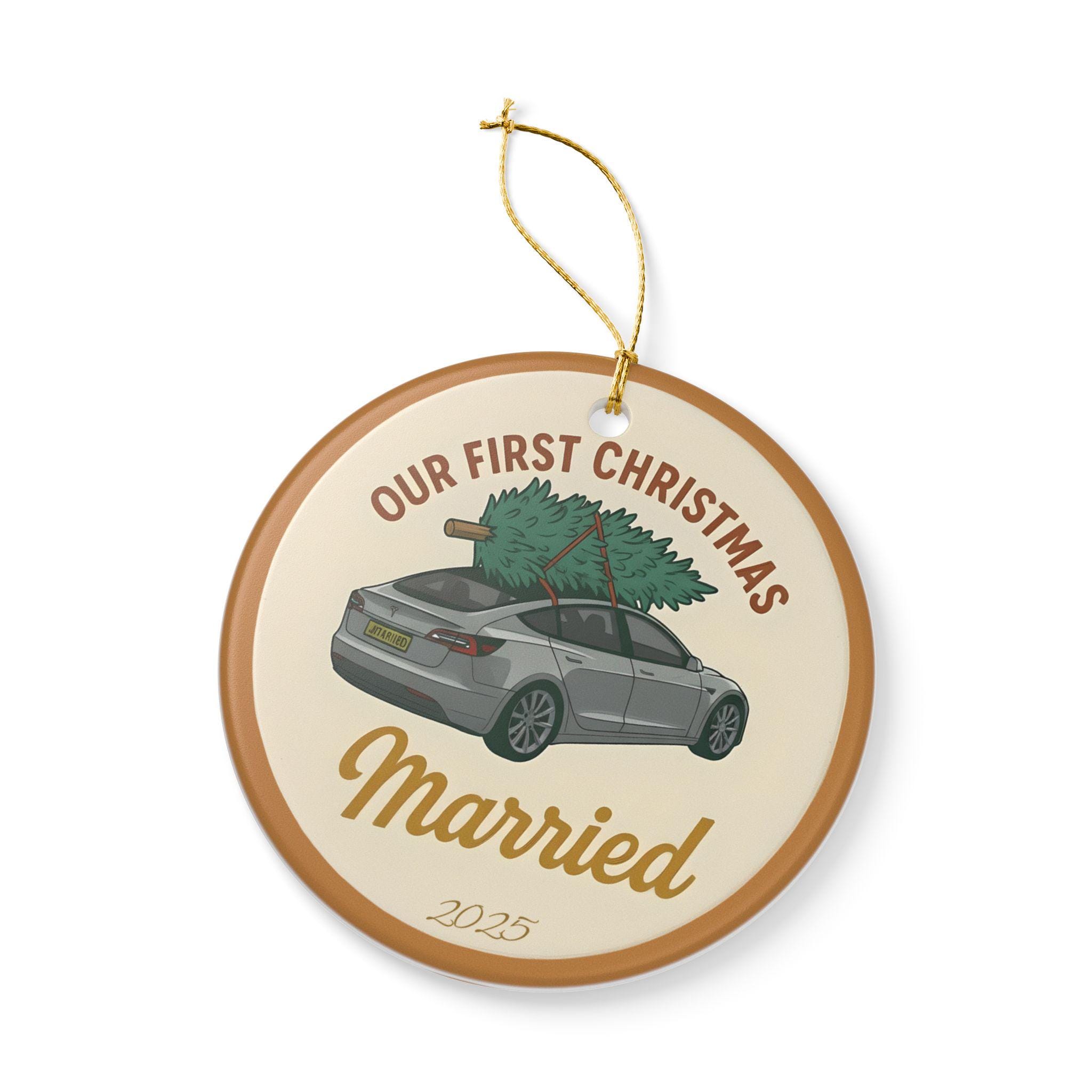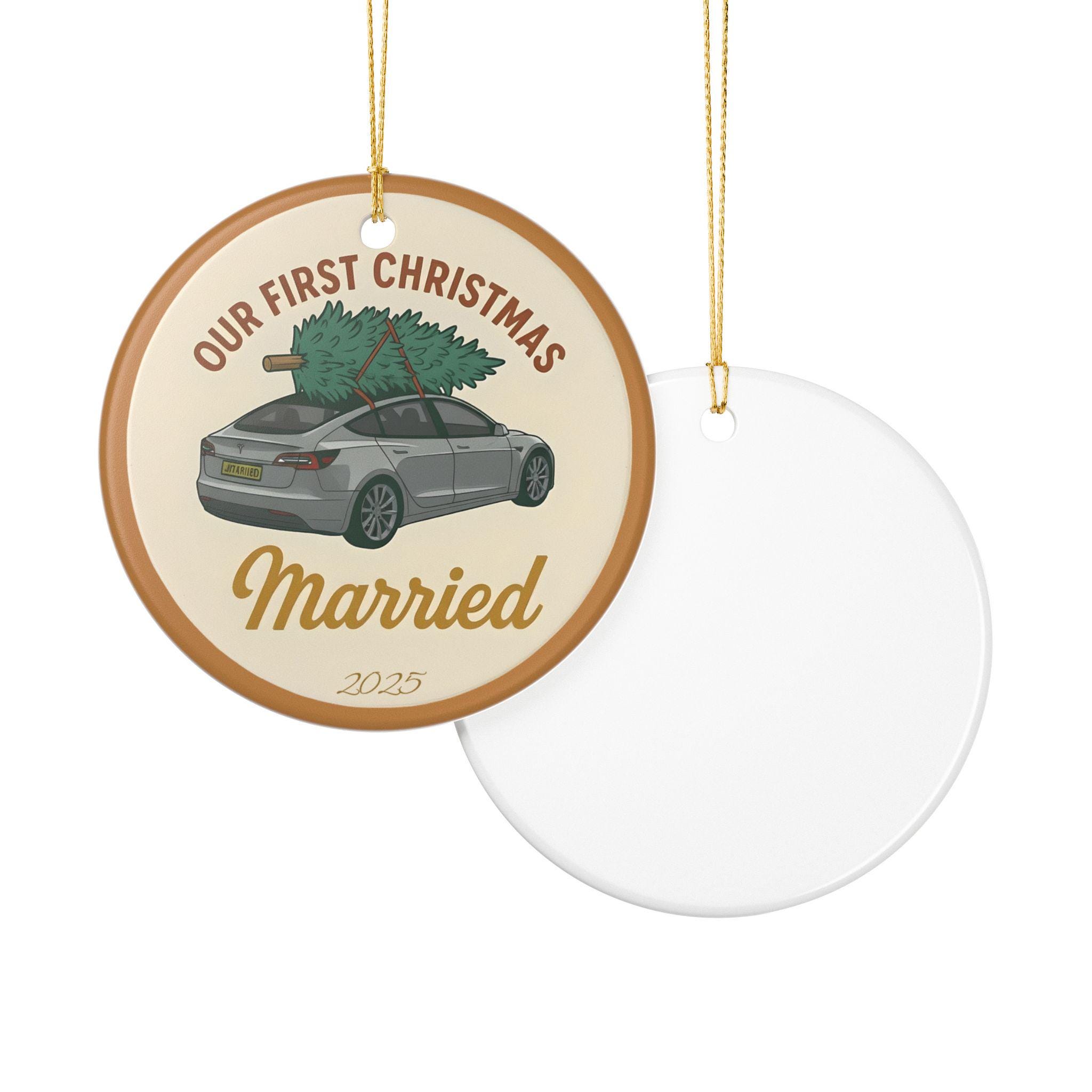 Celebrate your special milestone with this personalized wedding keepsake ornament, the perfect First Christmas married ceramic decoration for newlyweds. Crafted from high-quality 100% white ceramic, this elegant ornament features a glossy finish that adds a sophisticated touch to your holiday décor. Its charming design showcases a stylish car carrying a festive Christmas tree, complemented by the heartfelt message "Our First Christmas Married," making it a treasured keepsake of your first holiday together as a married couple.