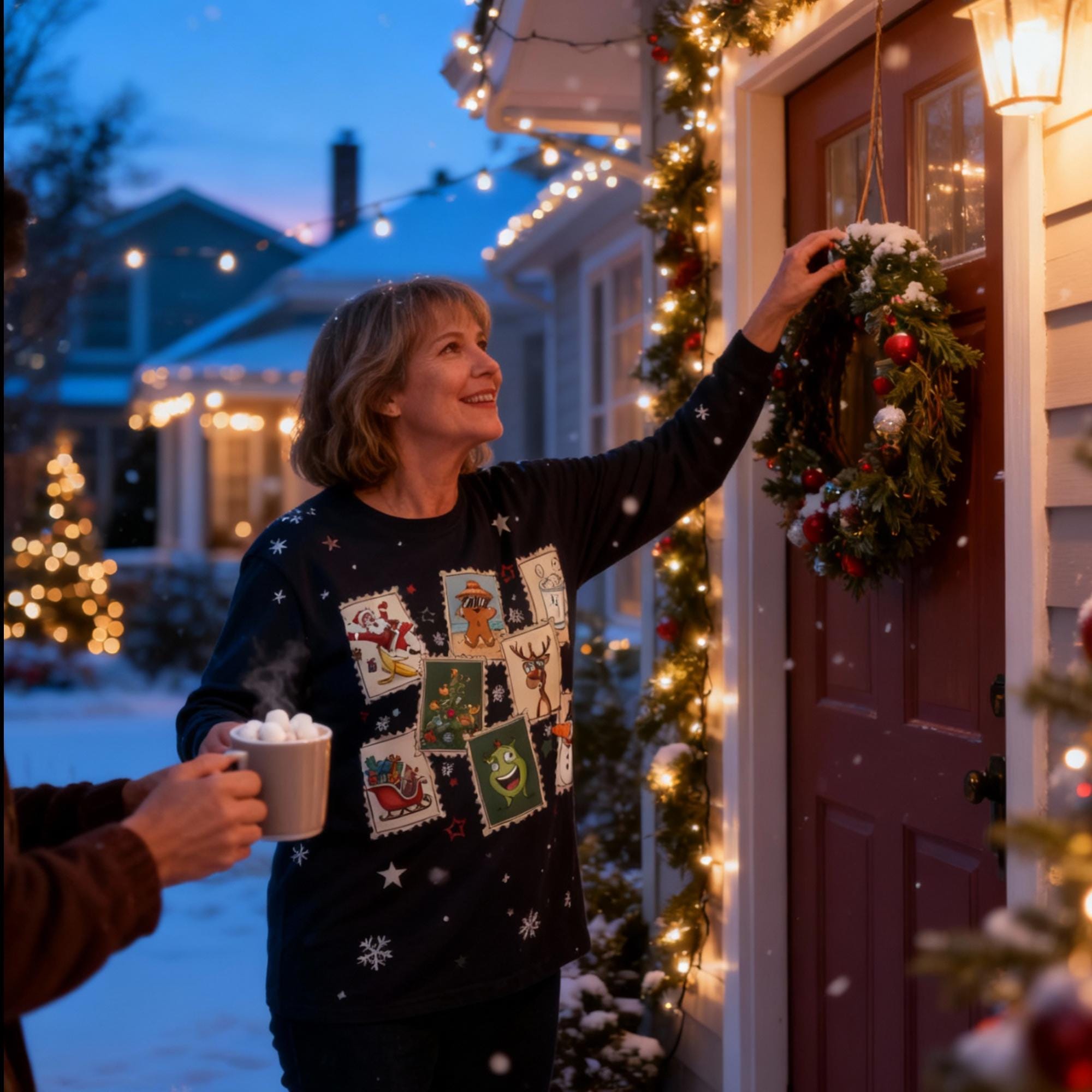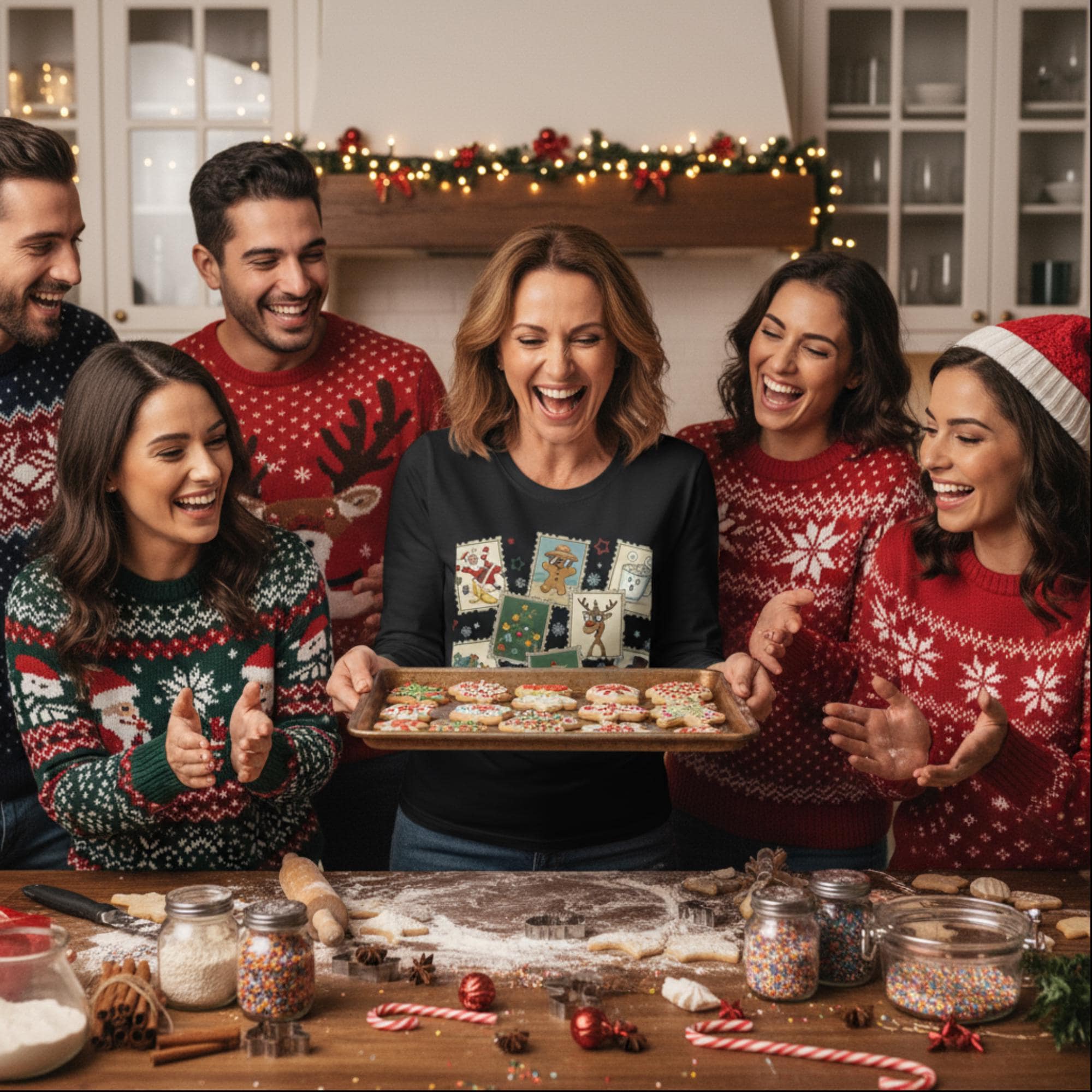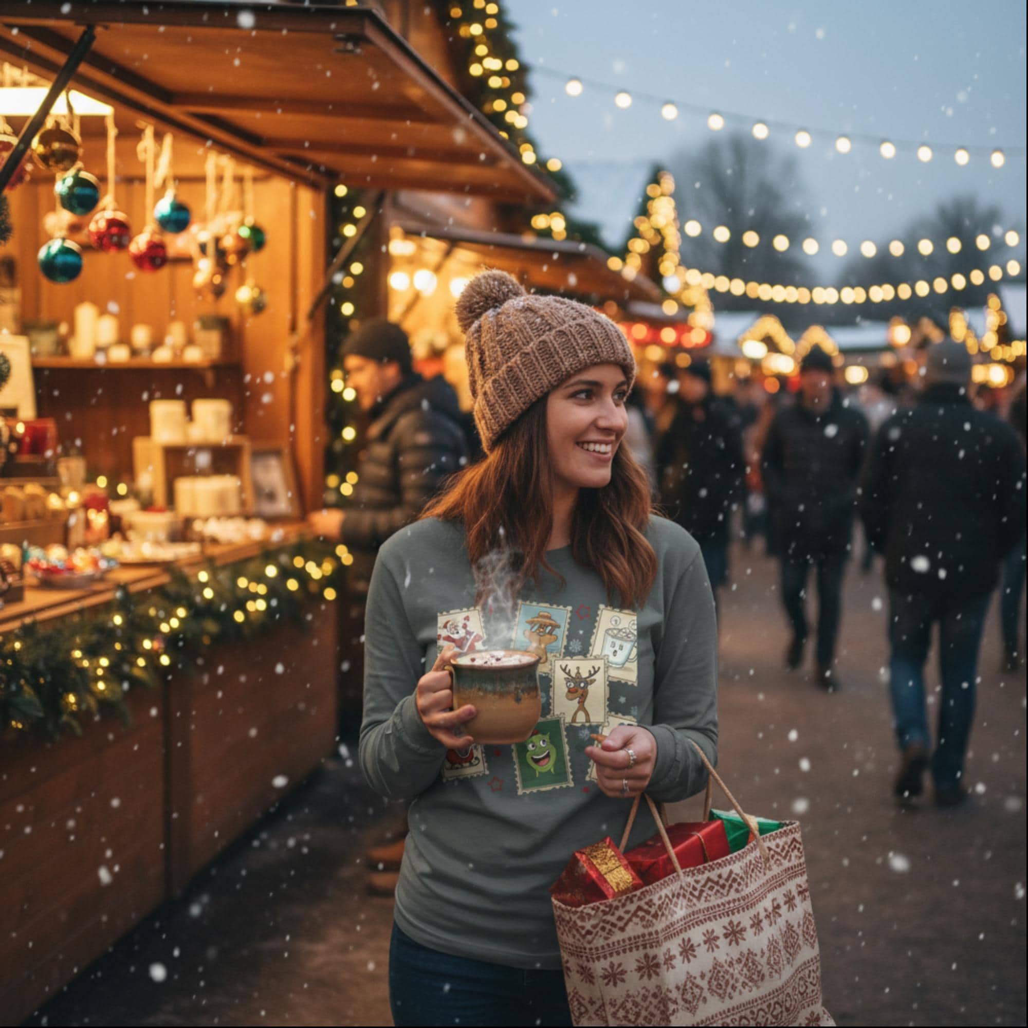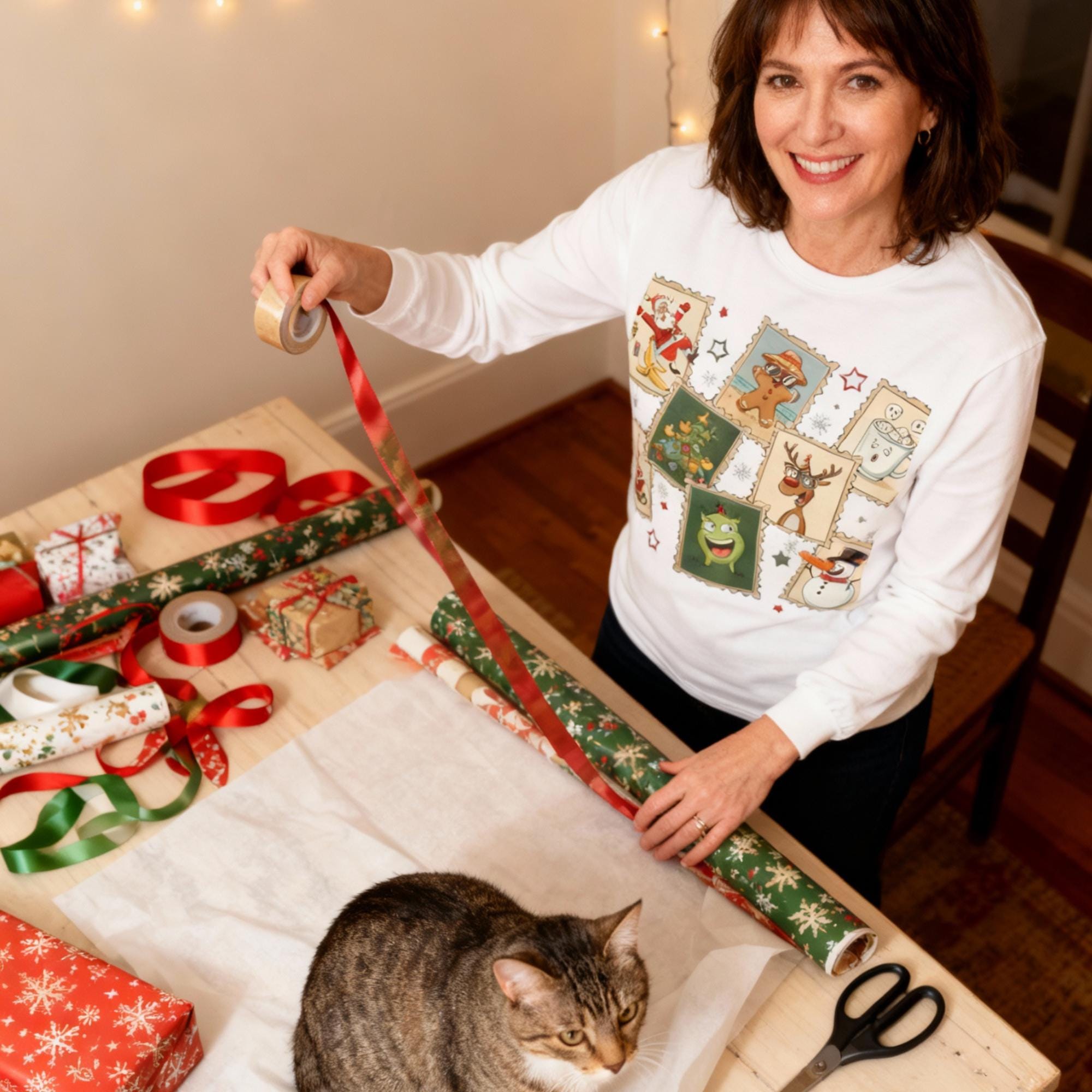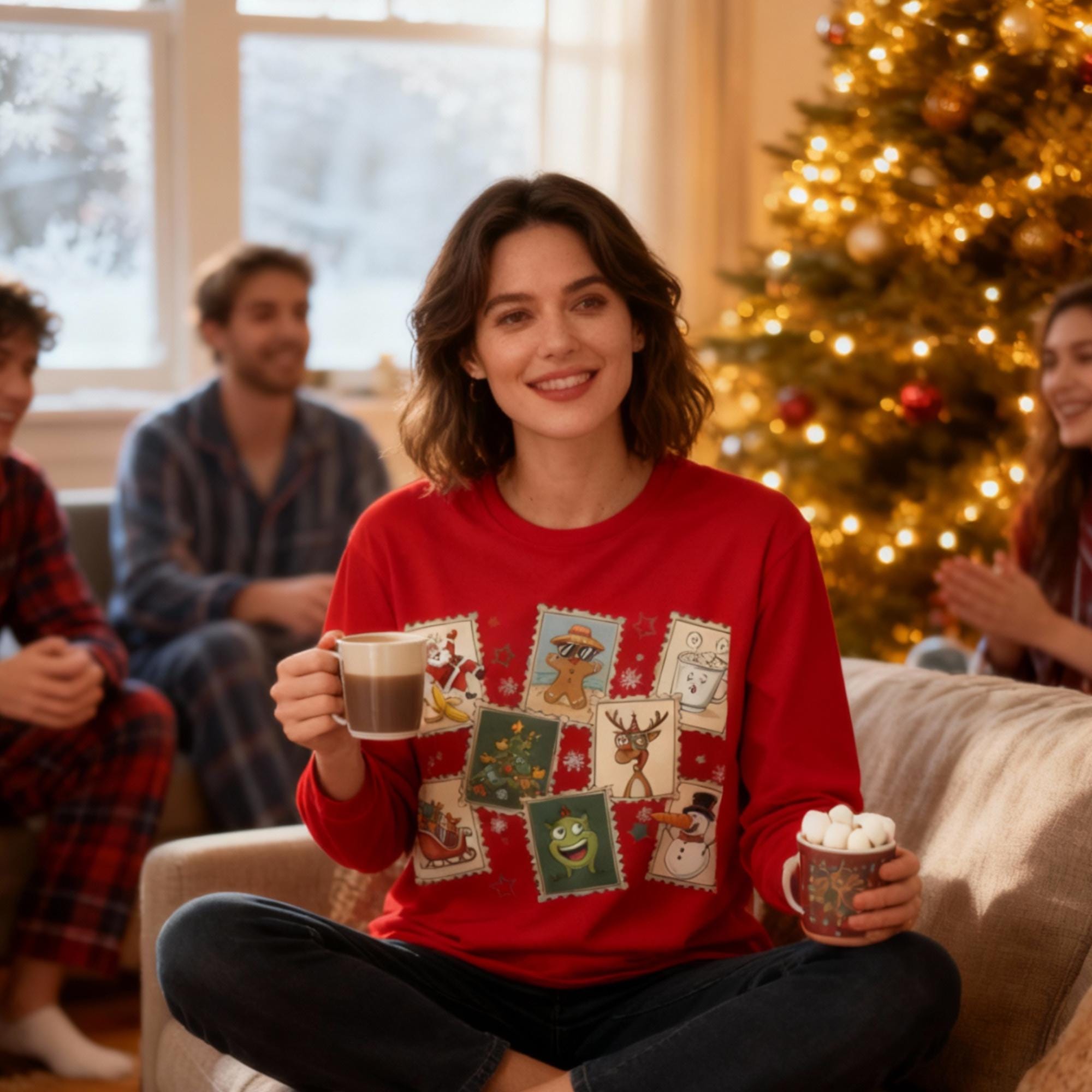 The Let’s Celebrate! Holiday Postage Stamp Long Sleeve is your new uniform for wrapping chaos, cocoa breaks, and cat interference.