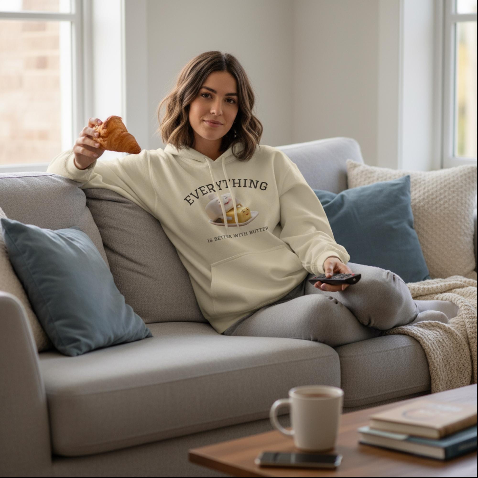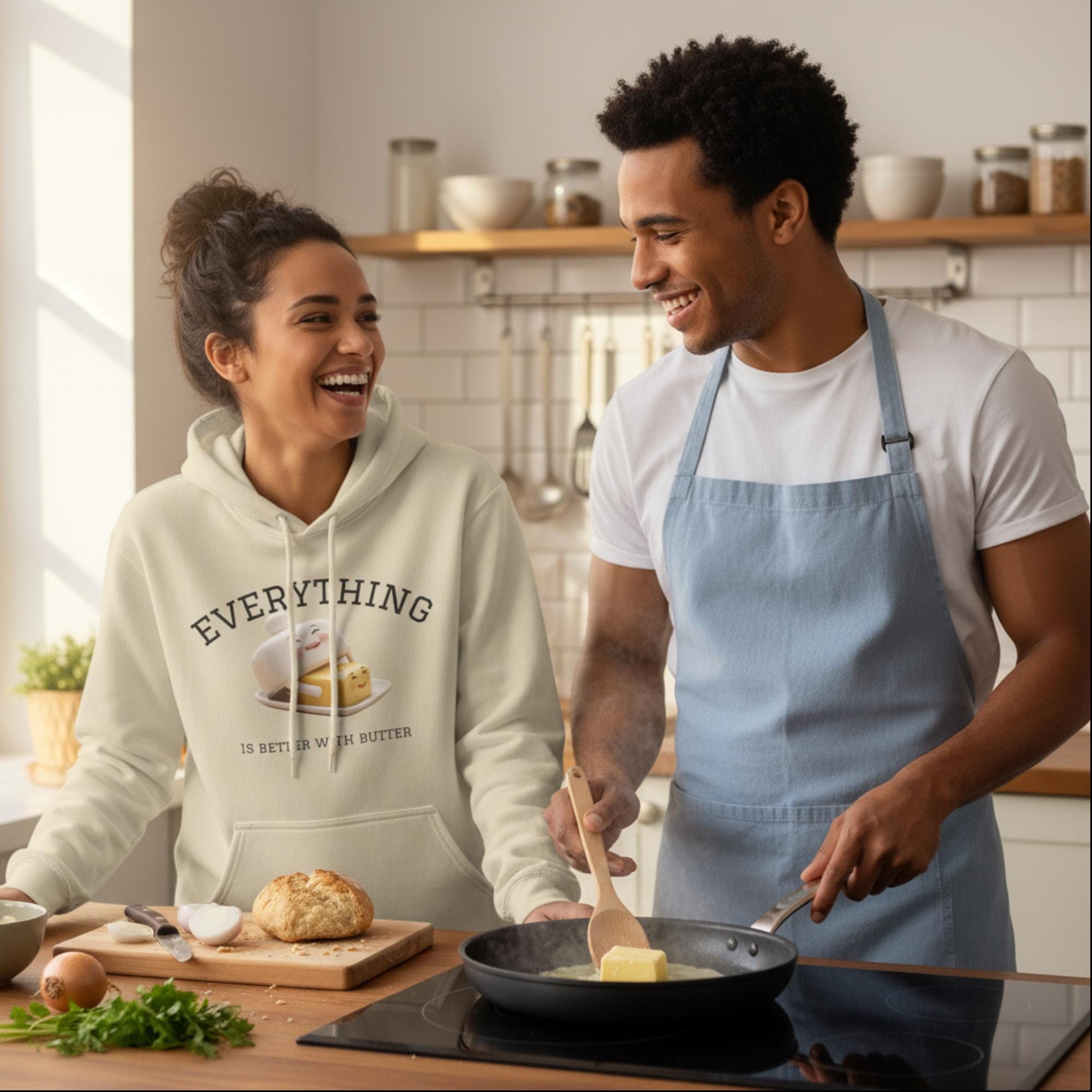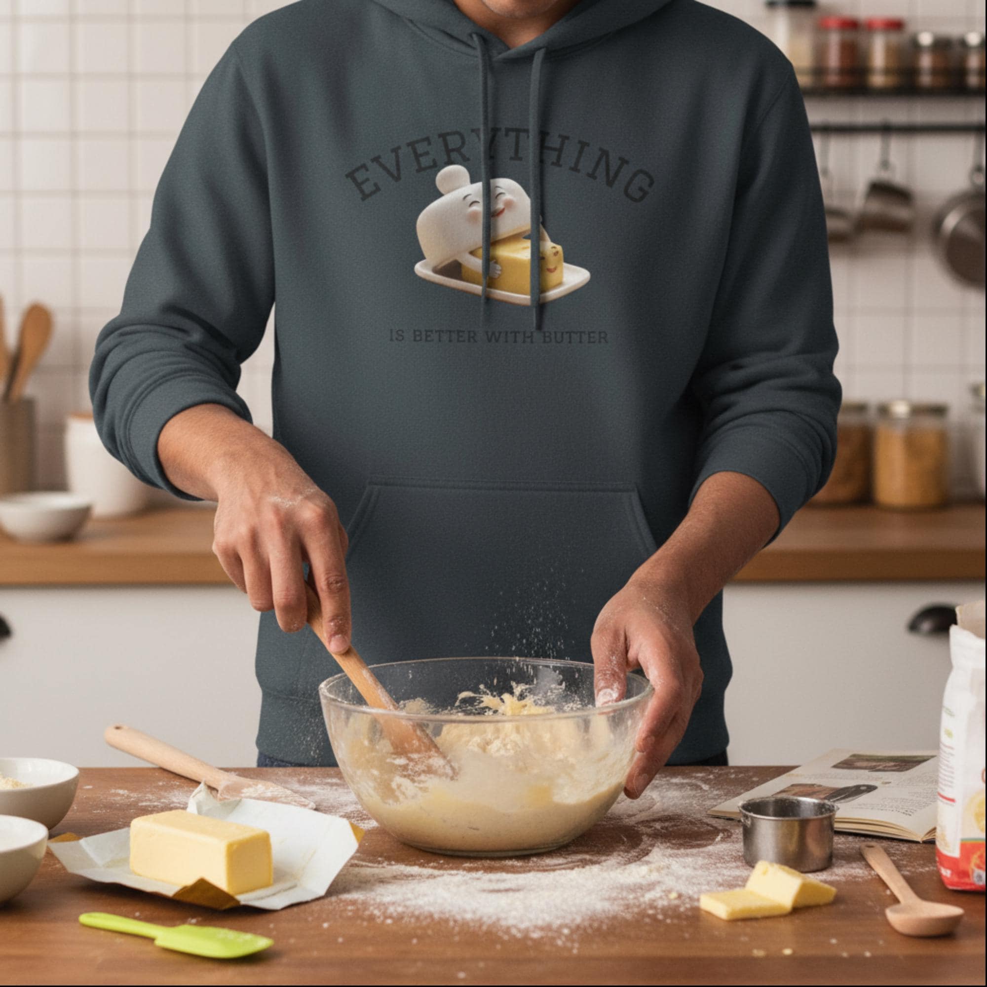 With its playful 3D-style butter dish graphic and the phrase “Everything Is Better With Butter,” this hoodie brings comfort-food energy to your wardrobe. It’s perfect for cooks, bakers, breakfast lovers, and anyone who believes happiness starts with a stick of butter and a good mood.