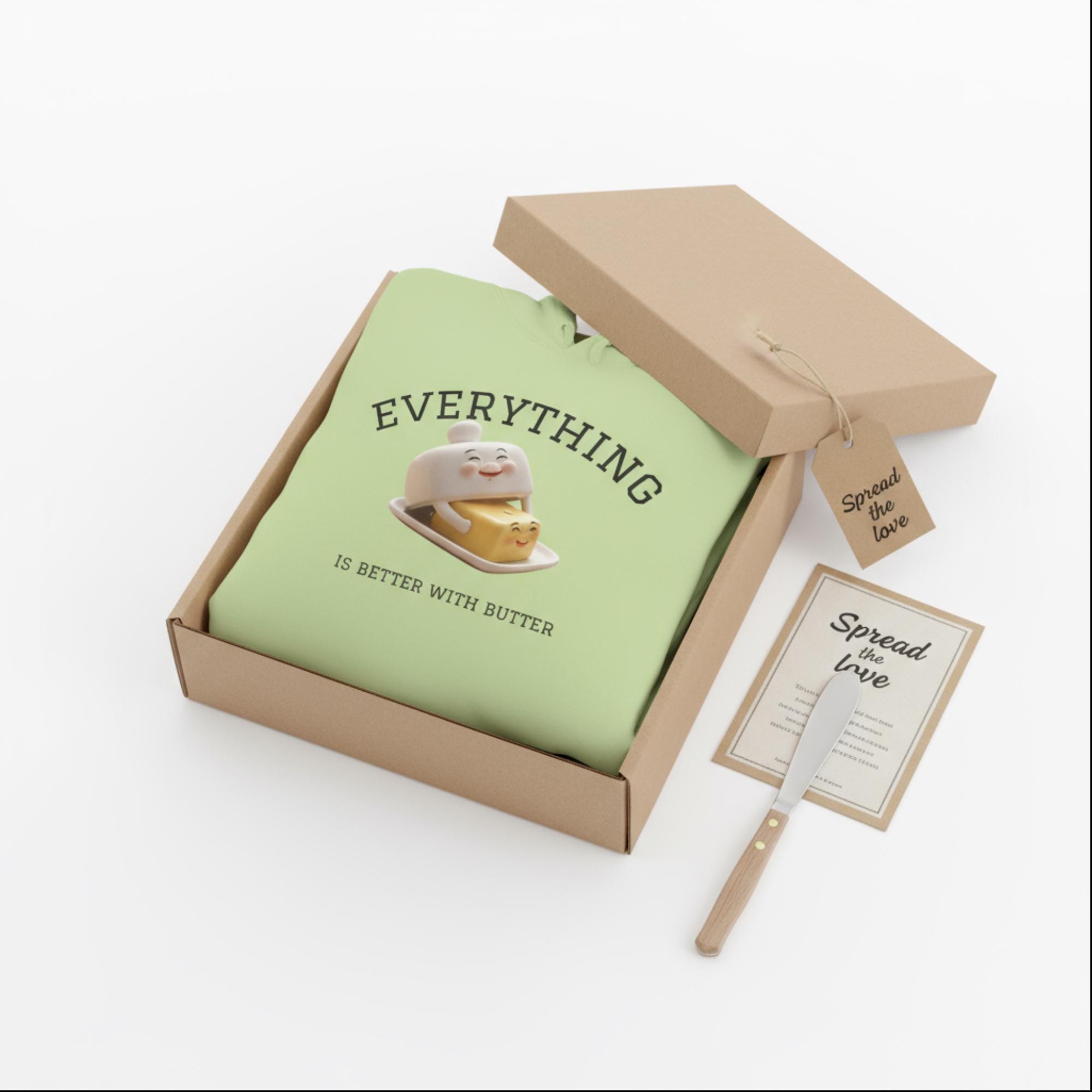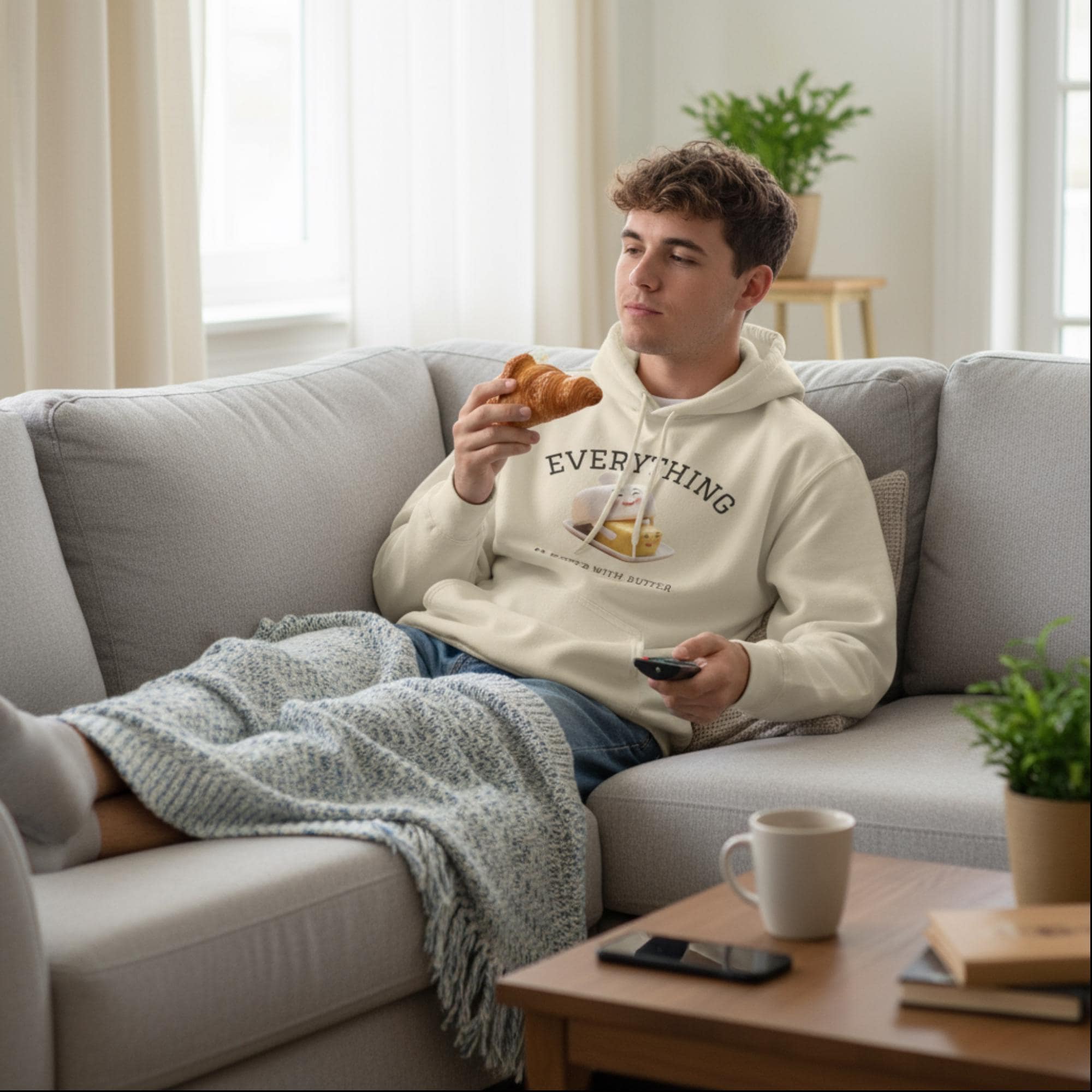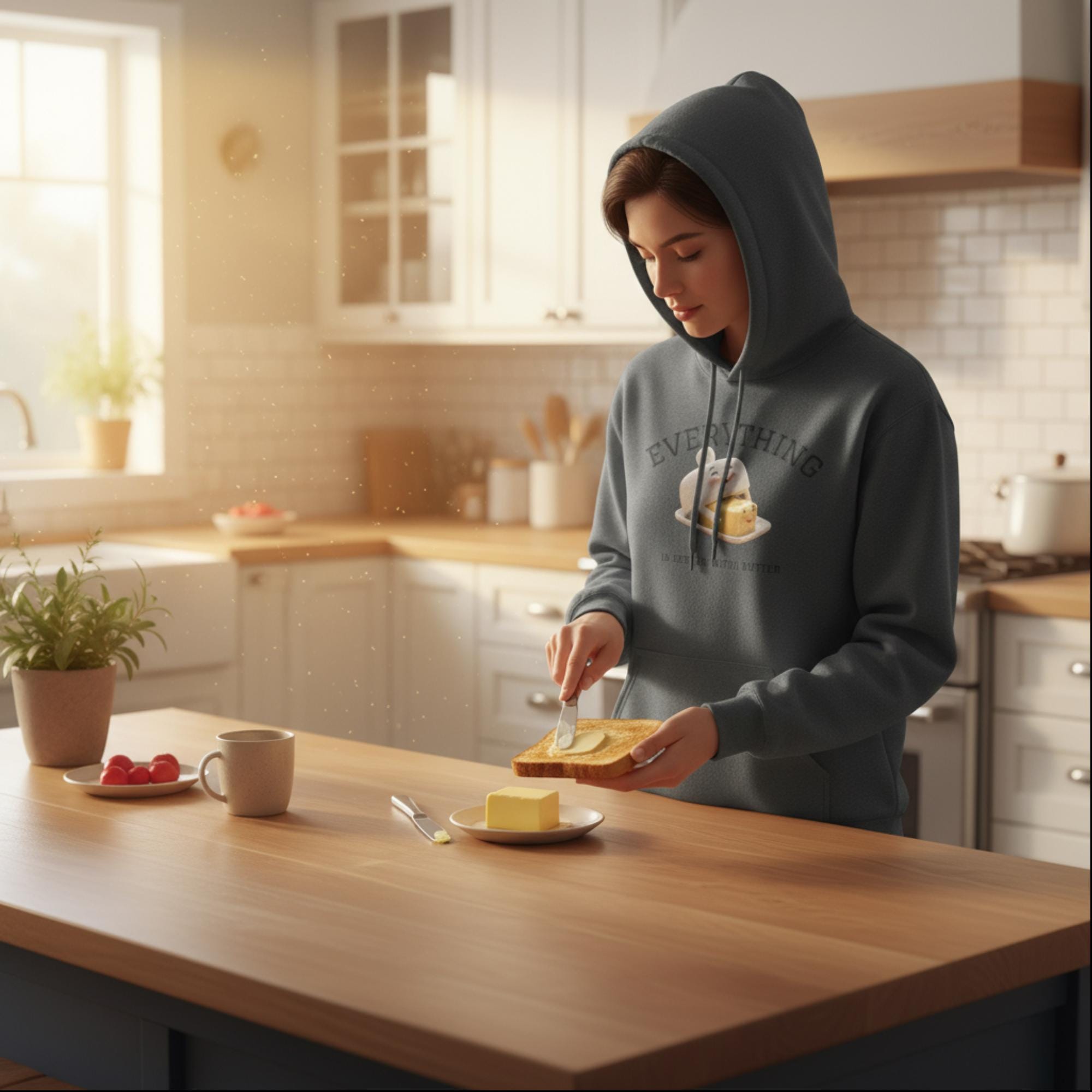 With its playful 3D-style butter dish graphic and the phrase “Everything Is Better With Butter,” this hoodie brings comfort-food energy to your wardrobe. It’s perfect for cooks, bakers, breakfast lovers, and anyone who believes happiness starts with a stick of butter and a good mood.