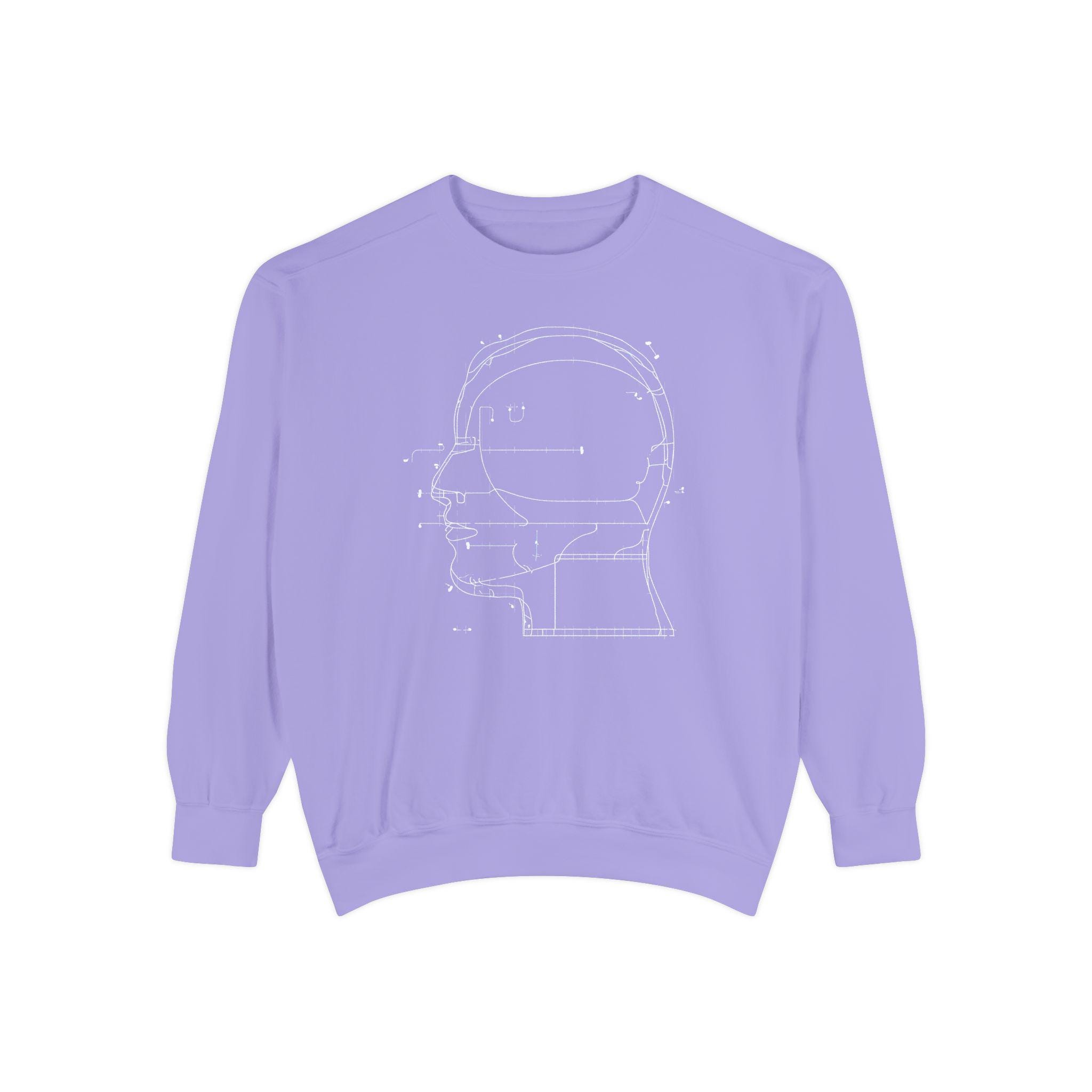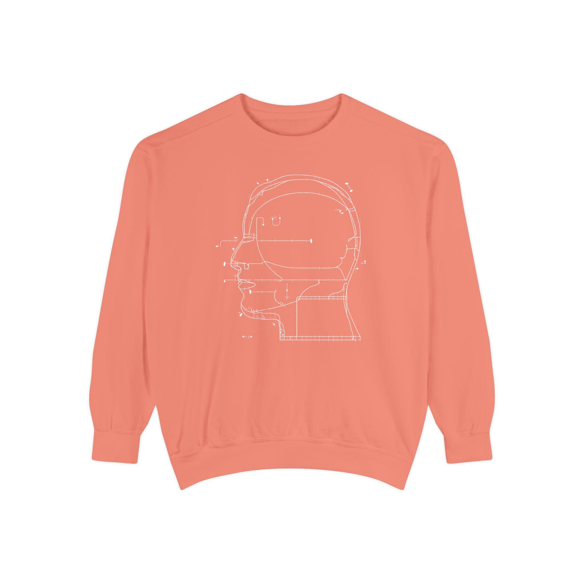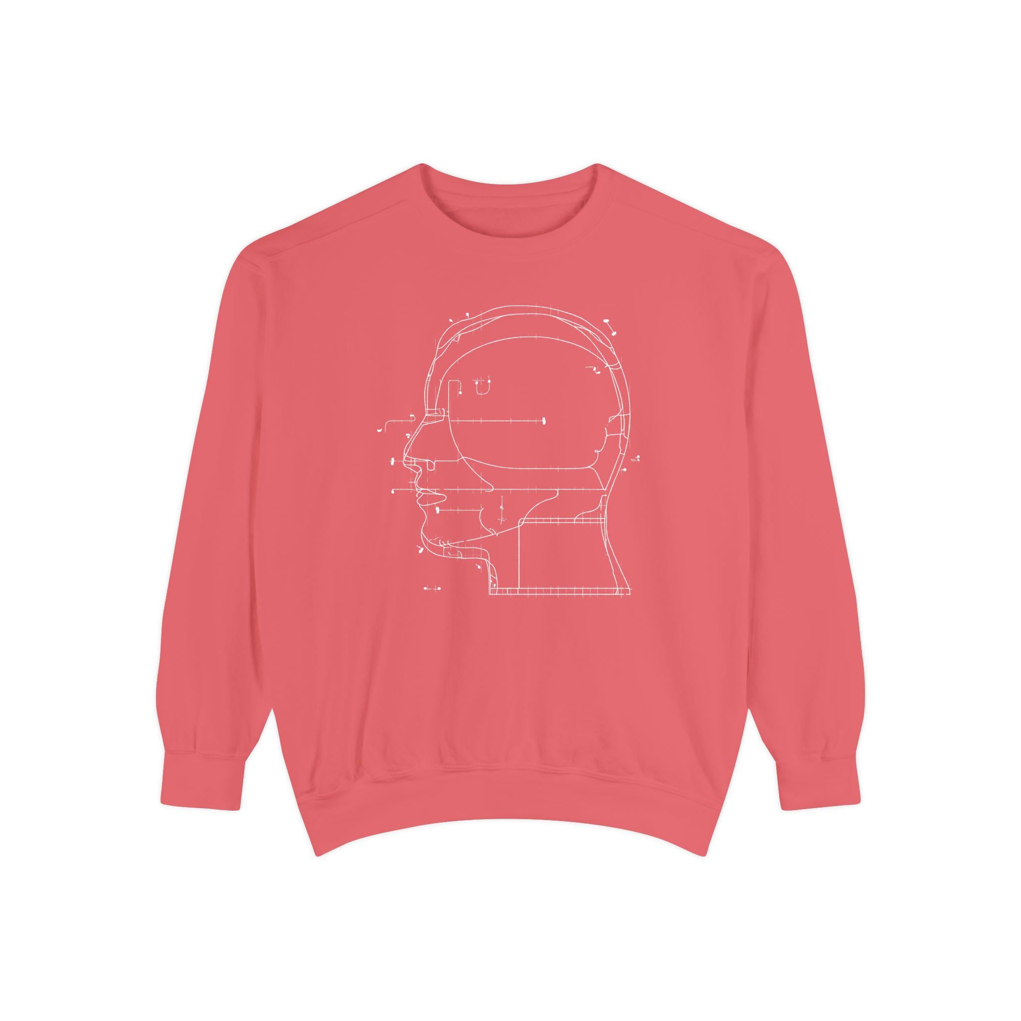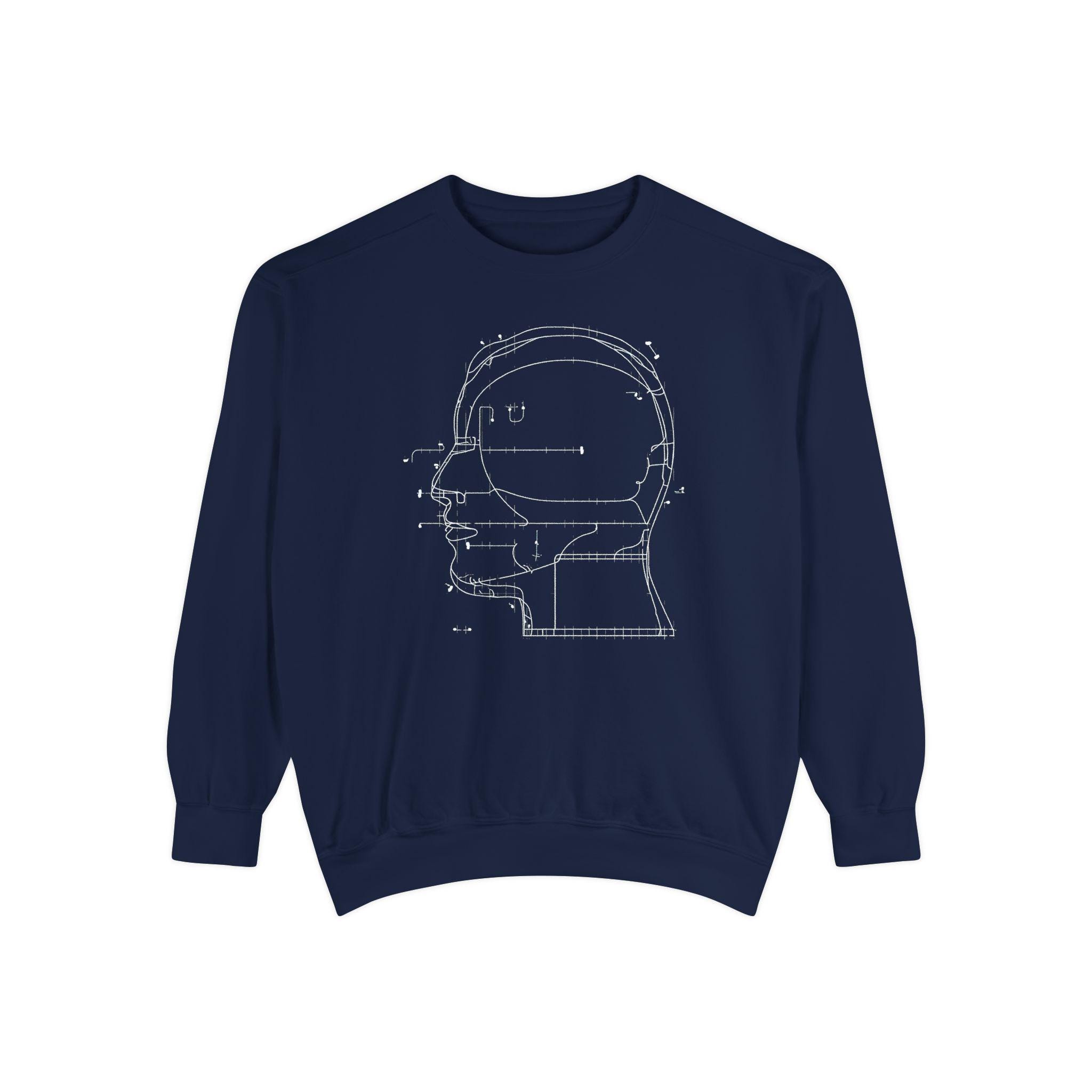 A modern minimalist sweatshirt with a blueprint-style head diagram—perfect for tech lovers, creatives, engineers, and anyone obsessed with the intersection of art + ideas.