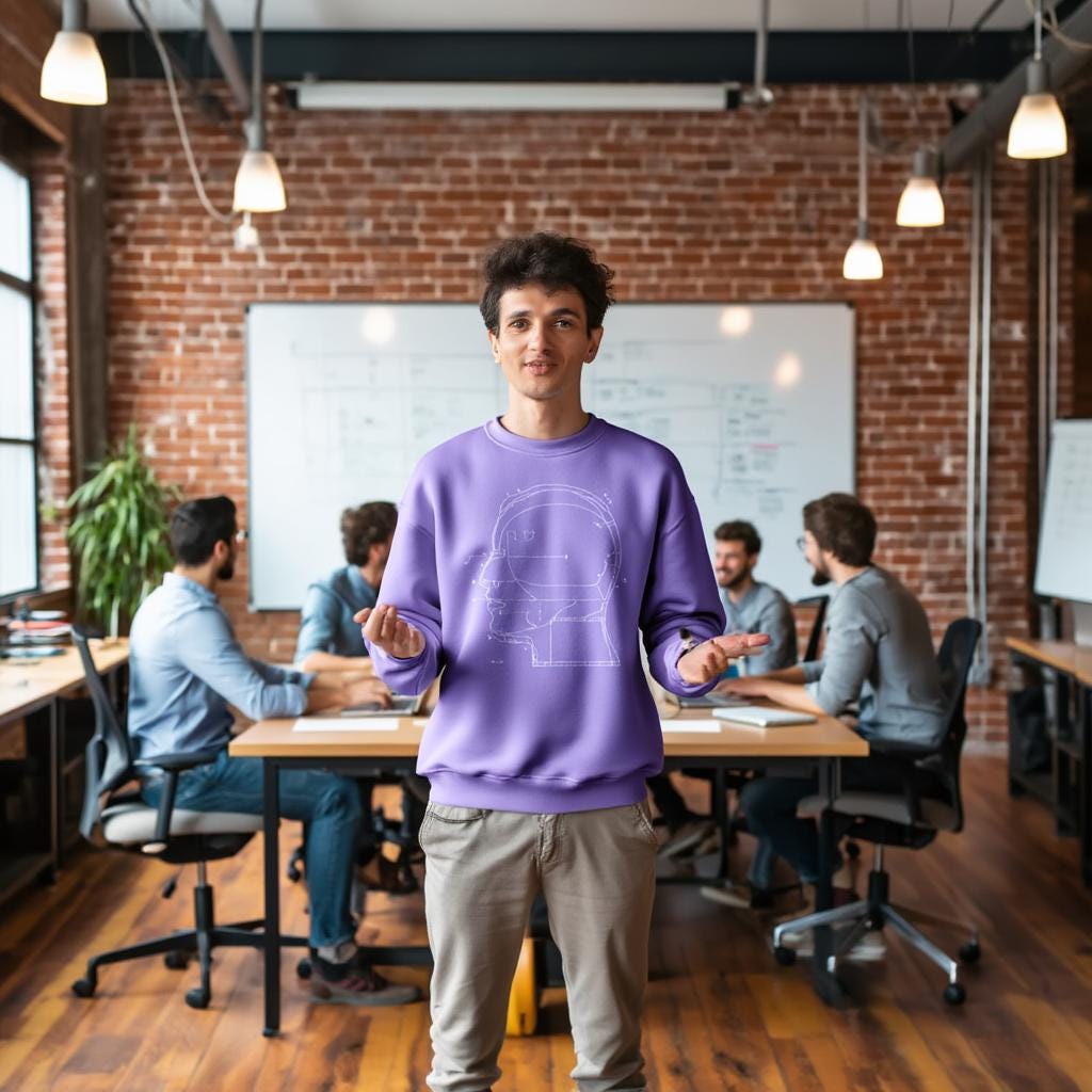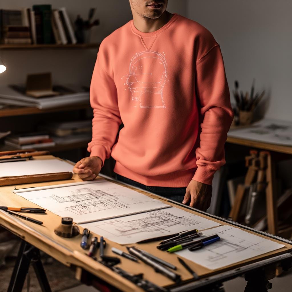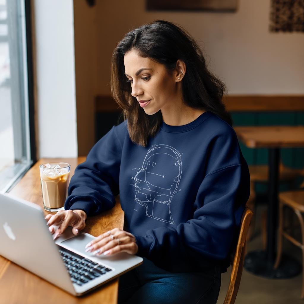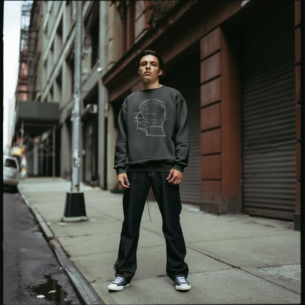 A modern minimalist sweatshirt with a blueprint-style head diagram—perfect for tech lovers, creatives, engineers, and anyone obsessed with the intersection of art + ideas.