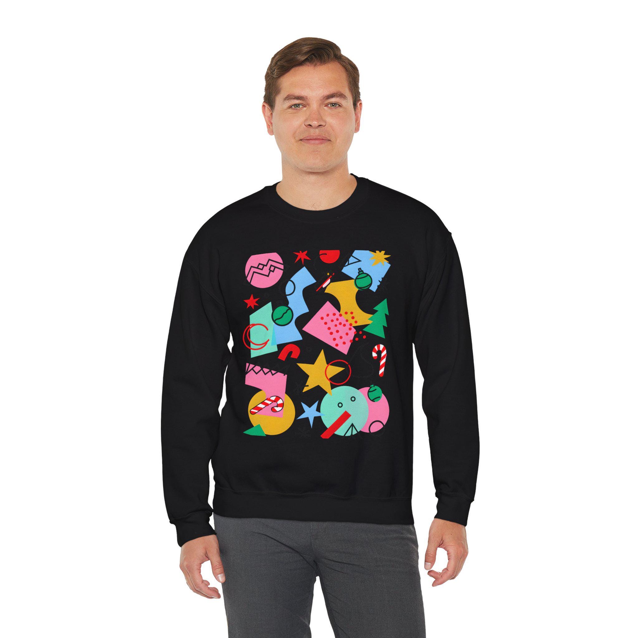 Bring color and personality to the holidays with this abstract Christmas graphic sweatshirt. Fun geometric shapes, candy canes, ornaments, stars, and a playful snowman come together in a bold modern print. It’s the perfect holiday sweatshirt for people who prefer stylish and artsy over cheesy and traditional.