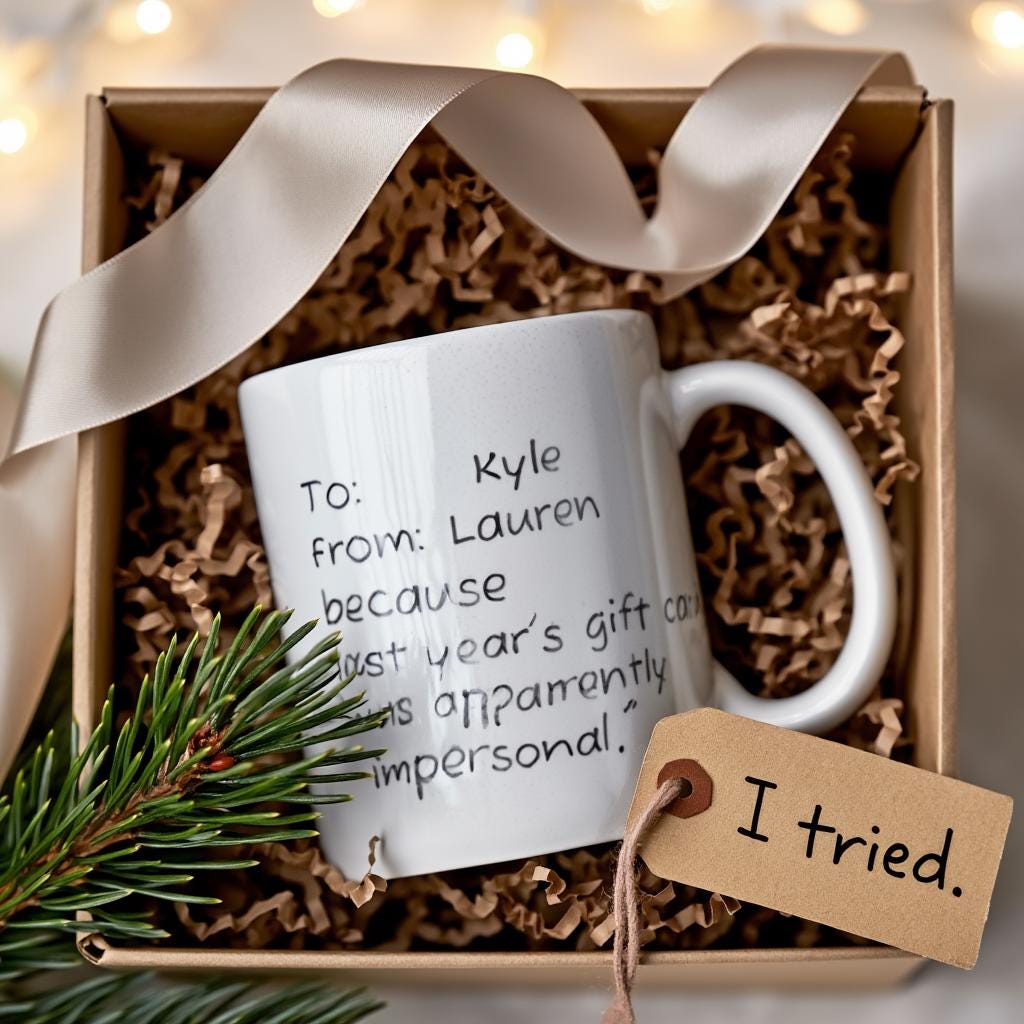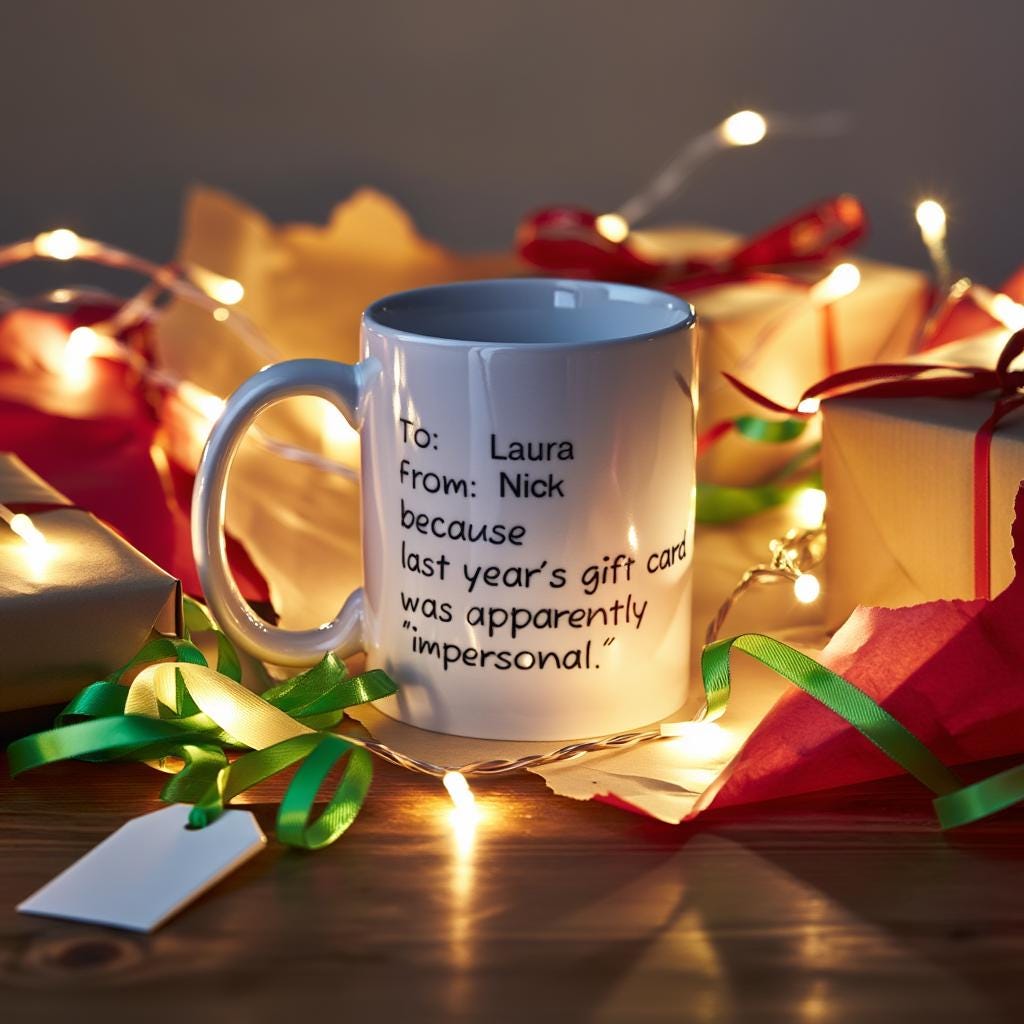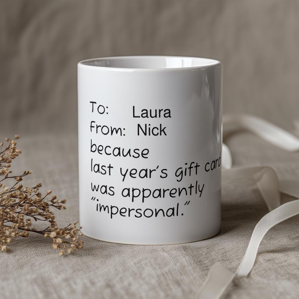 To: {Name} “From: {Name} — because last year’s gift card was apparently ‘impersonal.’”