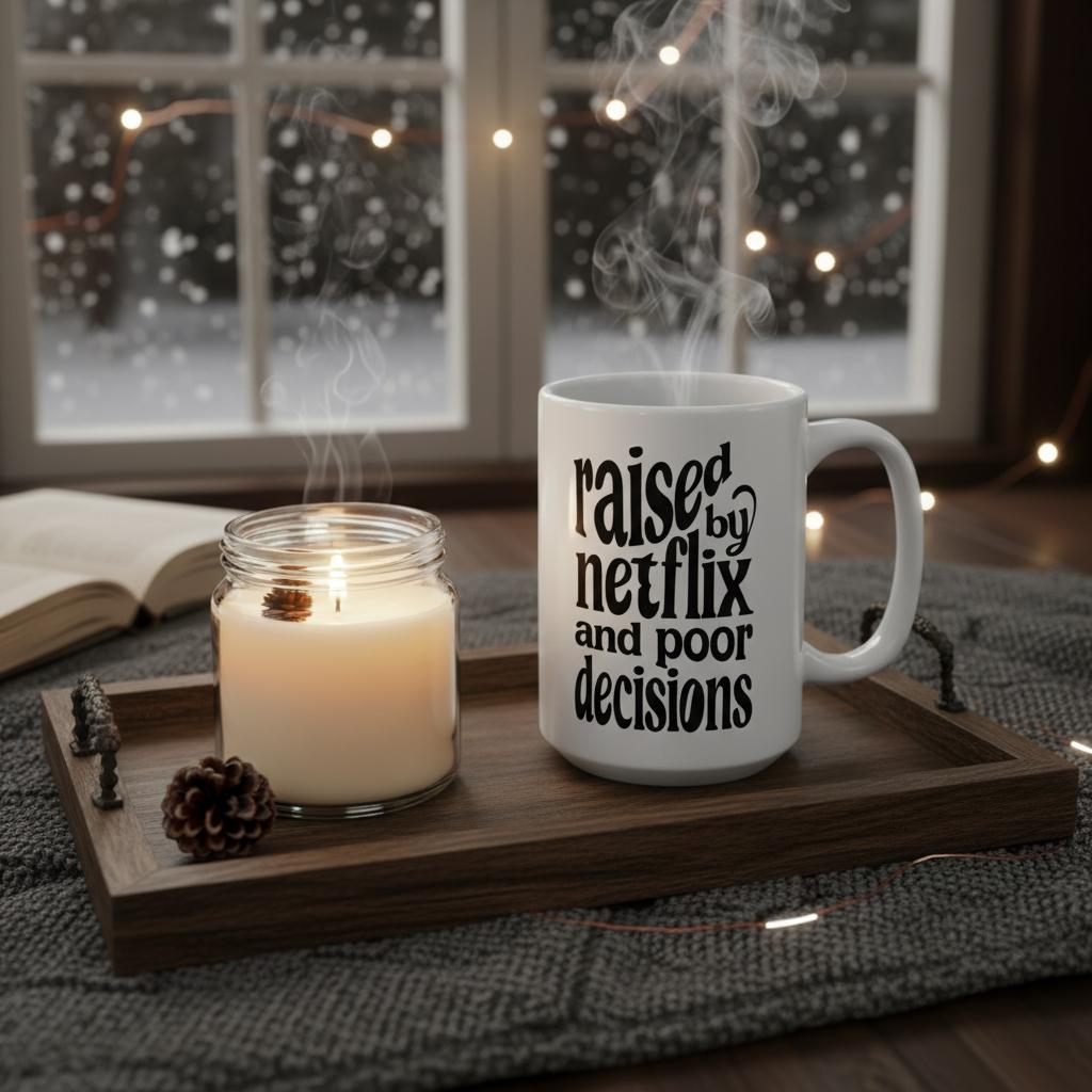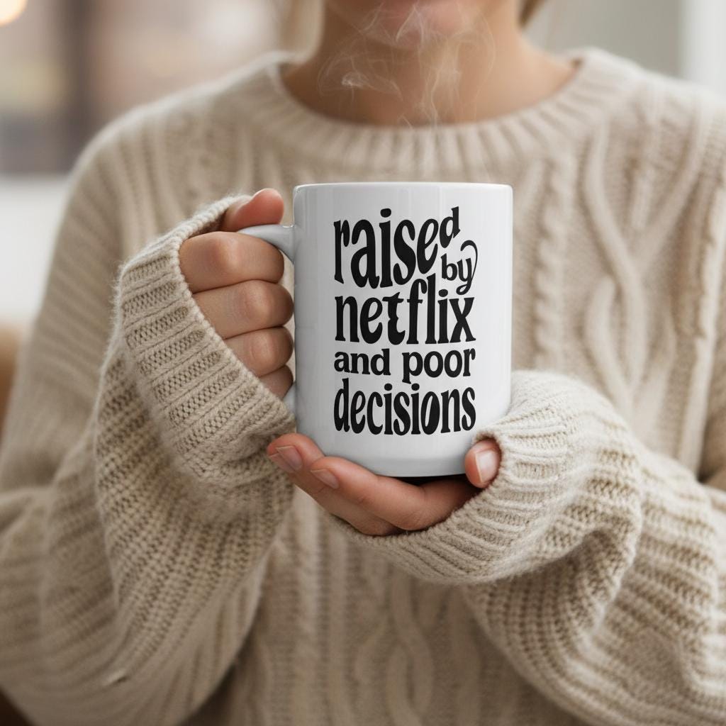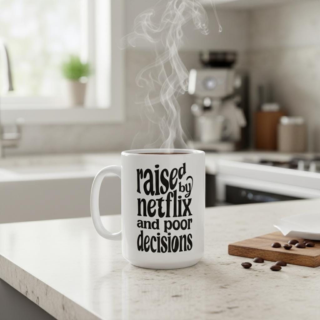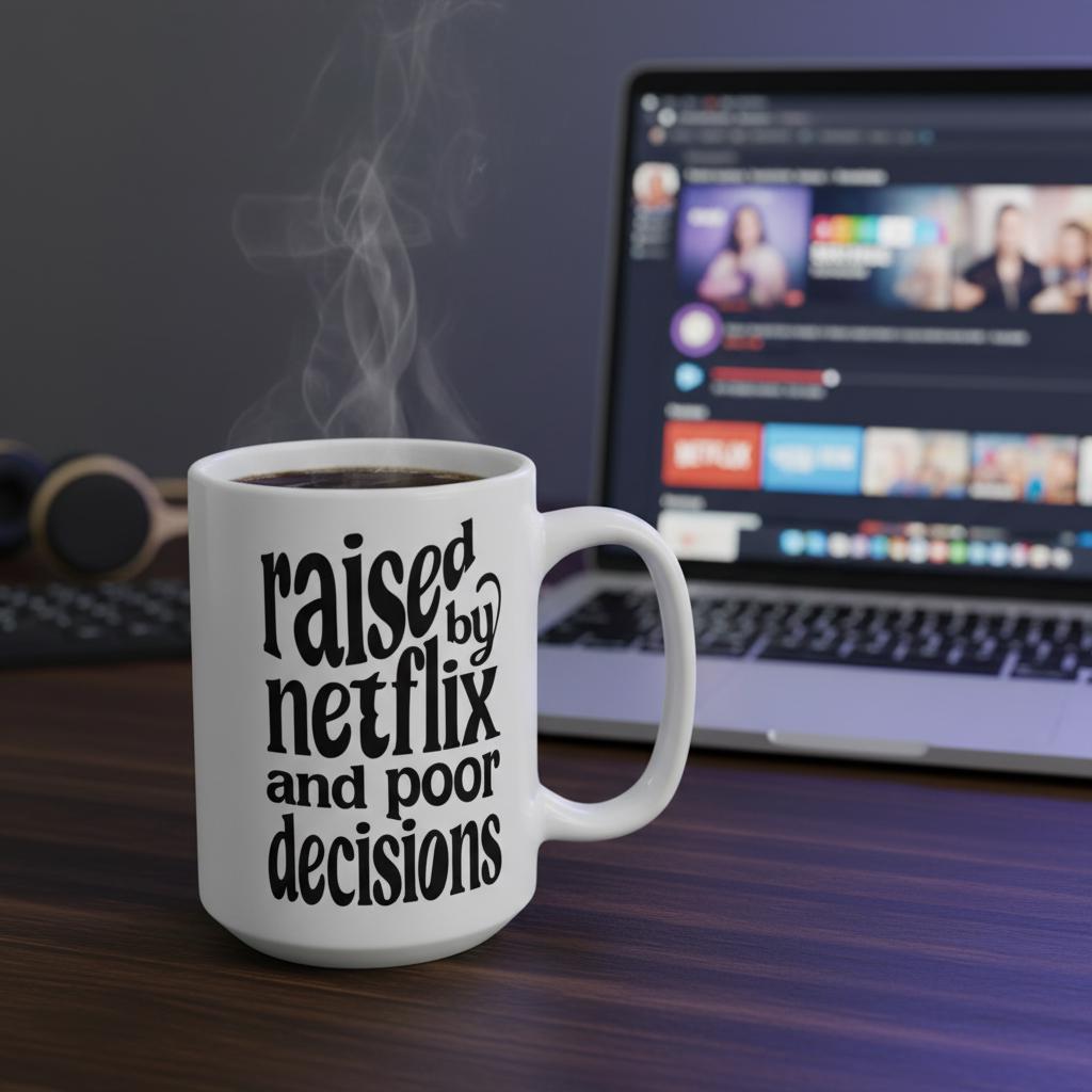 “Raised By Netflix and Poor Decisions” is the ultimate mug for the binge-watcher, the chaotic friend, the sleep-deprived adult, and the girl who has been in her comfort show era since 2014. Bold, clean, and unhinged in the most lovable way, this mug brings premium sarcasm to every sip.