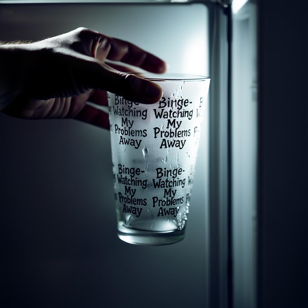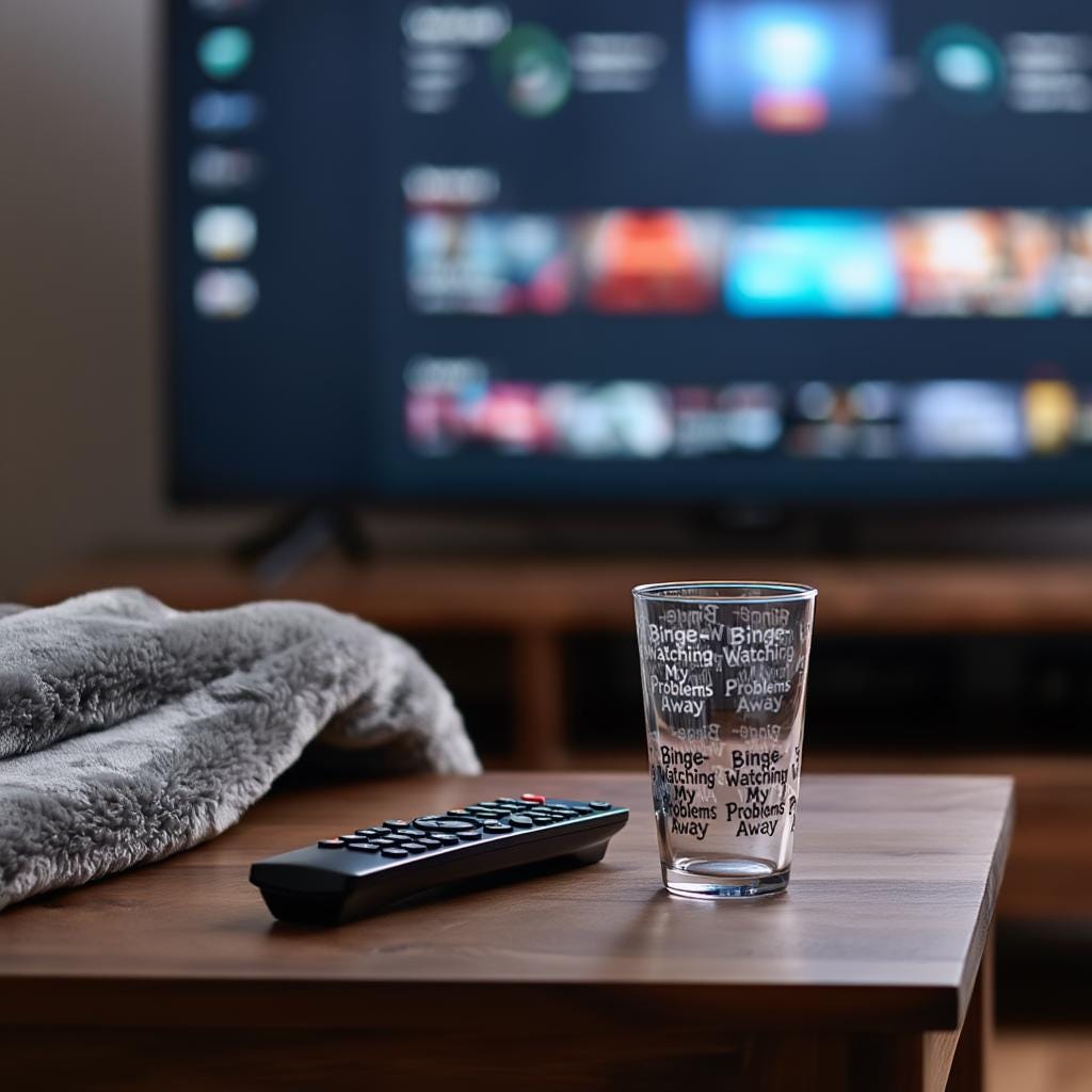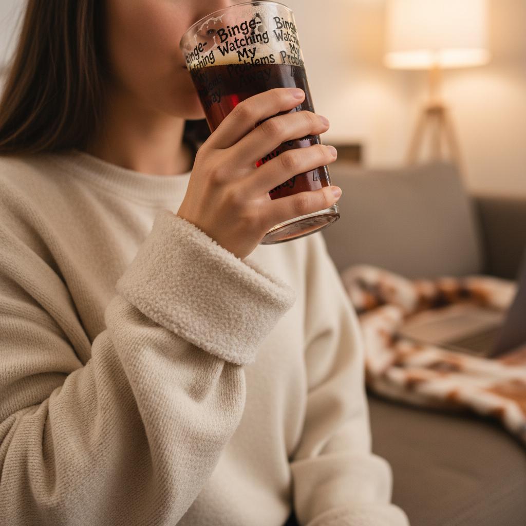 “Binge-Watching My Problems Away” is the official pint-glass for people who cope with chaos by pressing “Next Episode” repeatedly — iced coffee in the morning, mocktails in the afternoon, emotional-support cocktails at night.