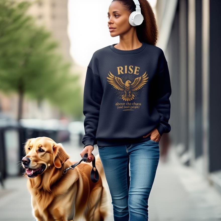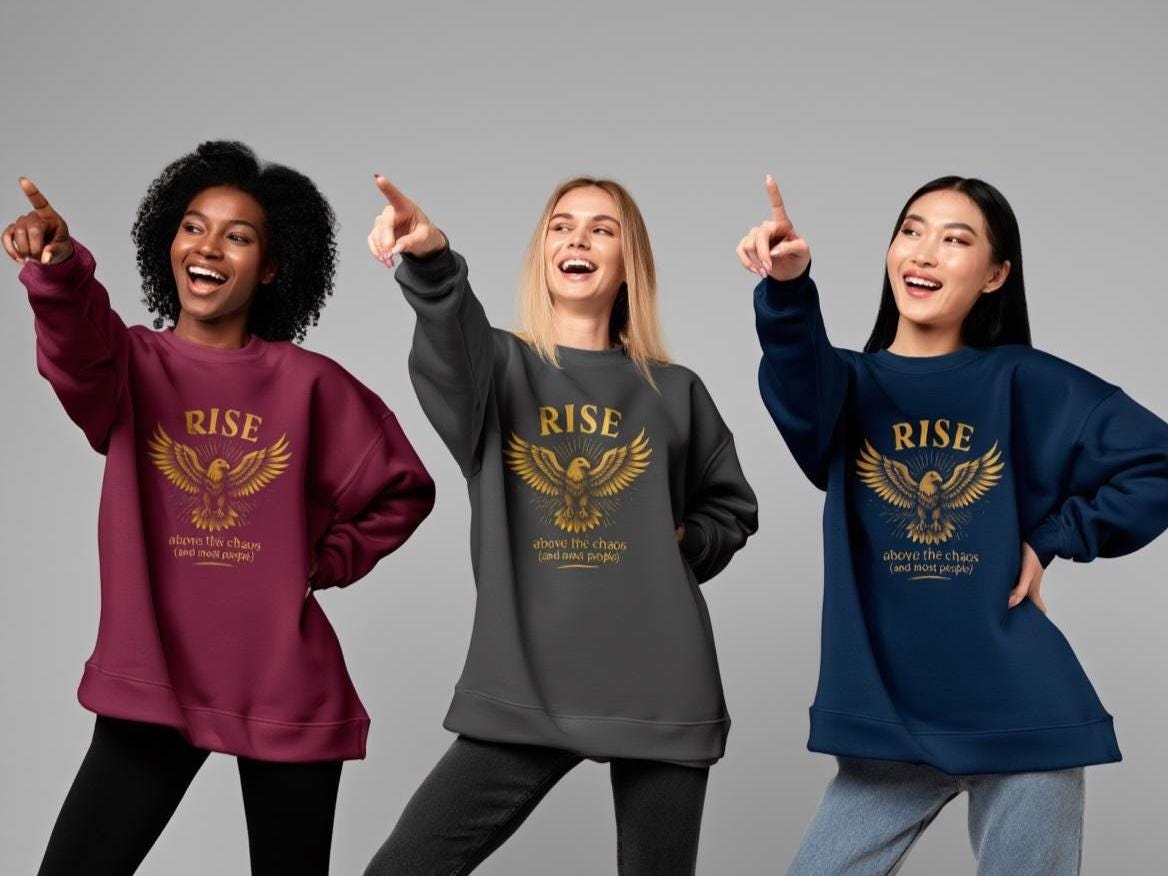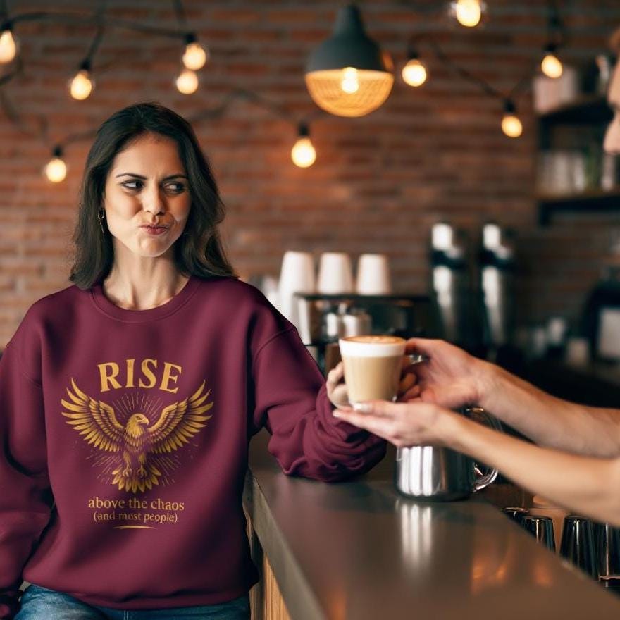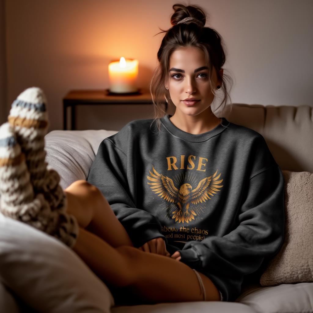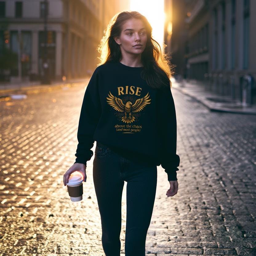 Meet RISE — above the chaos (and most people), the golden-eagle graphic designed for anyone who’s mastered the art of calm detachment and selective socializing.