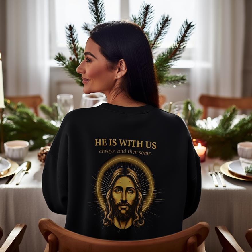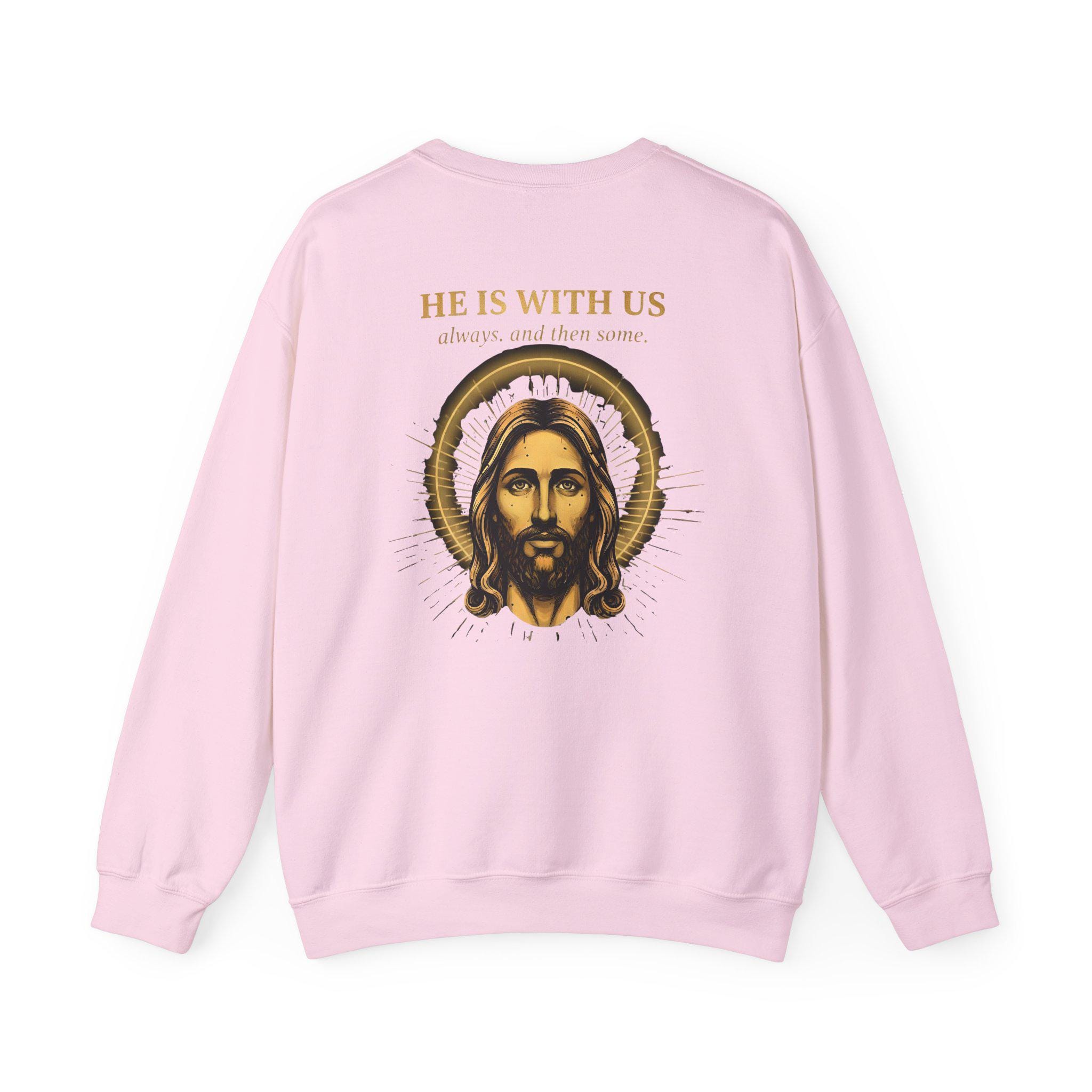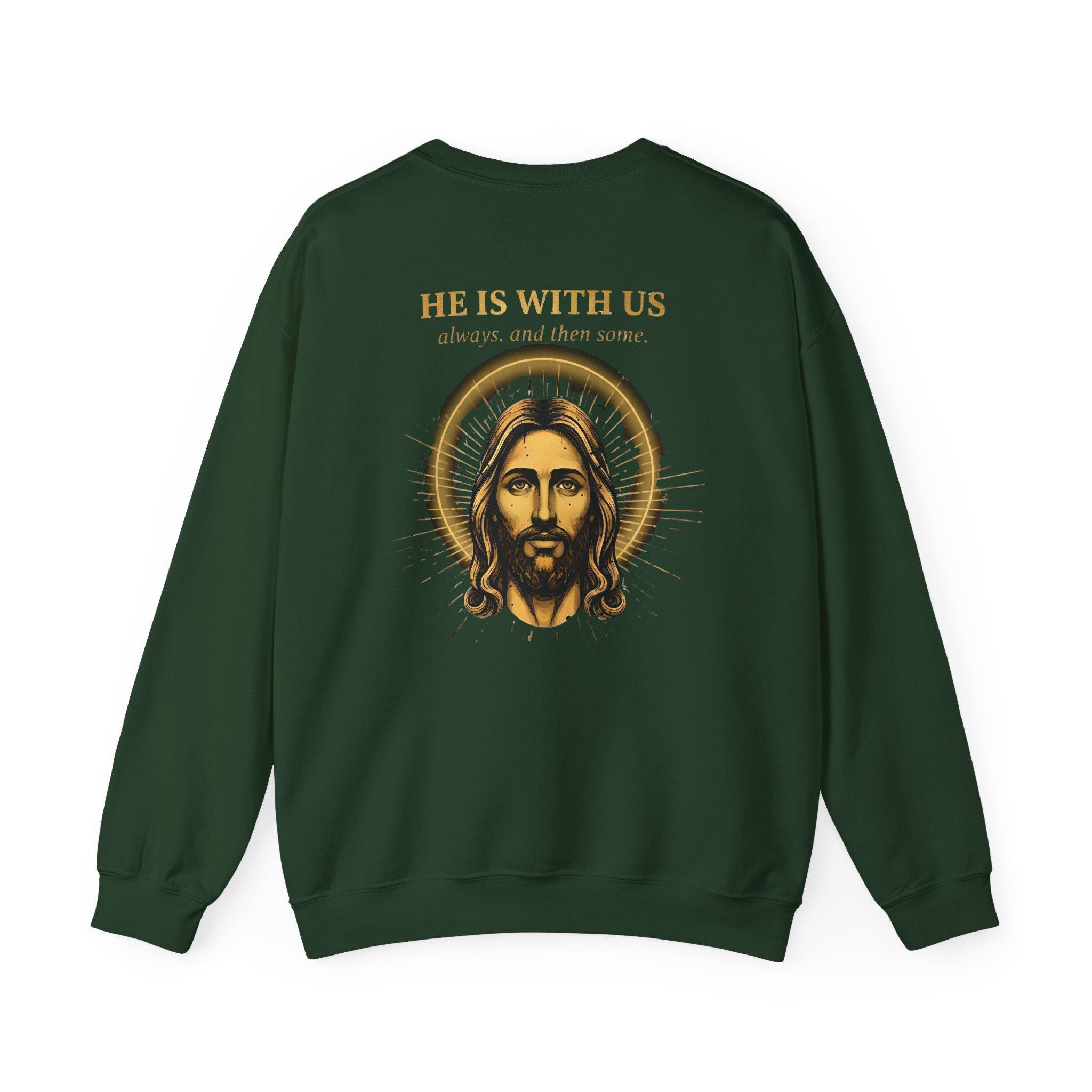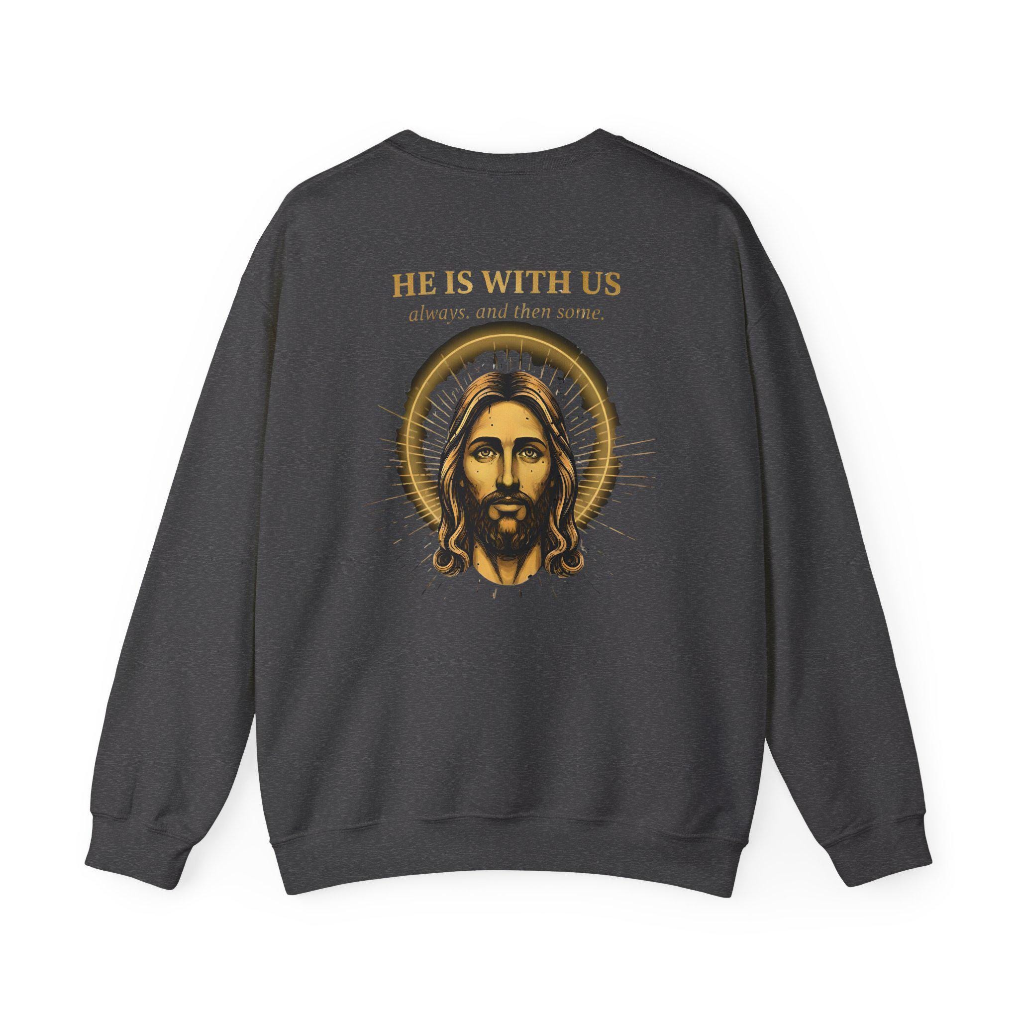 Jesus Sweatshirt • He Is With Us Always And Then Some • Christian Gift • Vintage Gold Halo Back Print • Faith Crewneck • Gildan 18000 Unisex