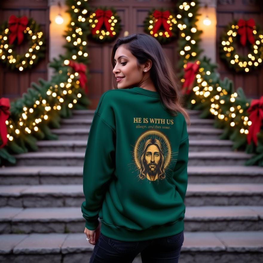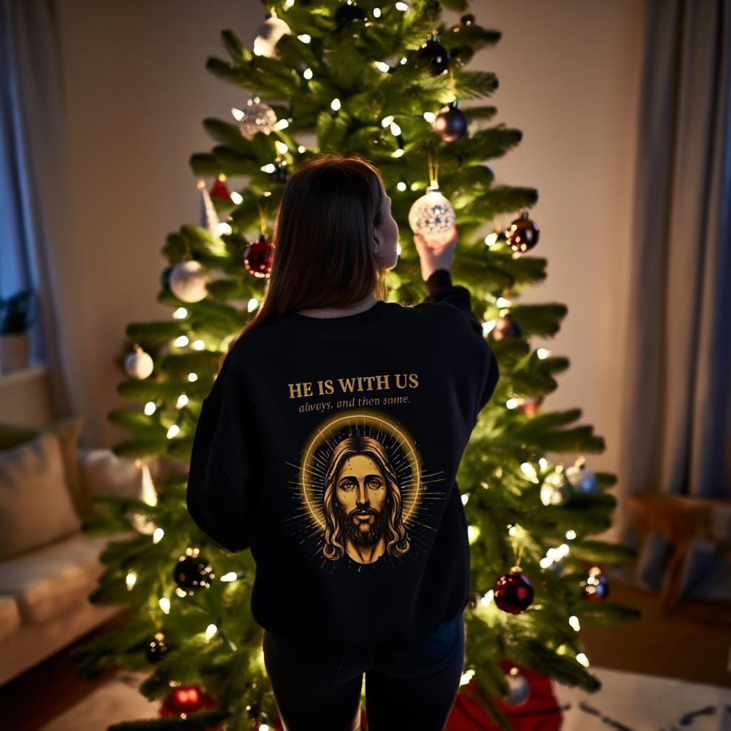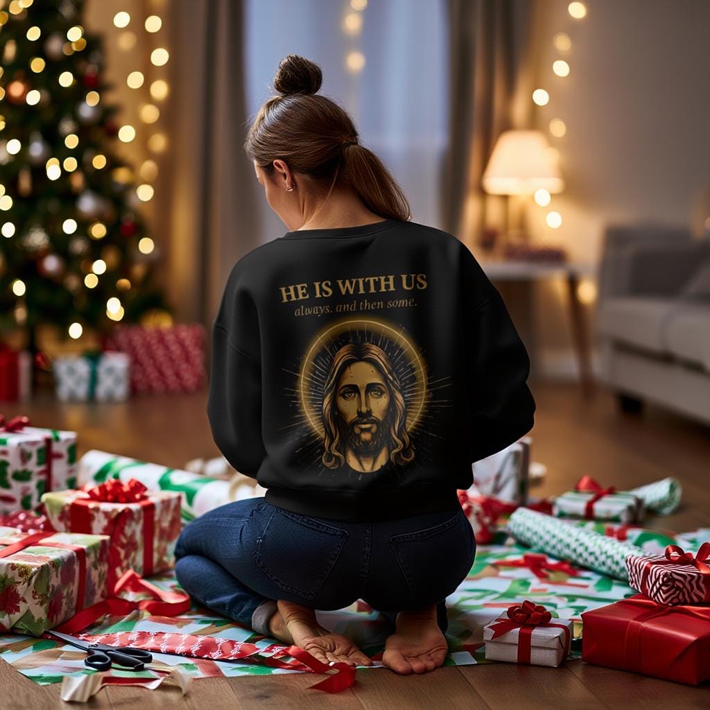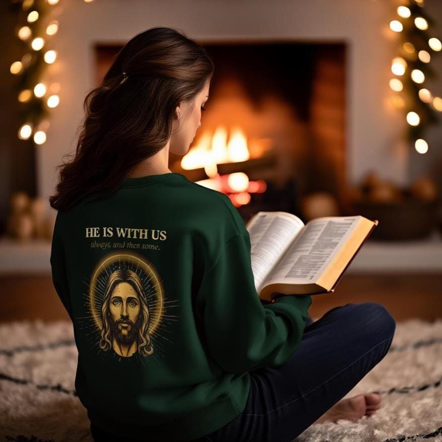 Jesus Sweatshirt • He Is With Us Always And Then Some • Christian Gift • Vintage Gold Halo Back Print • Faith Crewneck • Gildan 18000 Unisex